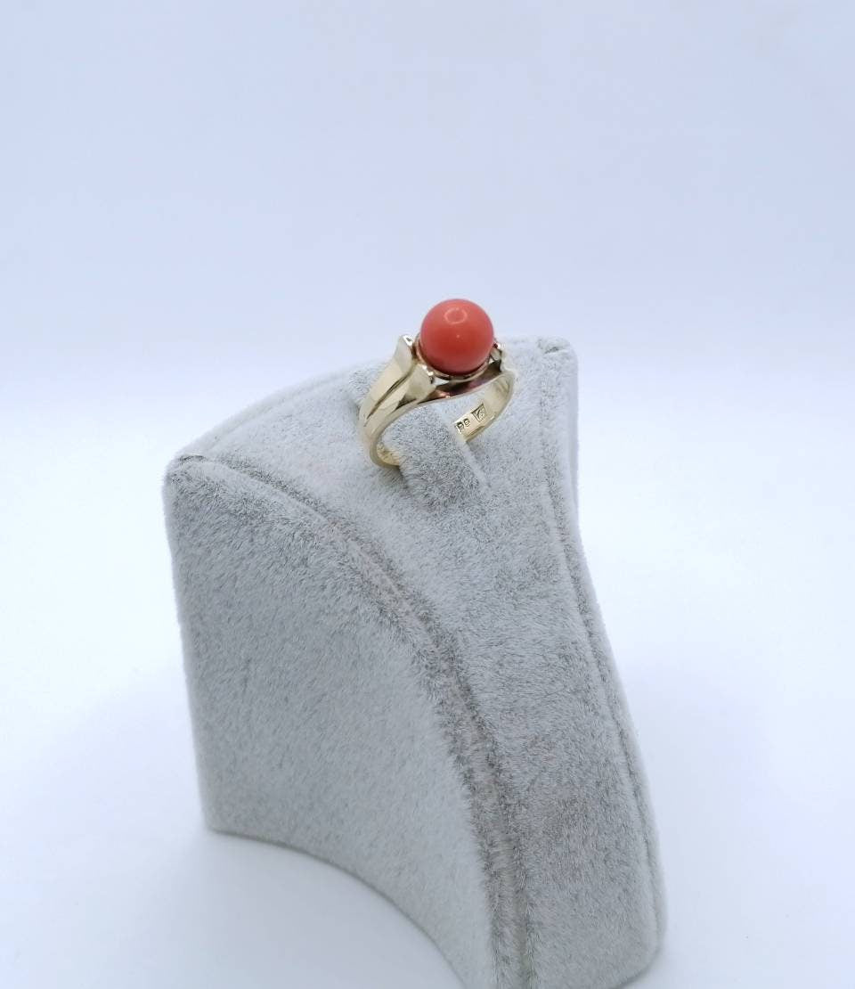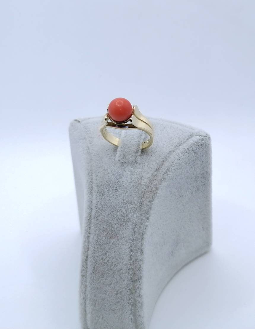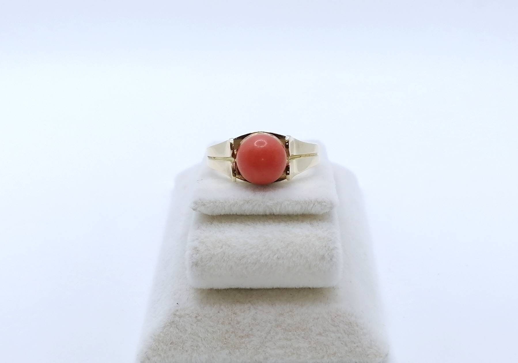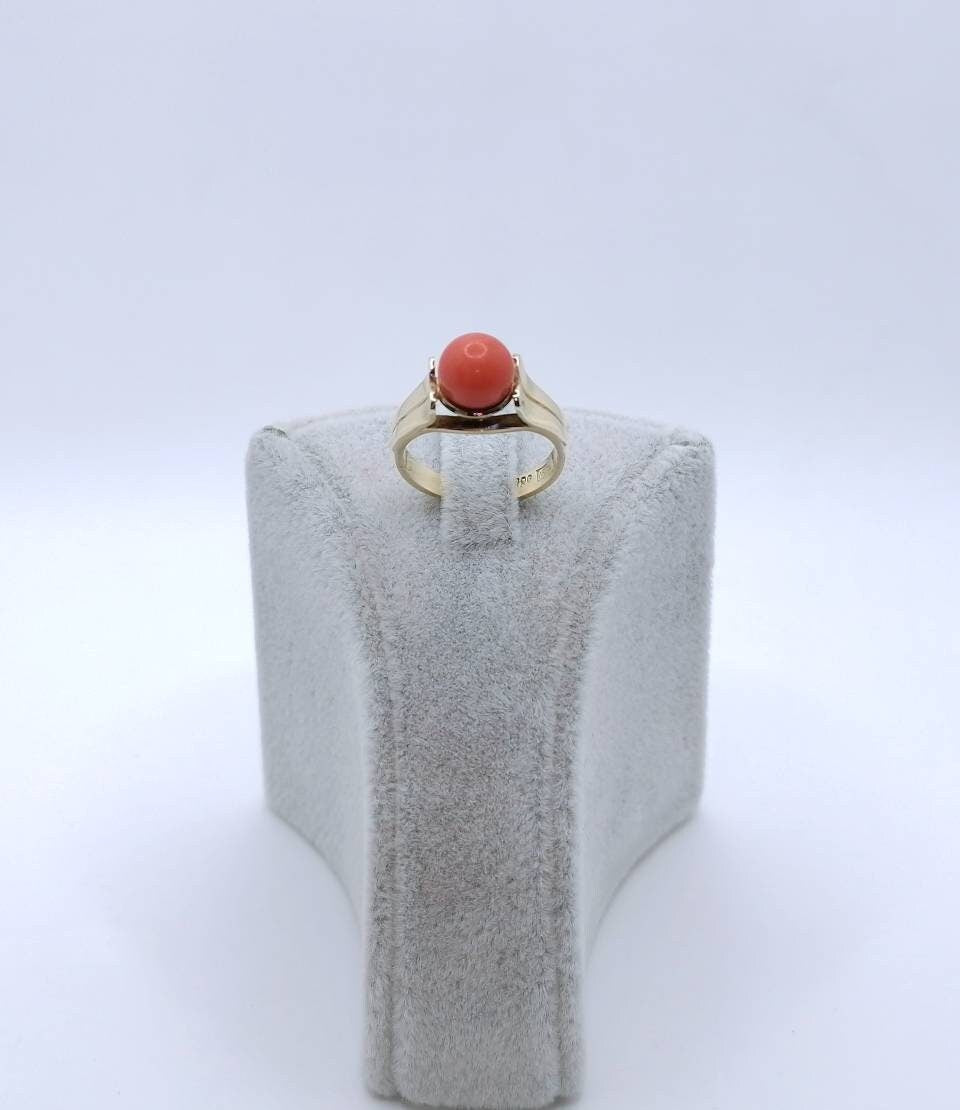 Vintage Damenring verziert mit einer Koralle. Das Schmuckstück ist aus 585er Gold gefertigt und wartet nun darauf seine neue Besitzerin glücklich zu machen.