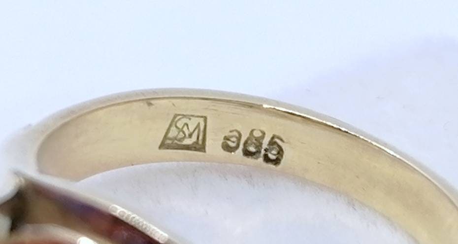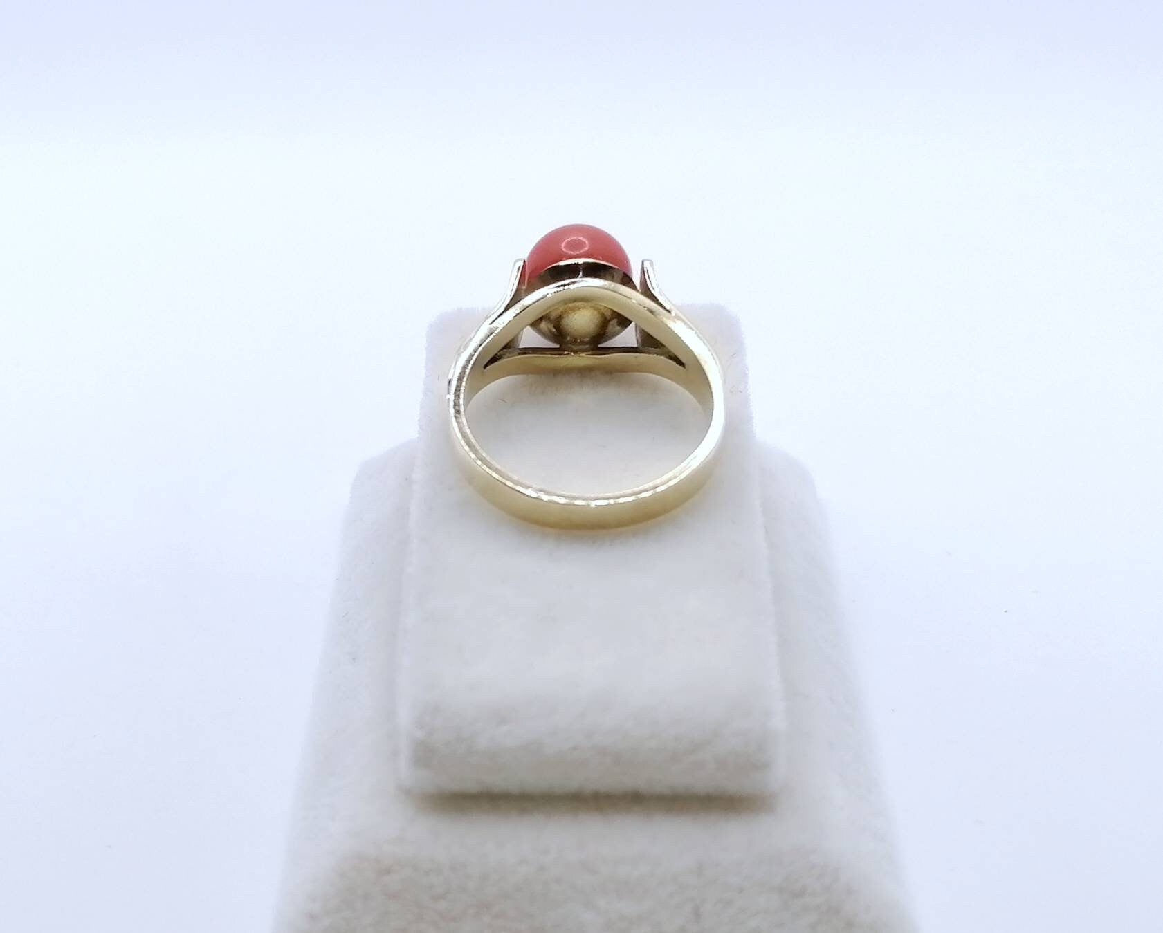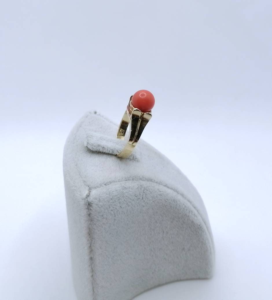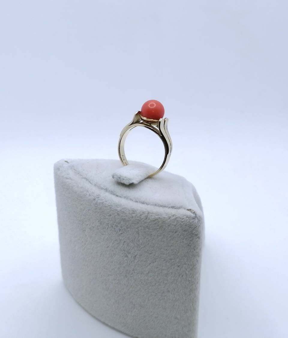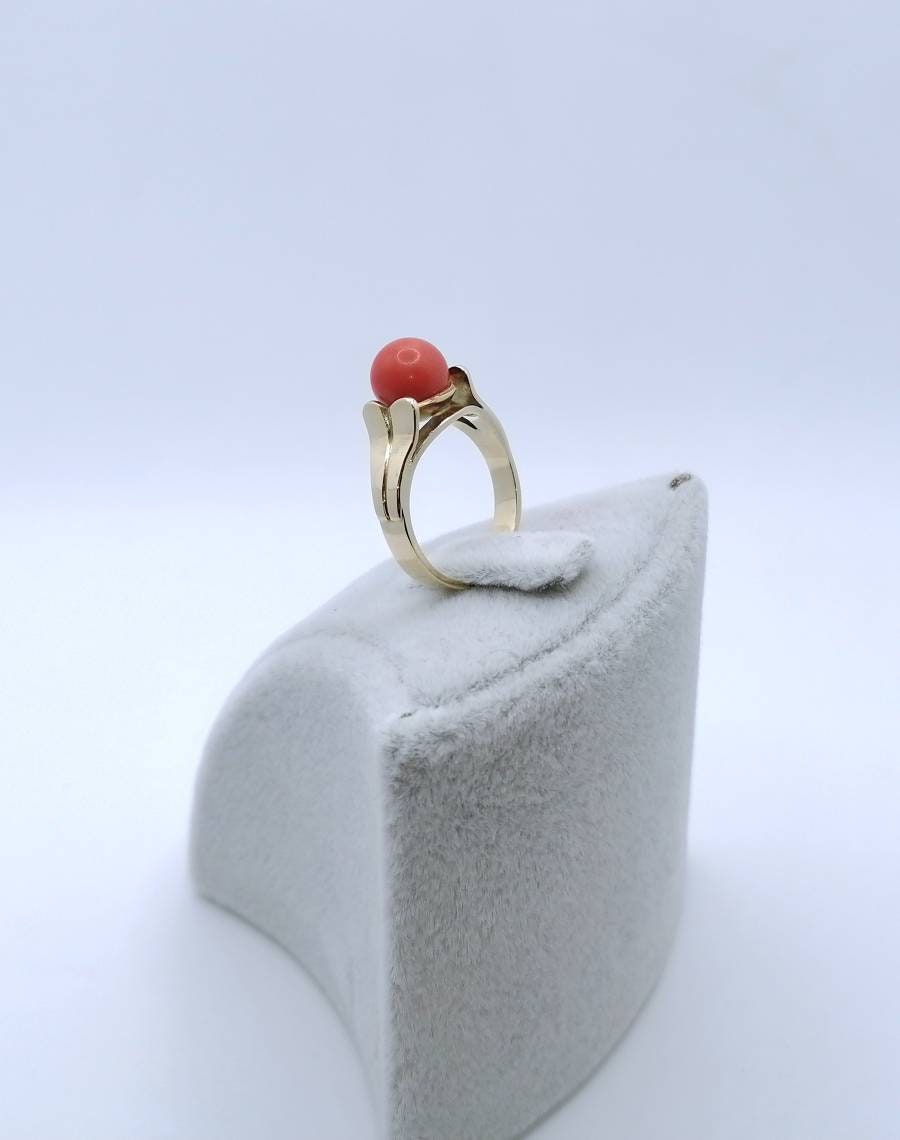 Vintage Damenring verziert mit einer Koralle. Das Schmuckstück ist aus 585er Gold gefertigt und wartet nun darauf seine neue Besitzerin glücklich zu machen.