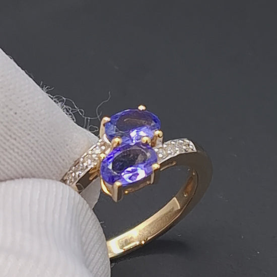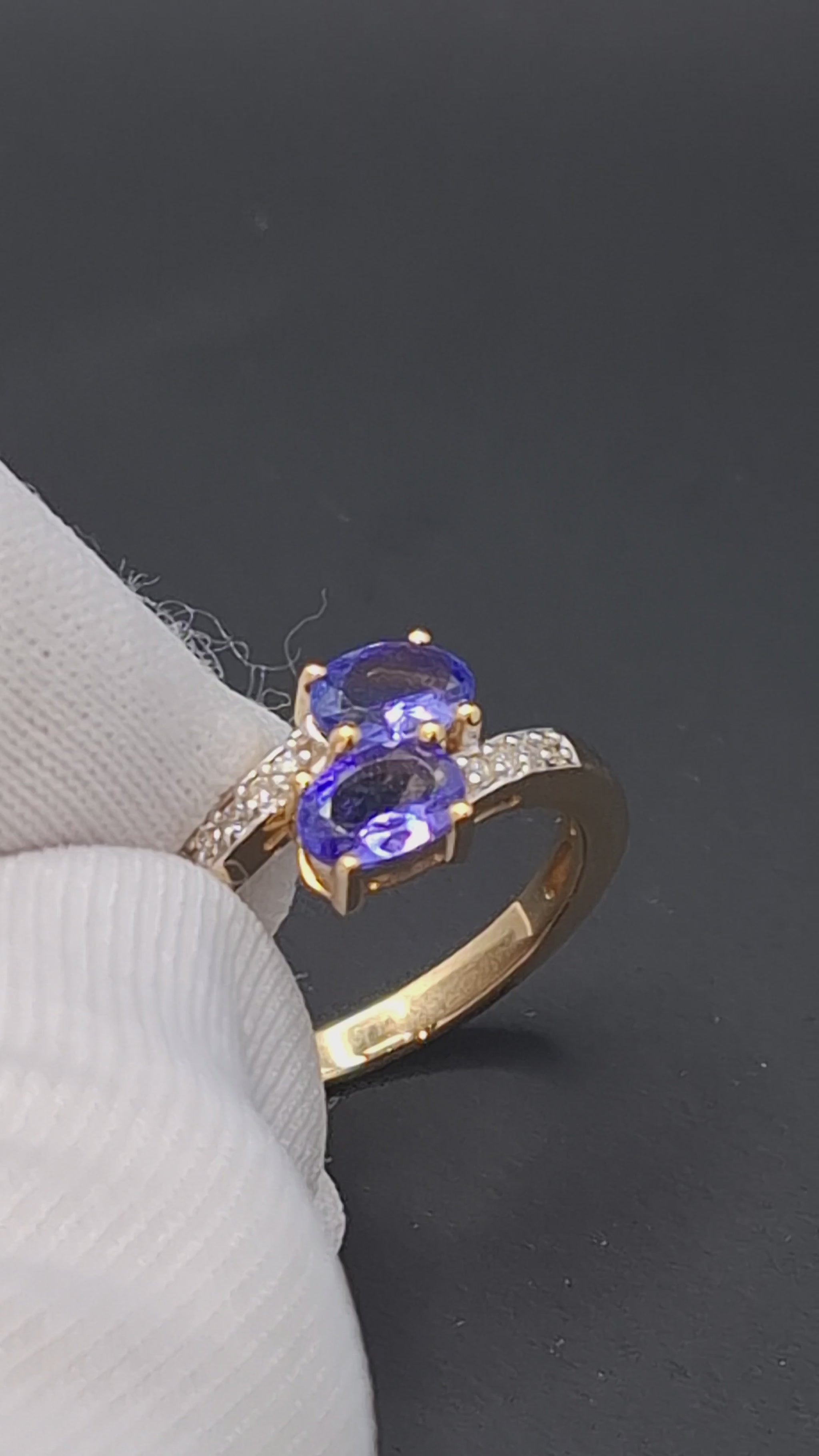 Neuwertiger Gold Damenring mit zwei Tansanit Edelsteinen und funkelnden Brillanten. Das Schmuckstück ist aus 750er 18 karat Gelbgold gefertigt.