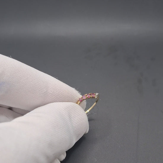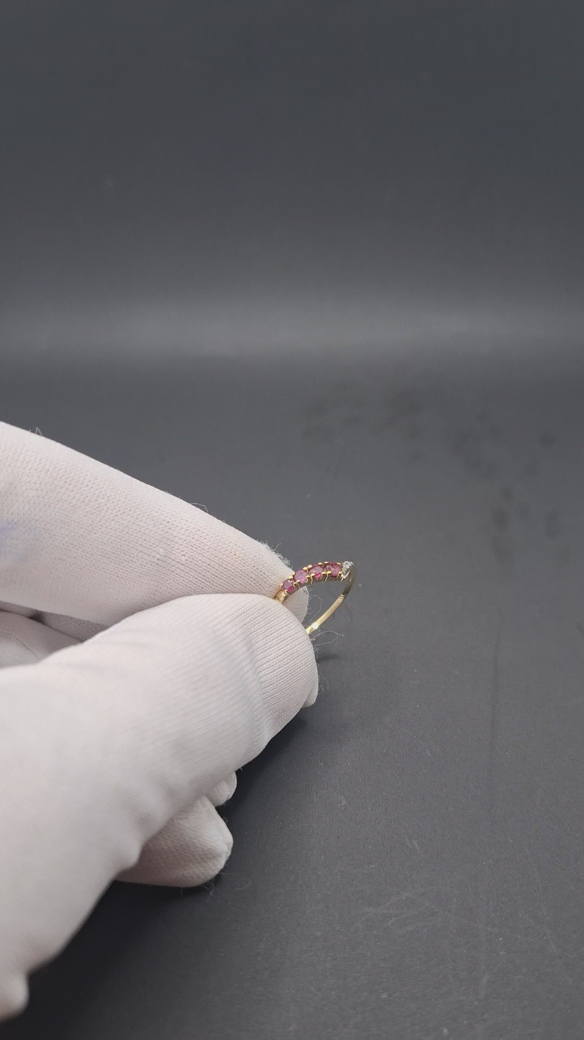 Zarter Gold Damenring mit Rubinen und Diamantsplitter. Das Schmuckstück ist aus 333er 8 karat Gelbgold gefertigt. Die Ringkrone ist teils aus Weißgold gefertigt.
