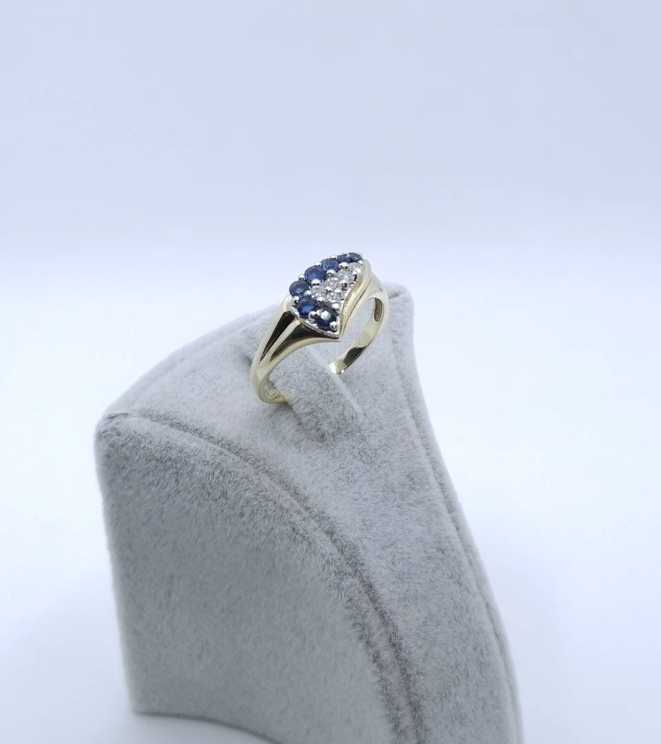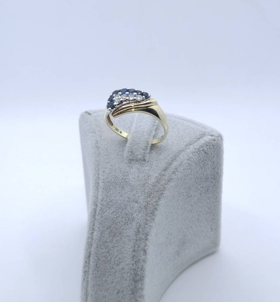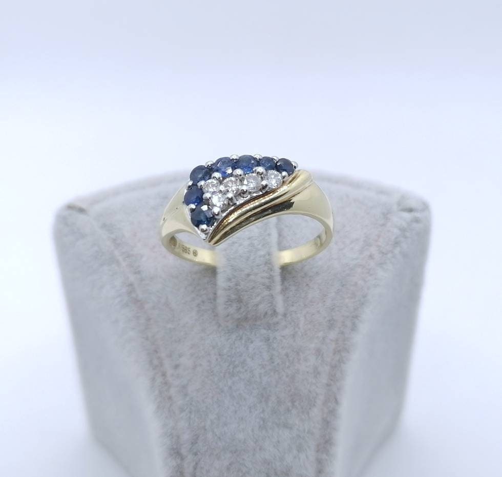Traumhafter Gold Damenring mit funkelnden Brillanten und Saphir Edelsteinen. Der Ring ist aus 585er 14 karat Gold gefertigt.