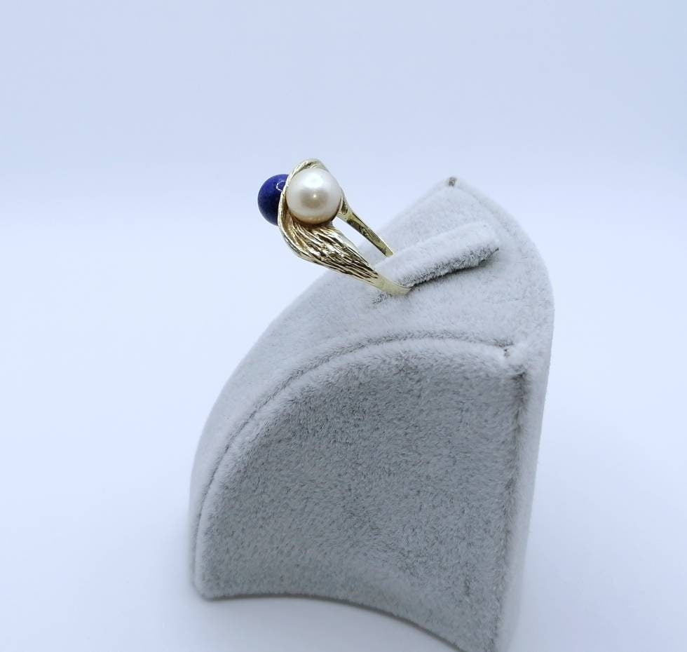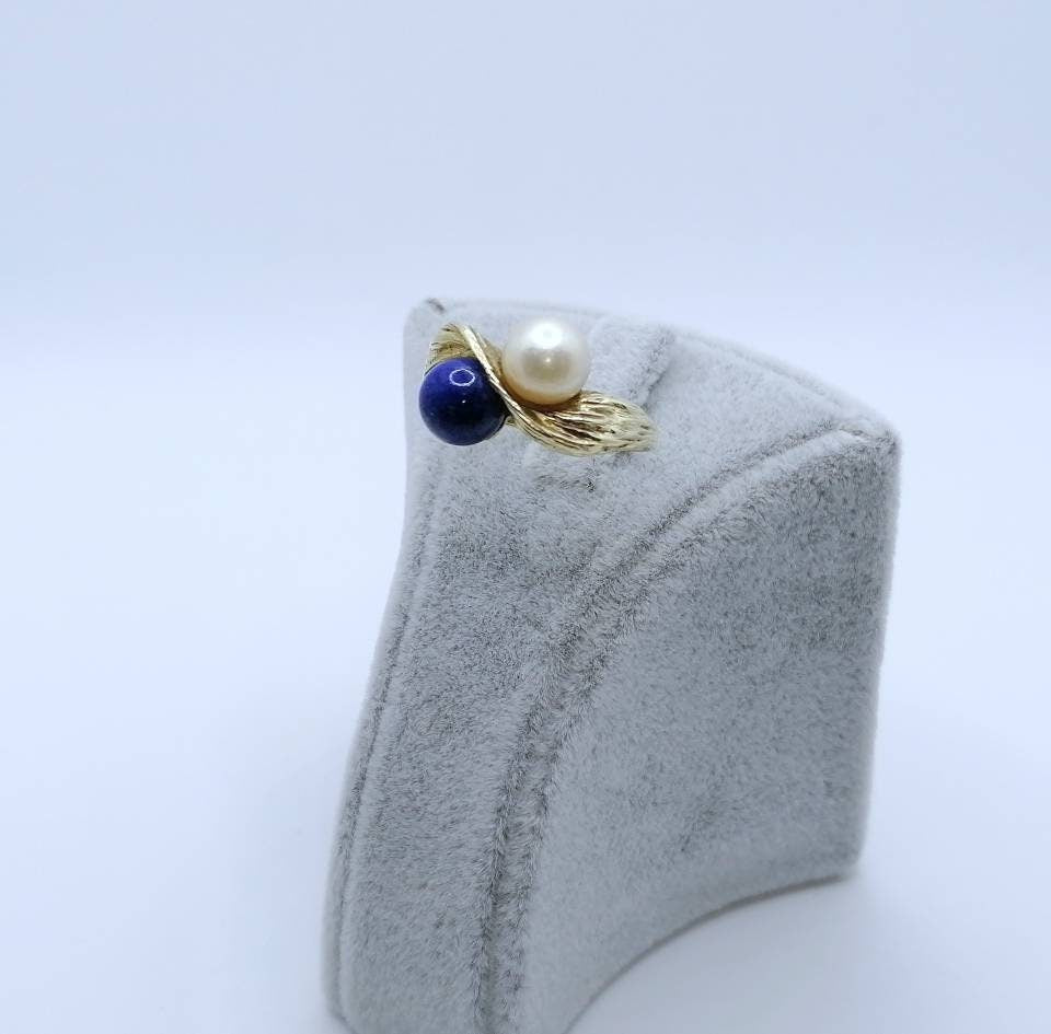Vintage Gold Damenring mit einer Perle und Lapislazuli. Das Schmuckstück ist aus 585er 14 Karat Gold gefertigt und wartet gespannt auf seine neue Besitzerin.