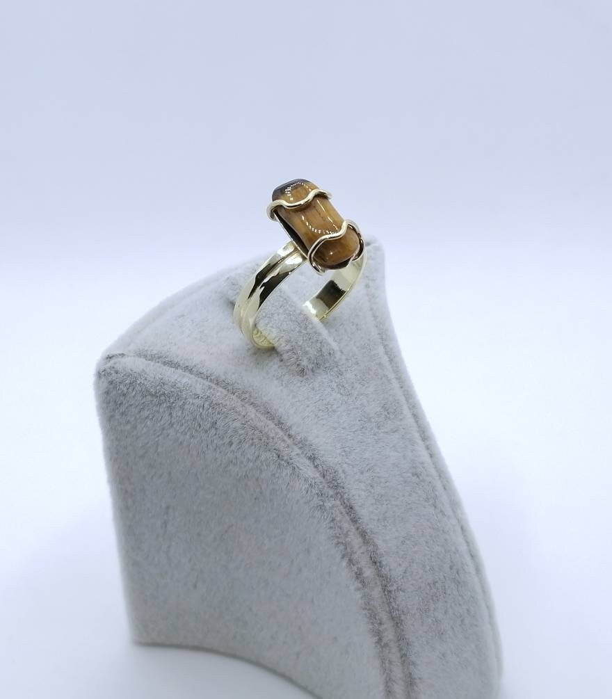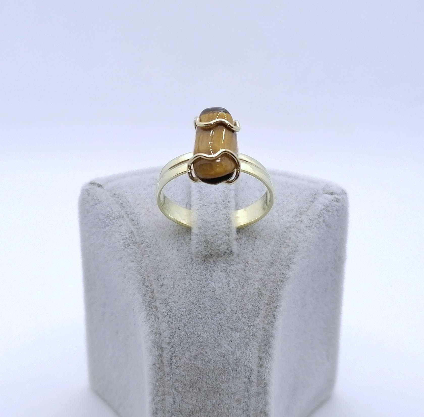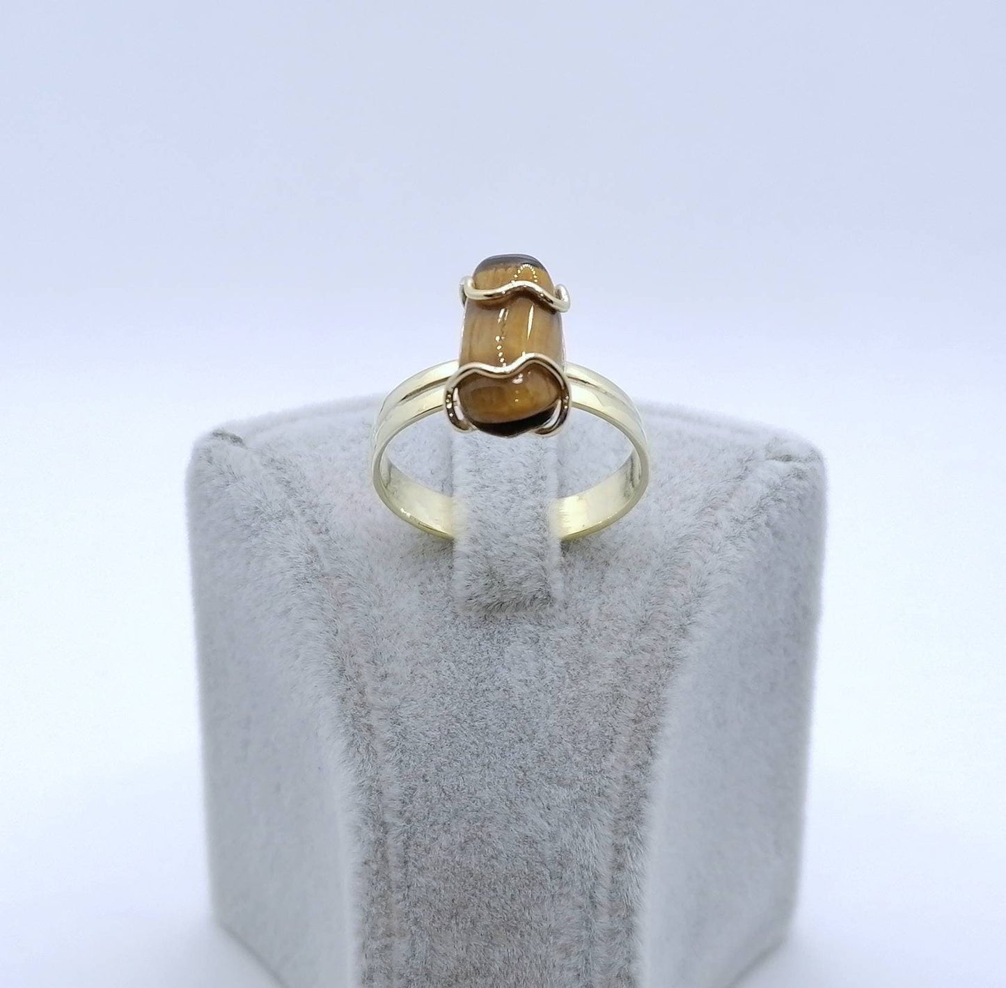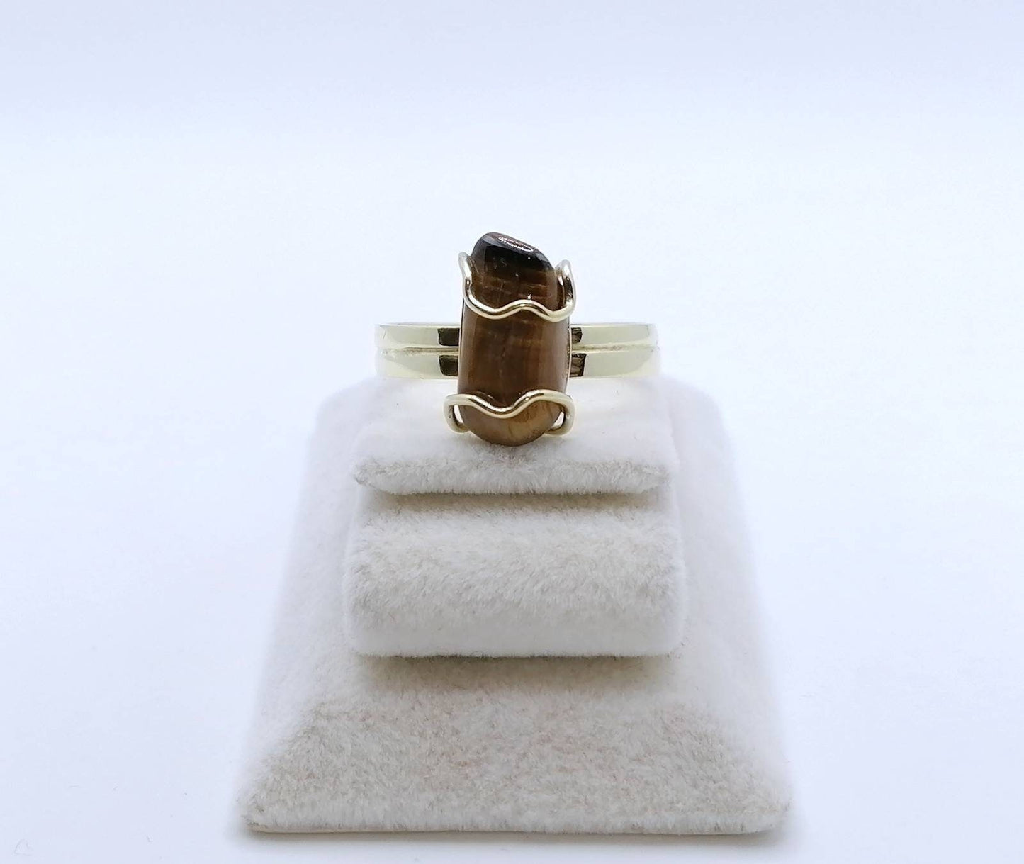 Handgefertigter Gold Damenring mit einem Tigerauge. Der Ring ist aus 585er 14 karat Gold gefertigt und wartet gespannt auf seine neue Besitzerin.