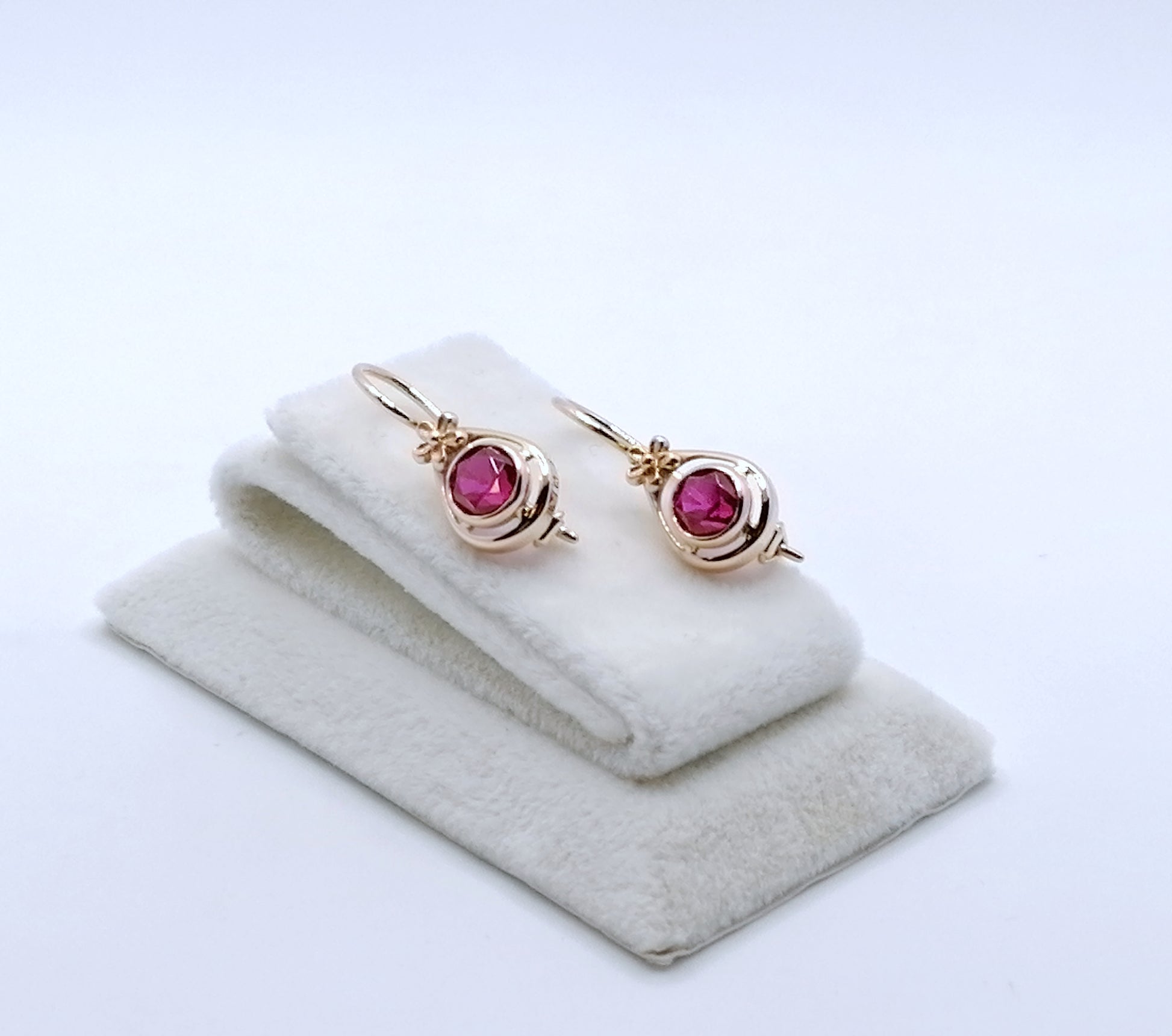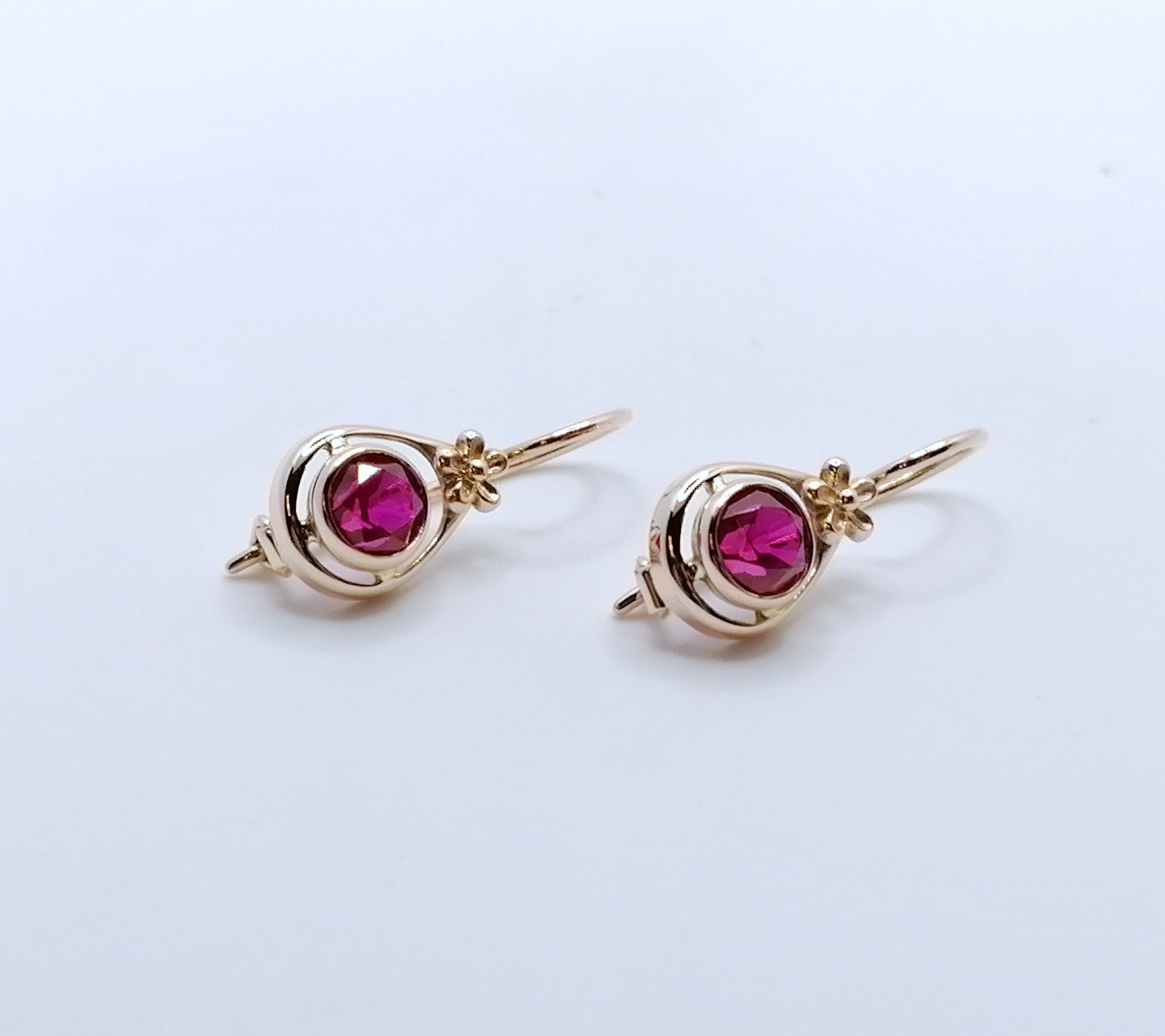 Paar UdSSR Rotgold Ohrhänger mit Rubin Edelsteinen. Die Ohrringe sind aus 583er 14 Karat Gold gefertigt.