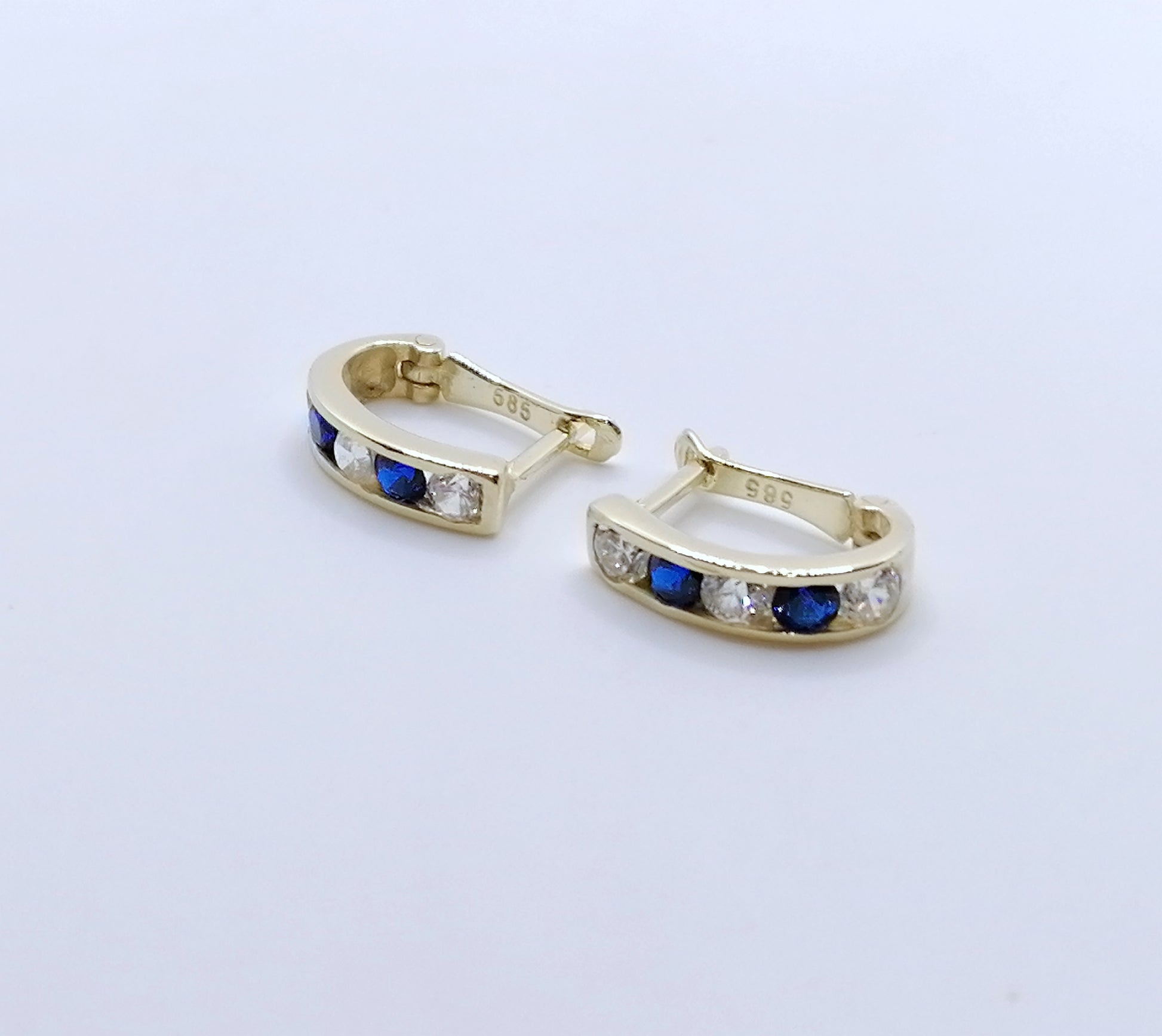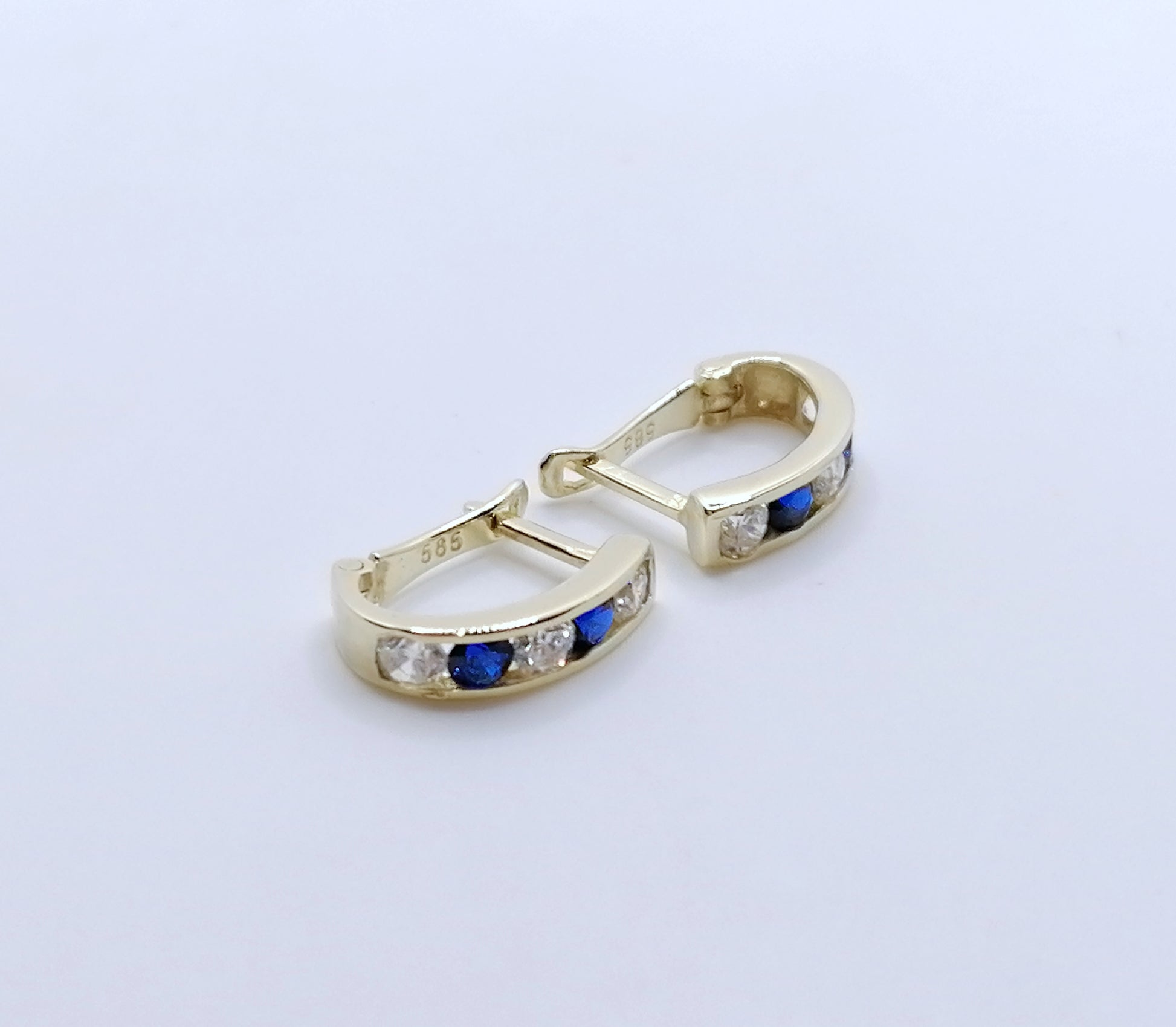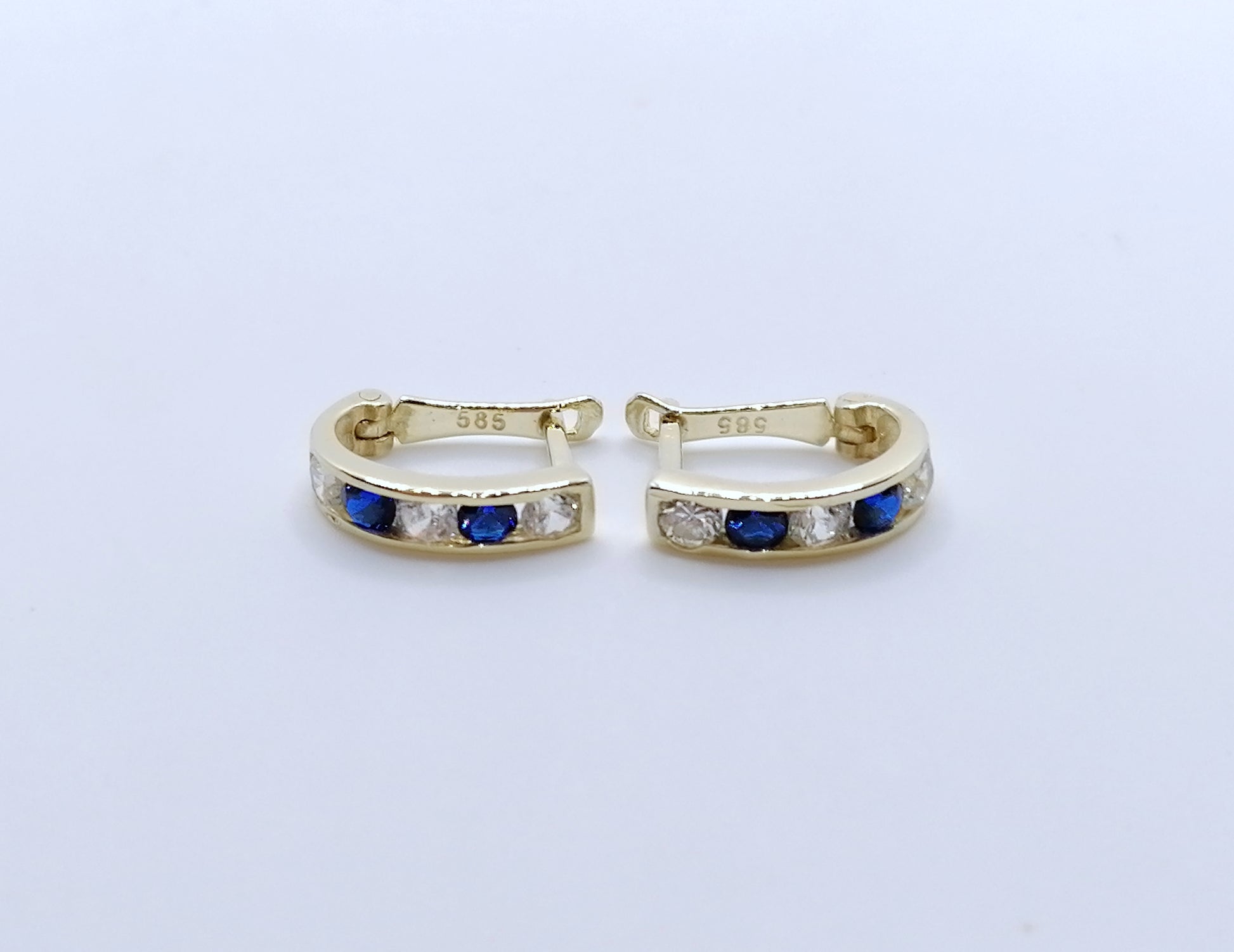Neuwertige Creolen mit blauen und farblosen Zirkonia. Die Ohrringe sind aus 585er 14 karat Gold gefertigt.