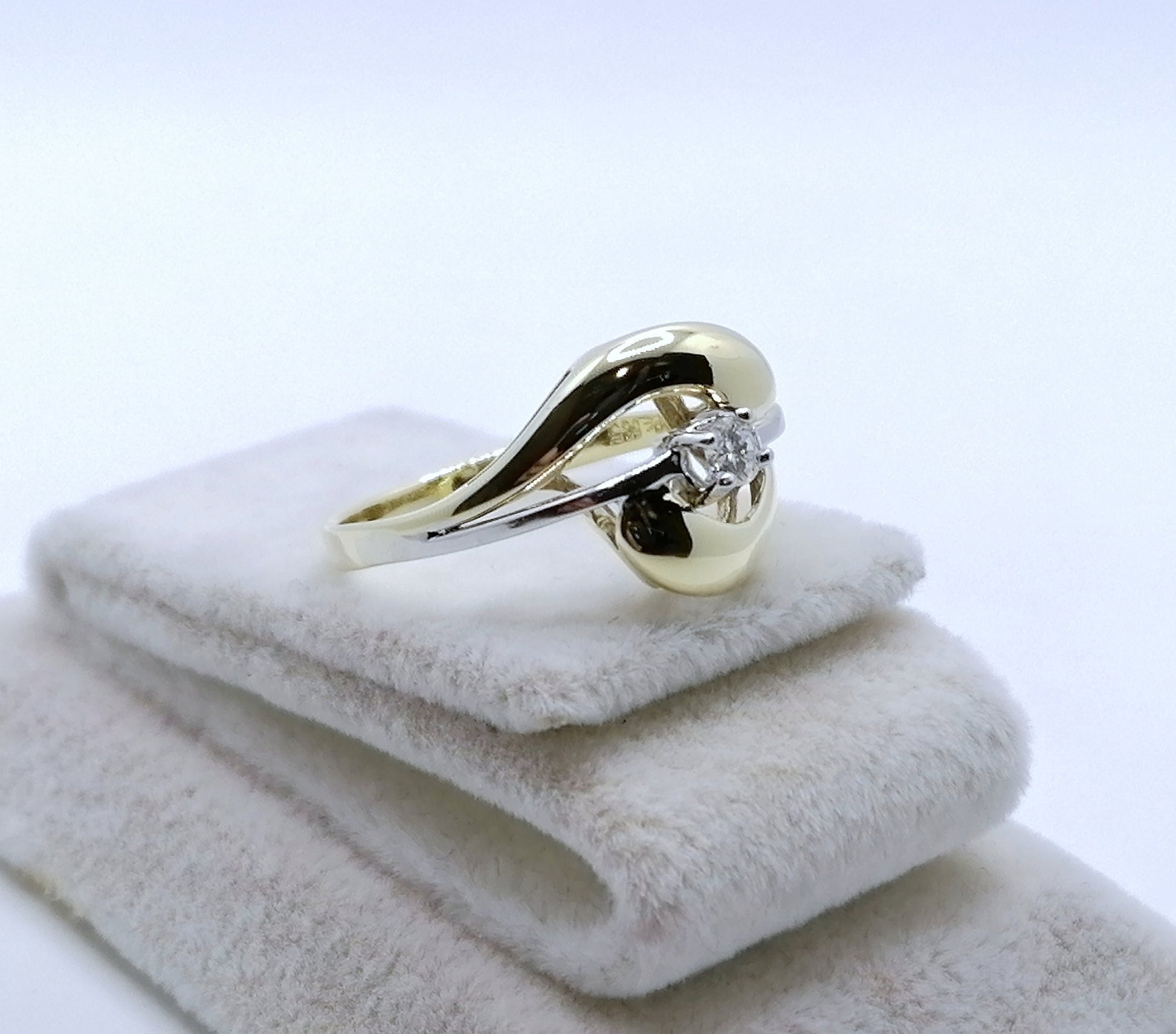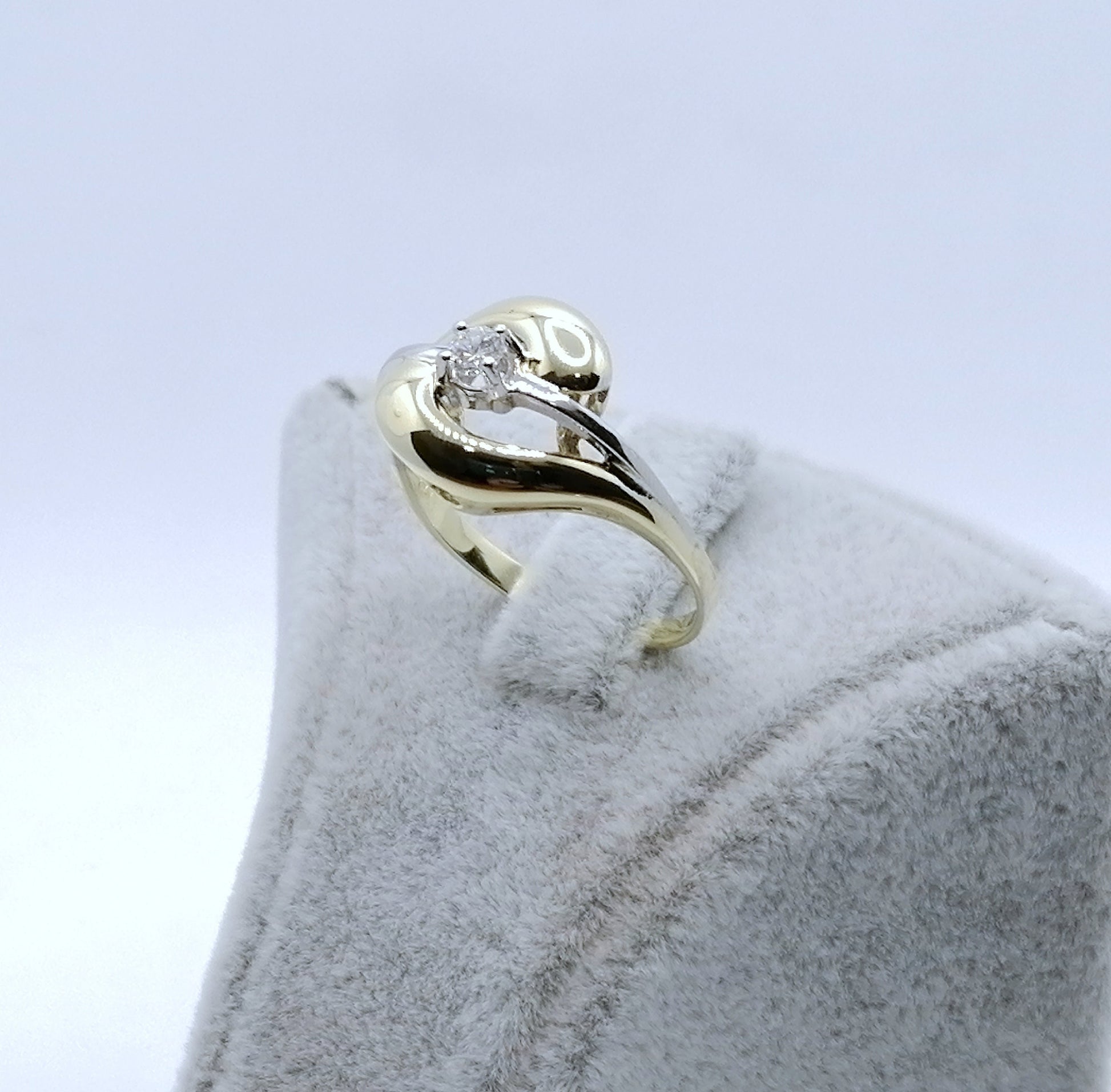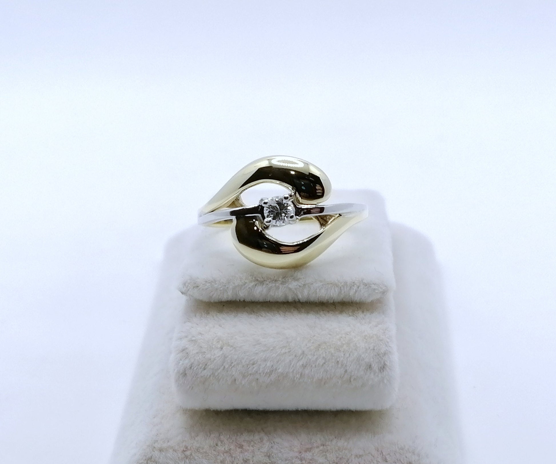 Bicolor (Gelbgold / Weißgold) Damenring mit einem hochwertigen 0,1ct VSI Brillanten. Der Ring ist aus 585er 14 karat Gold gefertigt.