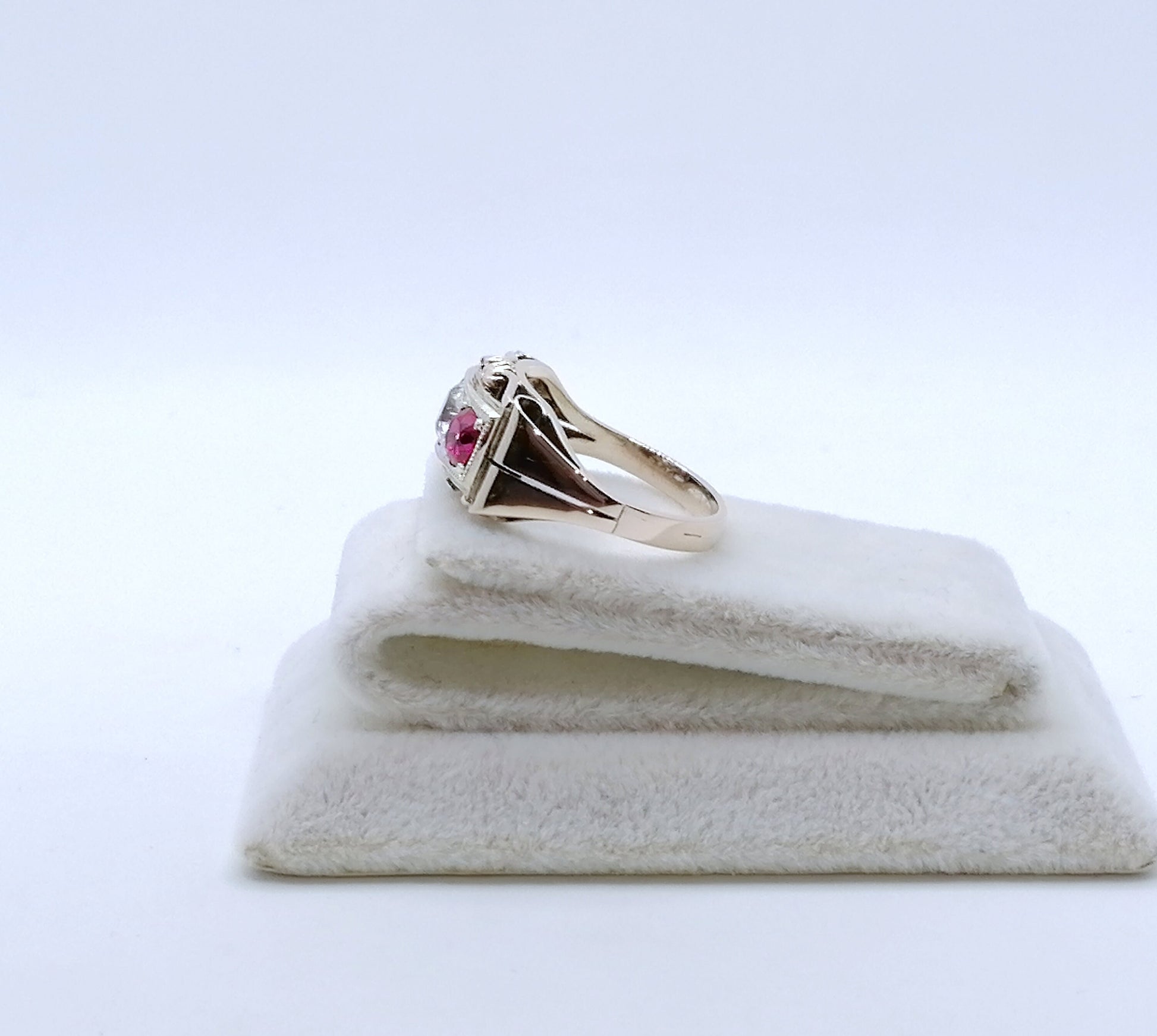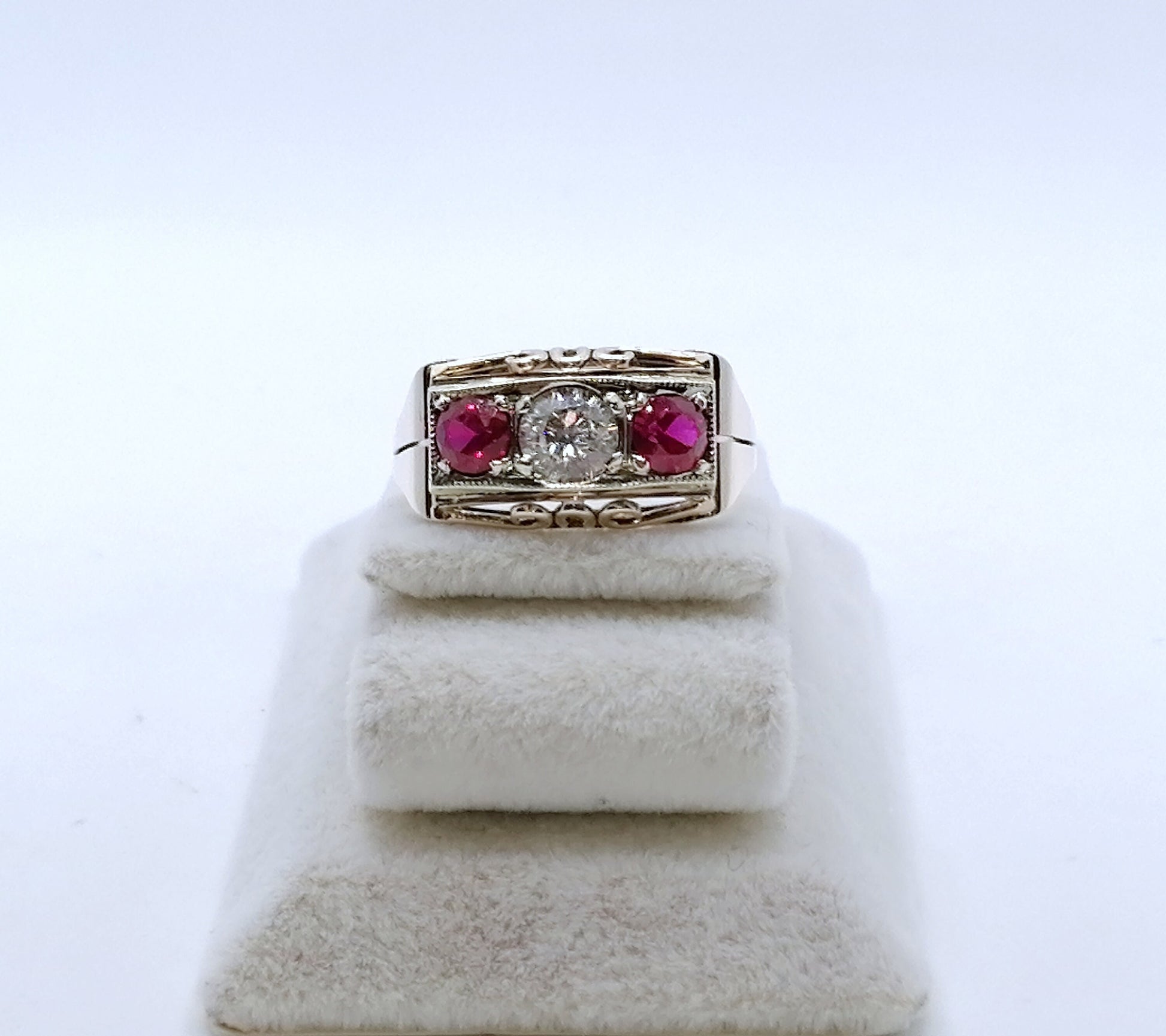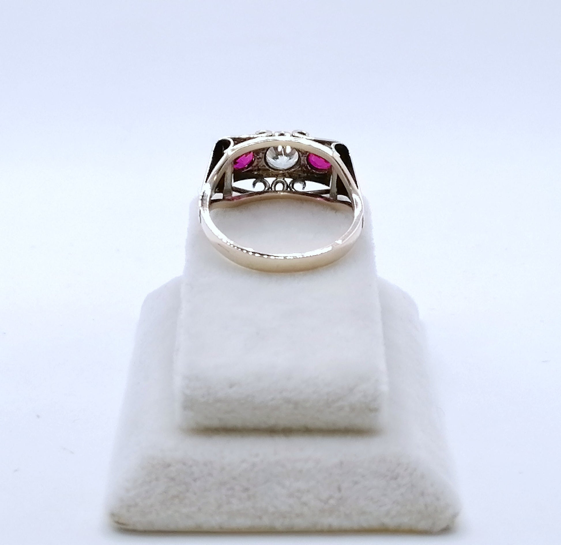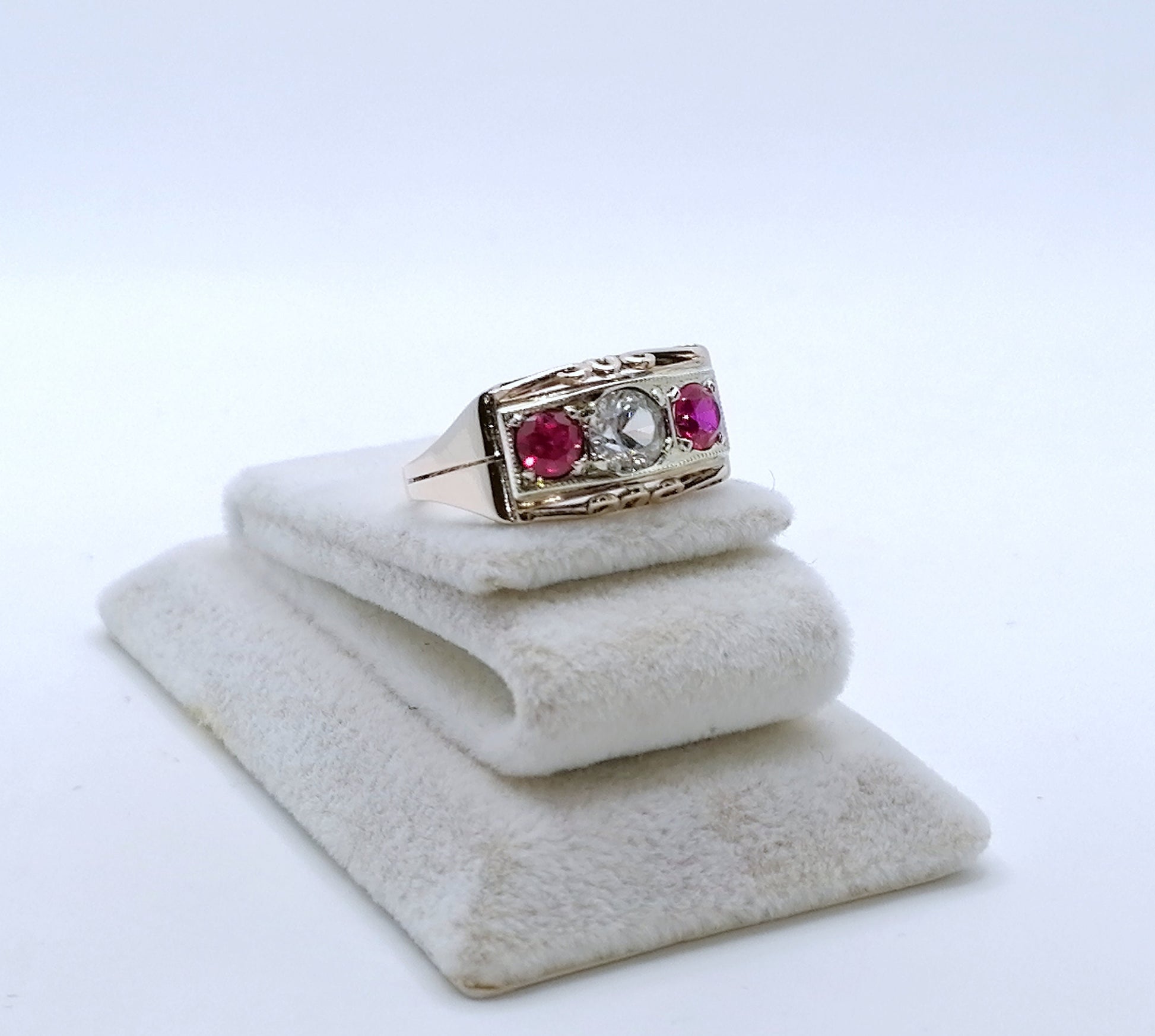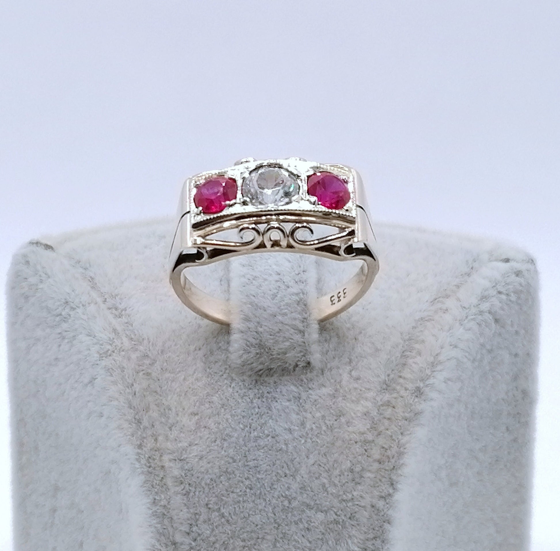 Artdeco Gold Damenring mit einem farblosen Saphir und zwei Rubin Edelsteinen. Der Ring ist aus 333er 8 Karat Gold gefertigt.