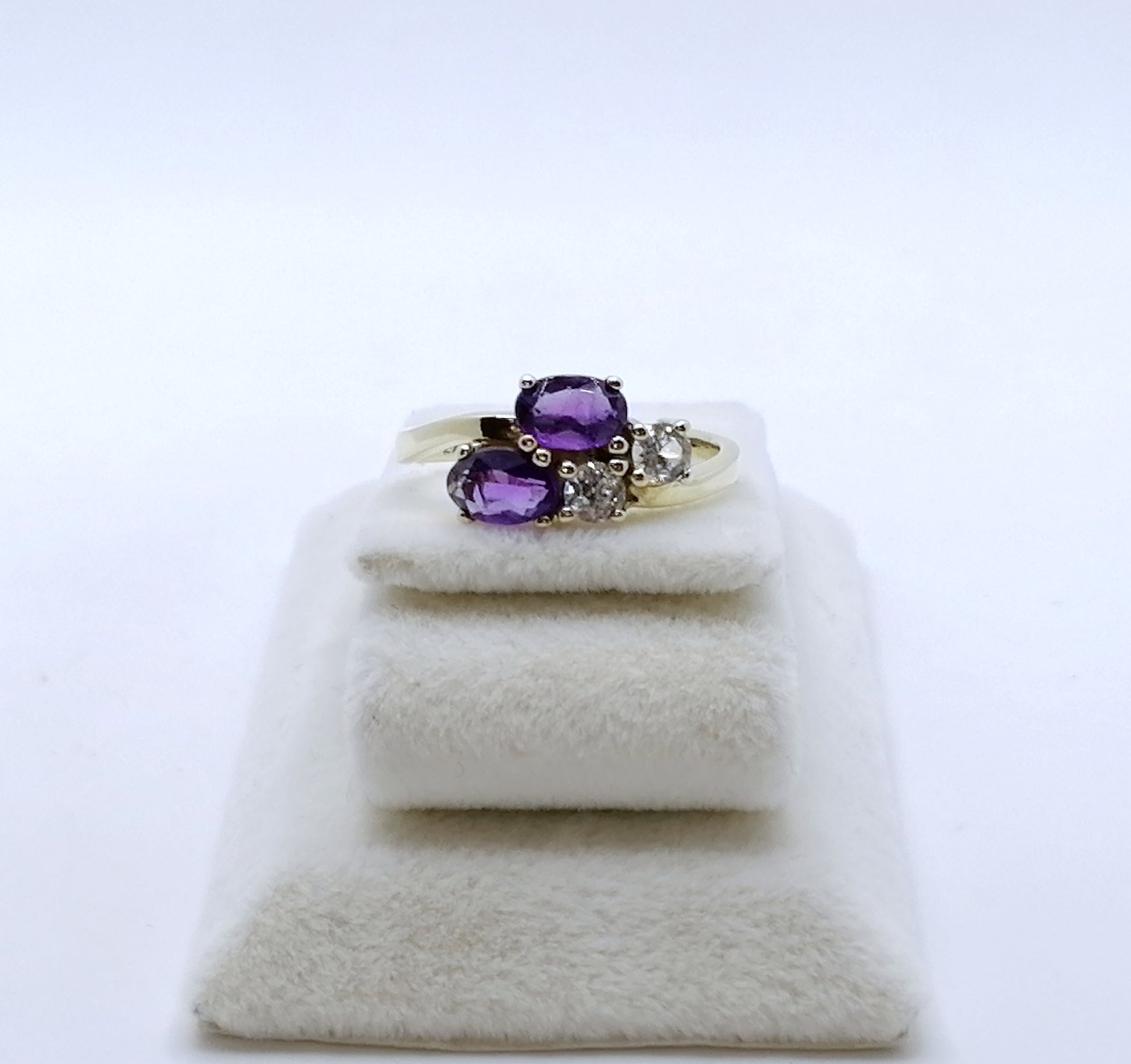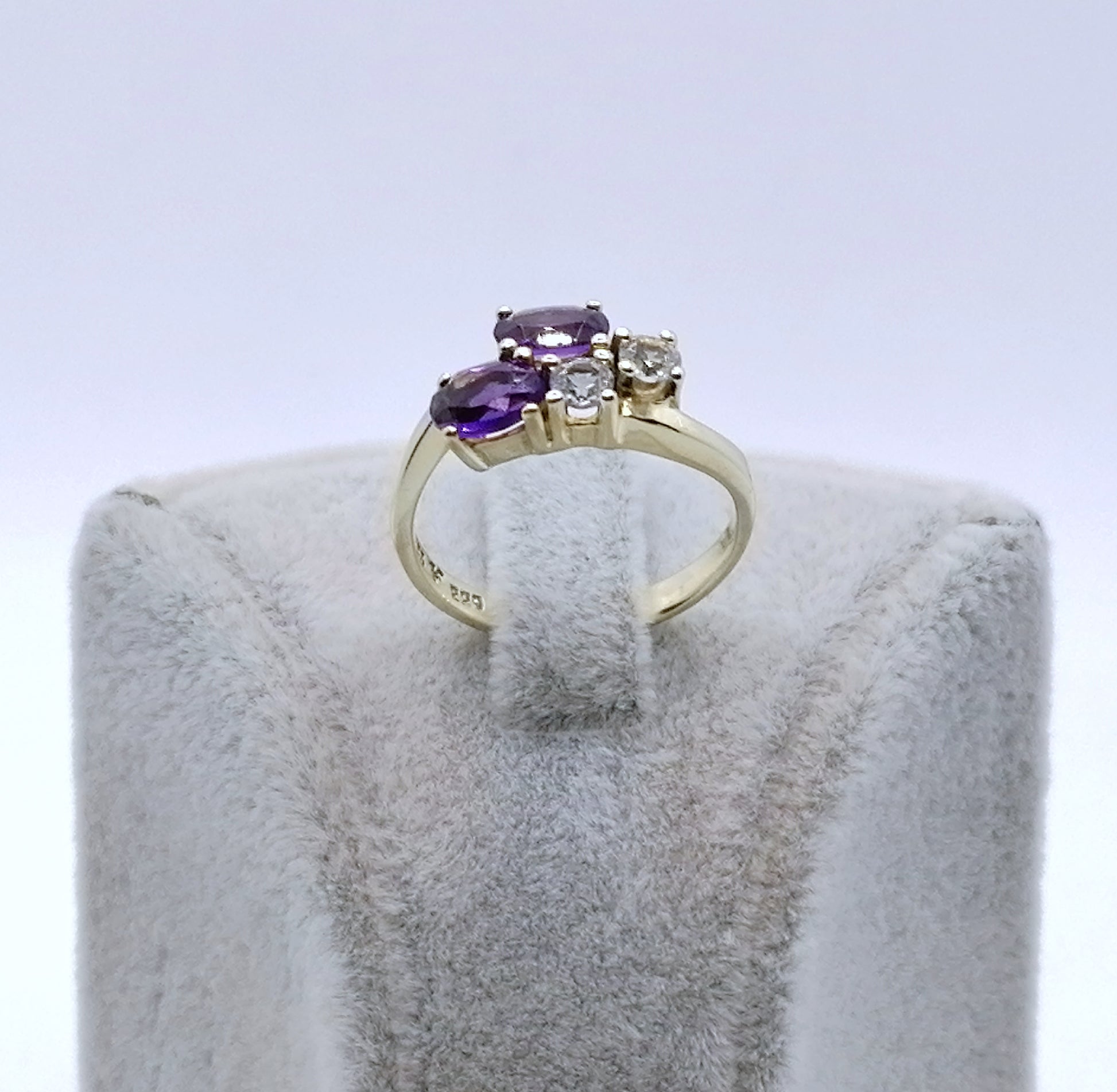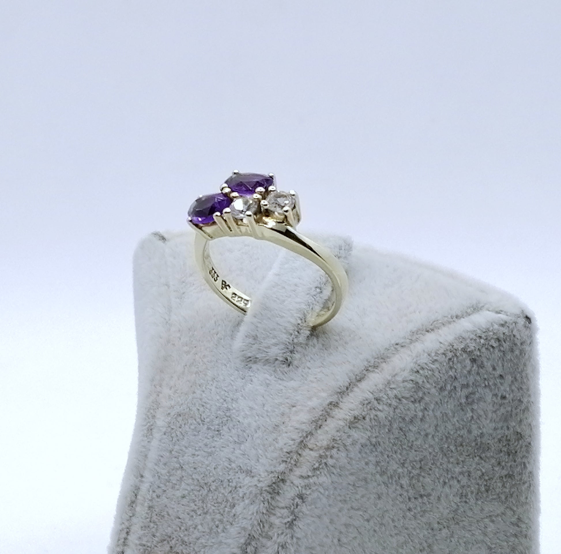 Neuwertiger Gold Damenring mit zwei Amethysten und zwei farblosen Spinell. Der Ring ist aus 333er 8 karat Gold gefertigt.