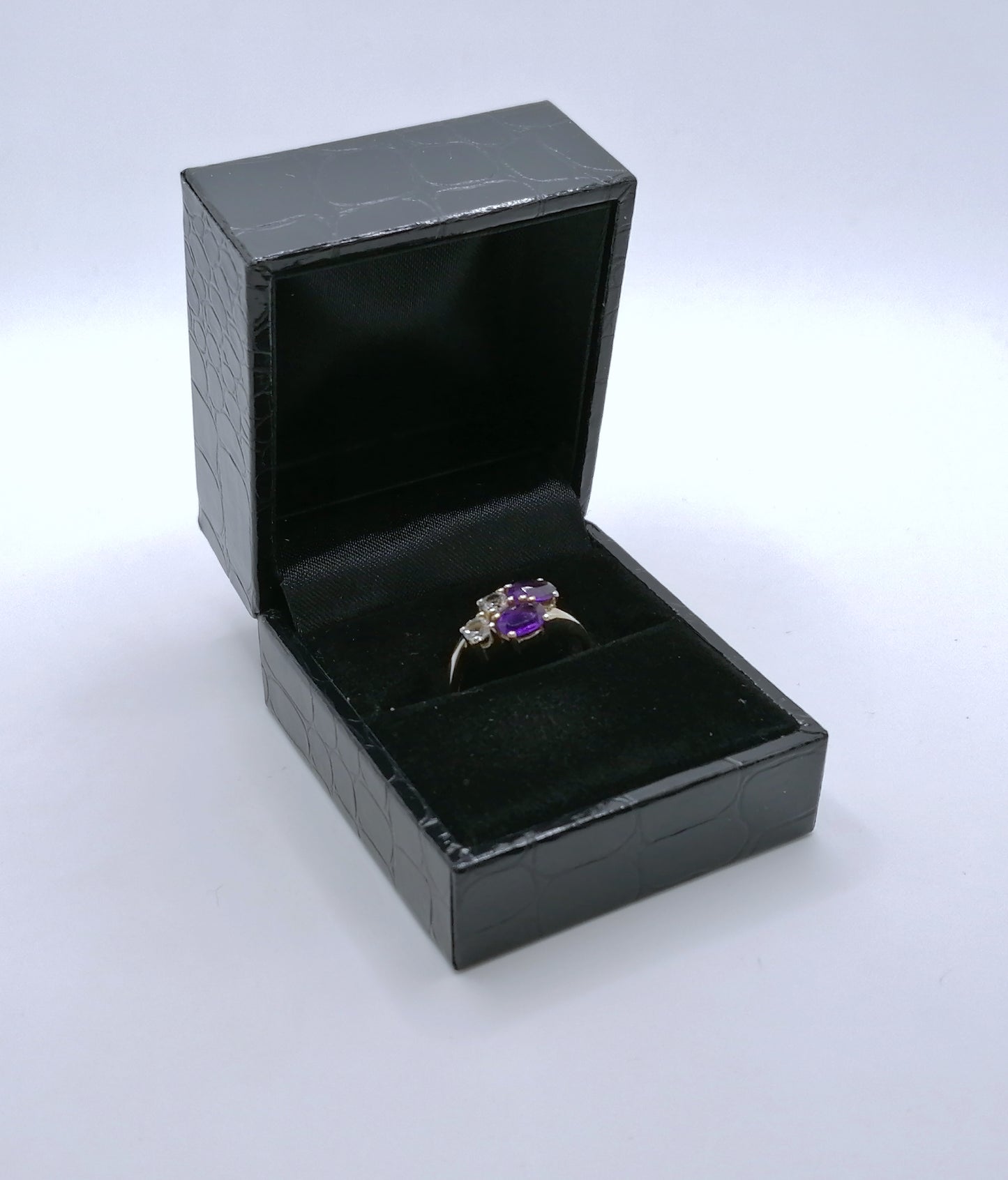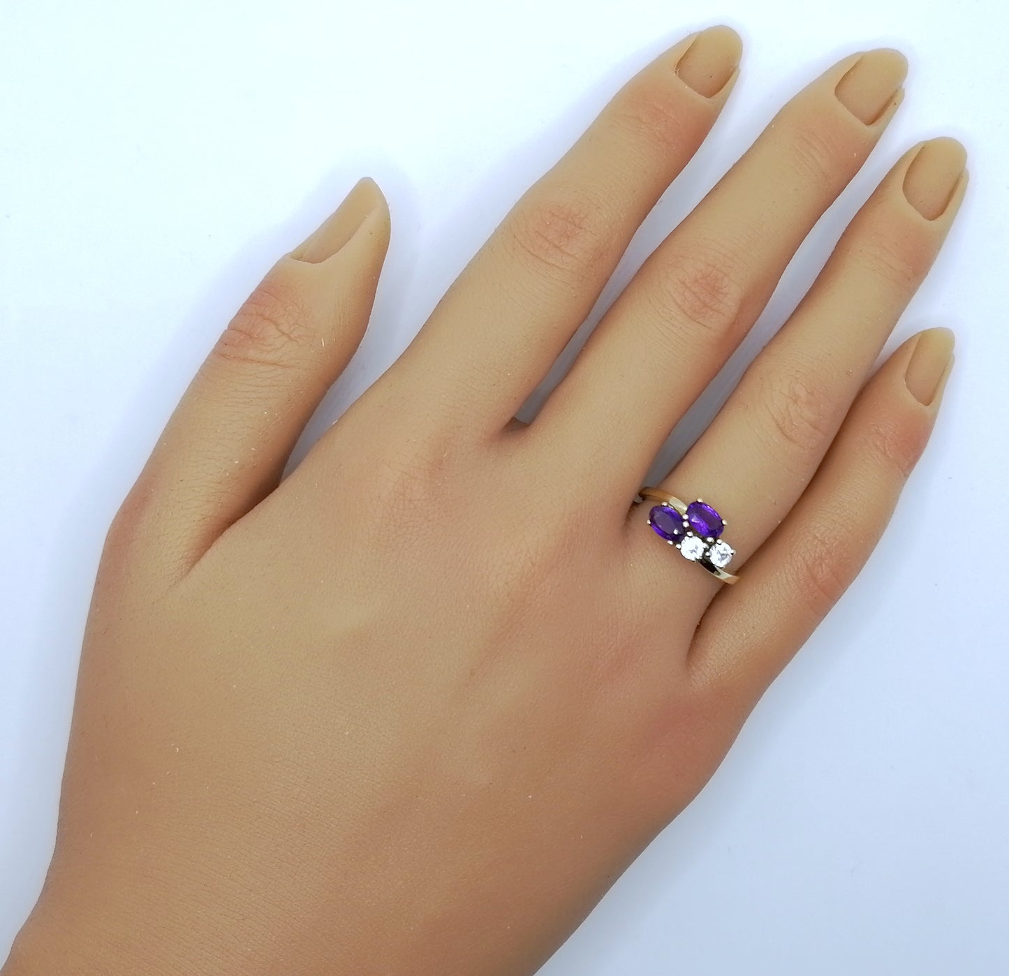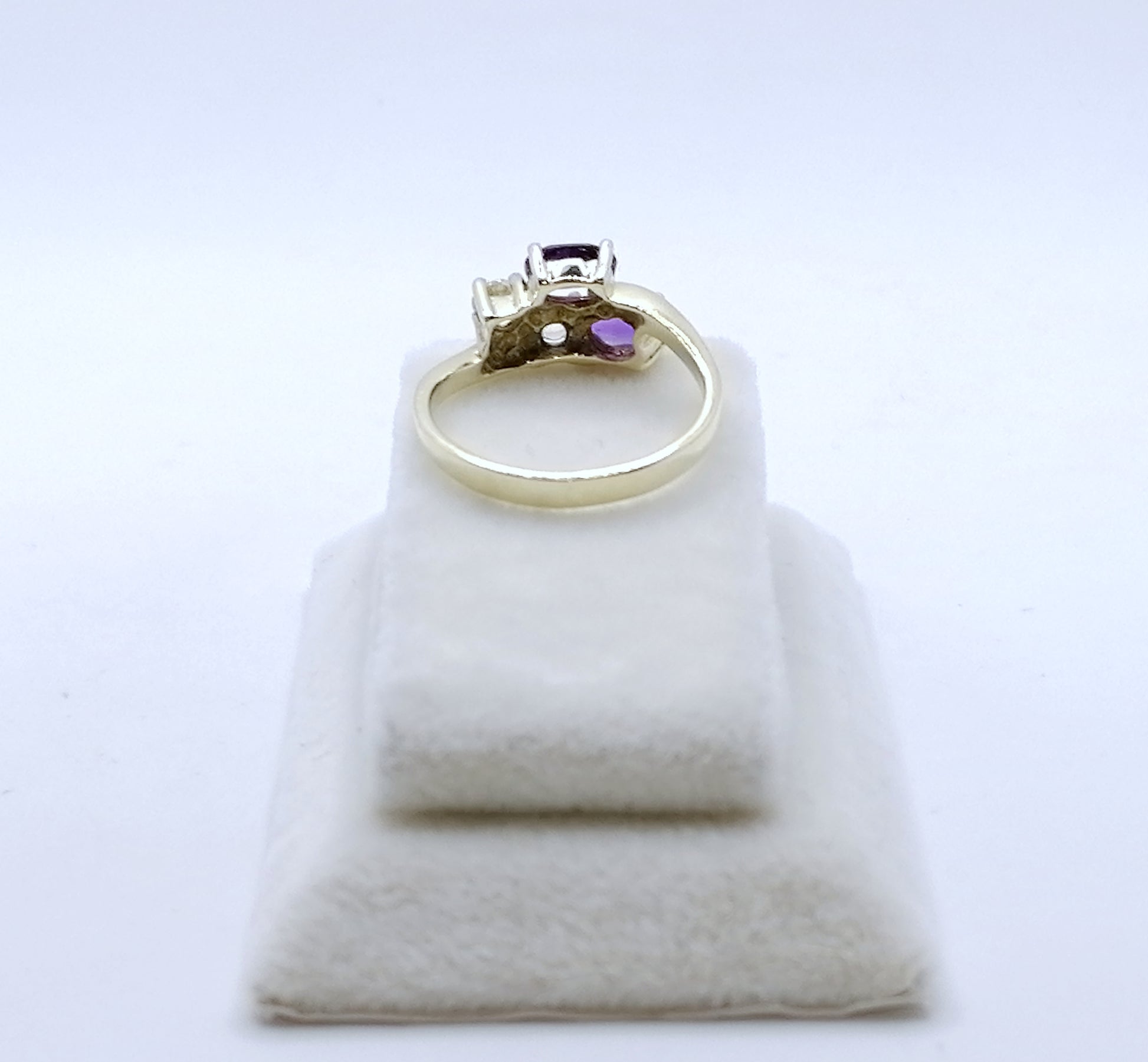 Neuwertiger Gold Damenring mit zwei Amethysten und zwei farblosen Spinell. Der Ring ist aus 333er 8 karat Gold gefertigt.
