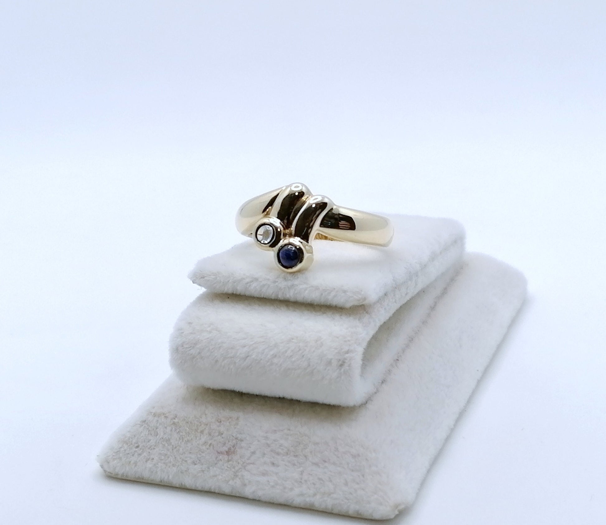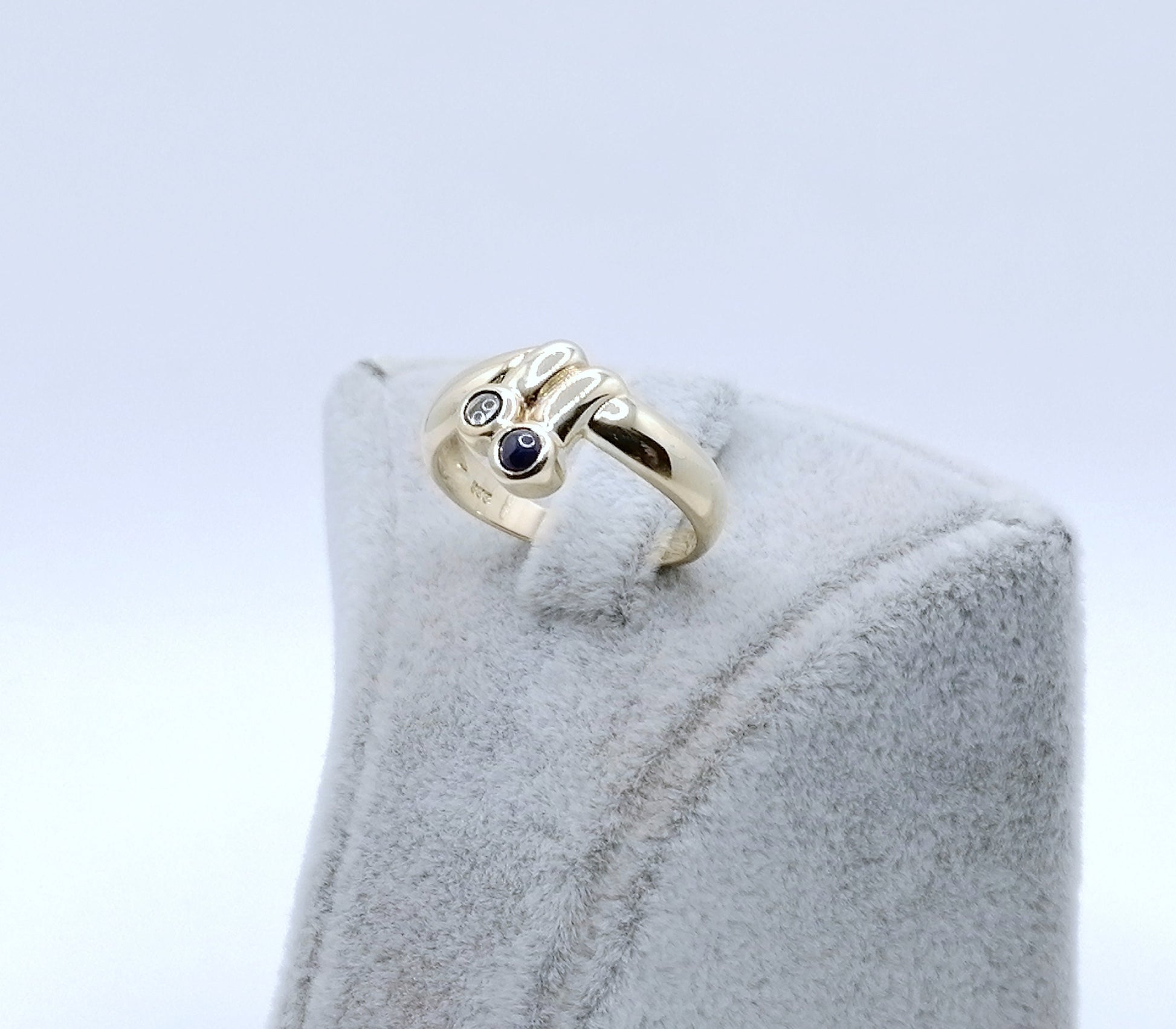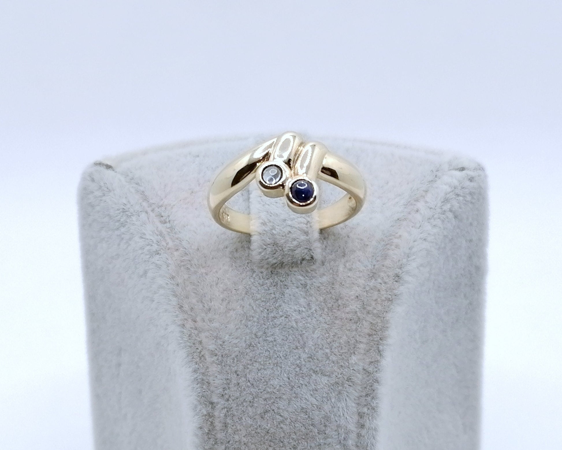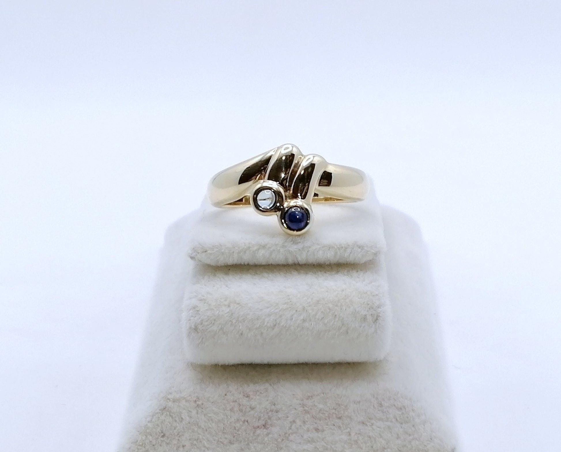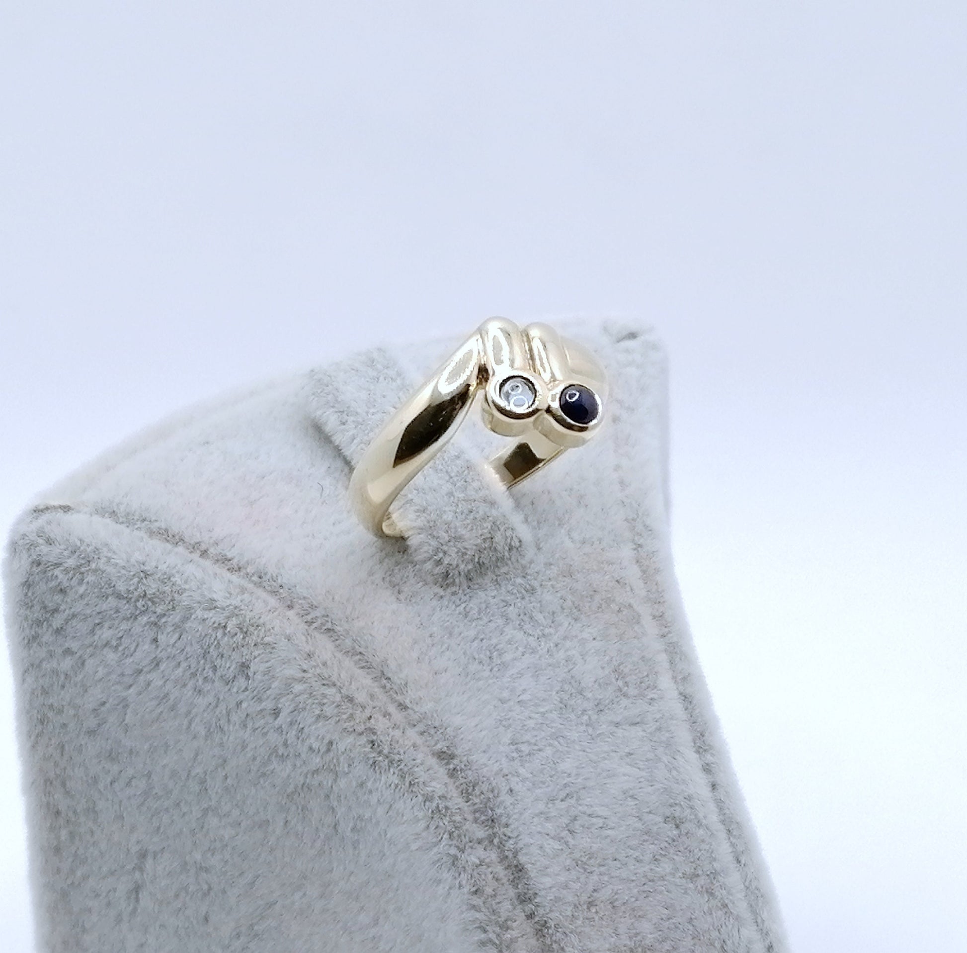 Gold Damenring mit einem Saphir Cabochon und einem Zirkonia. Der Ring ist aus 333er 8 karat Gold gefertigt und wartet gespannt auf seine neue Besitzerin.