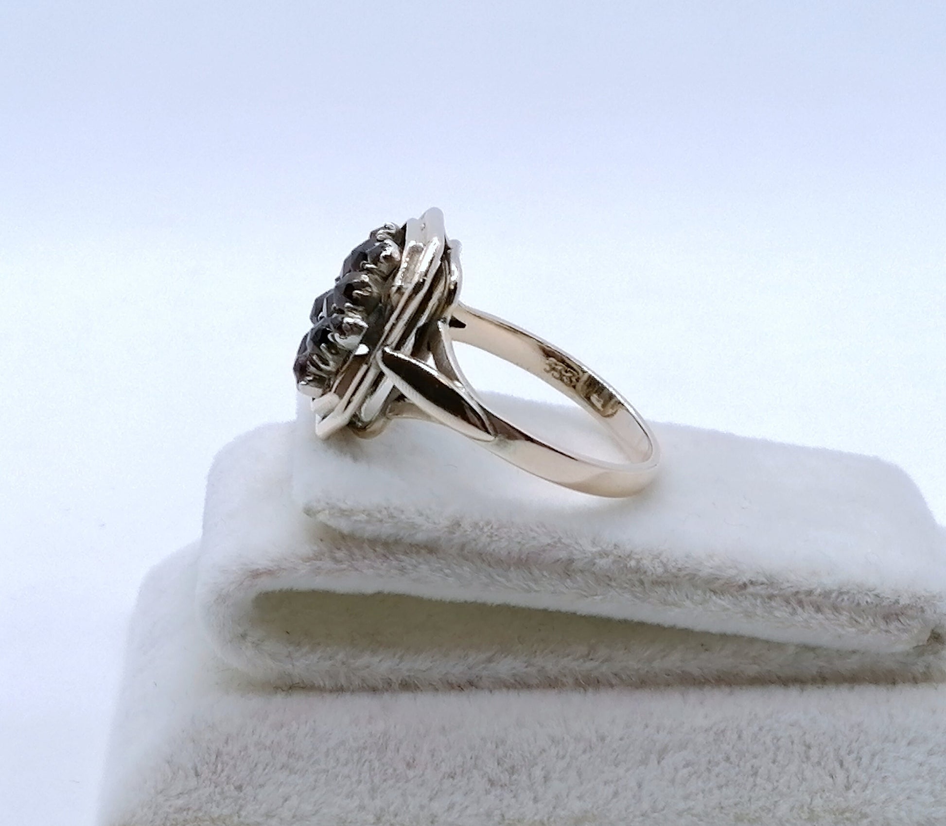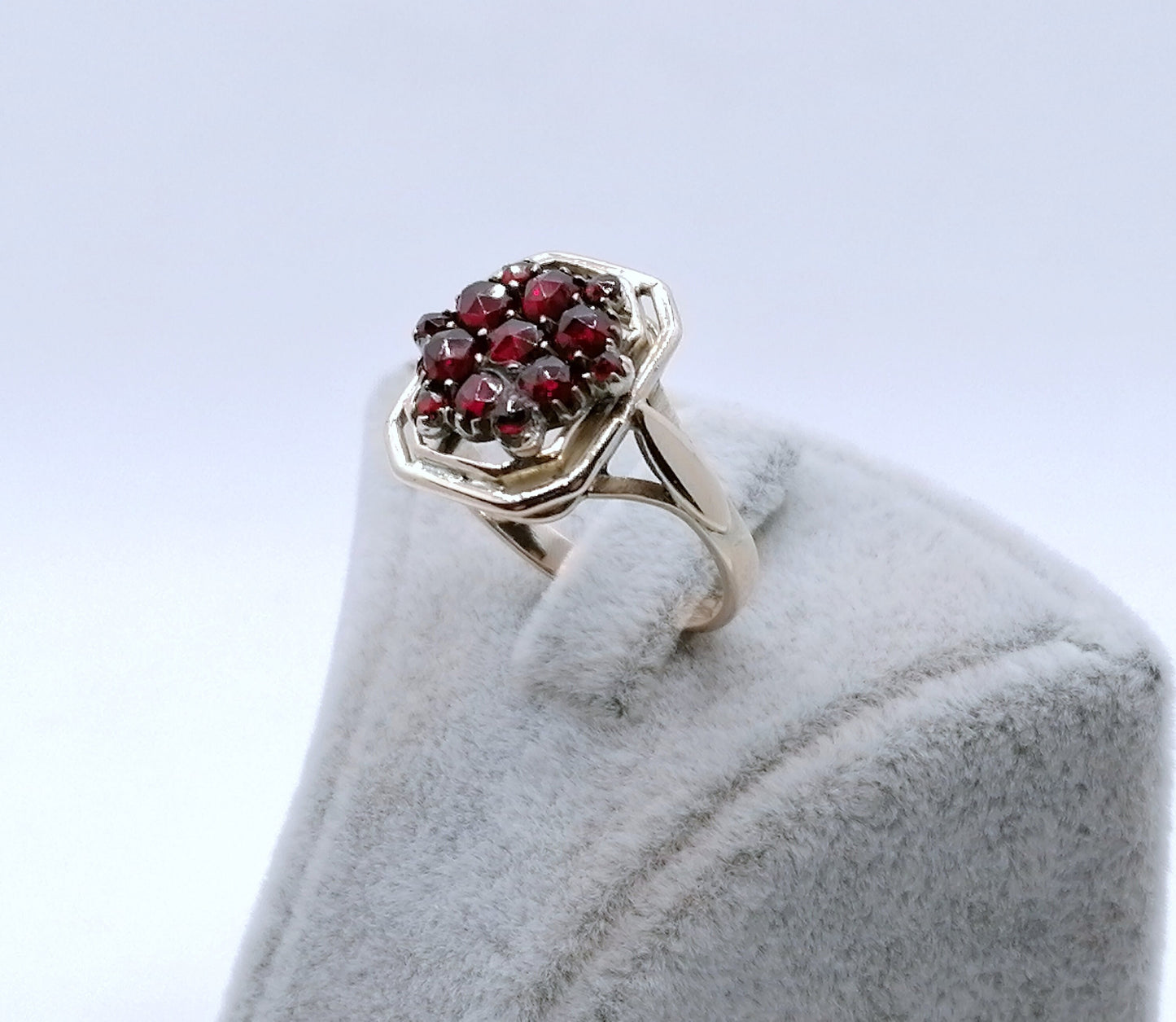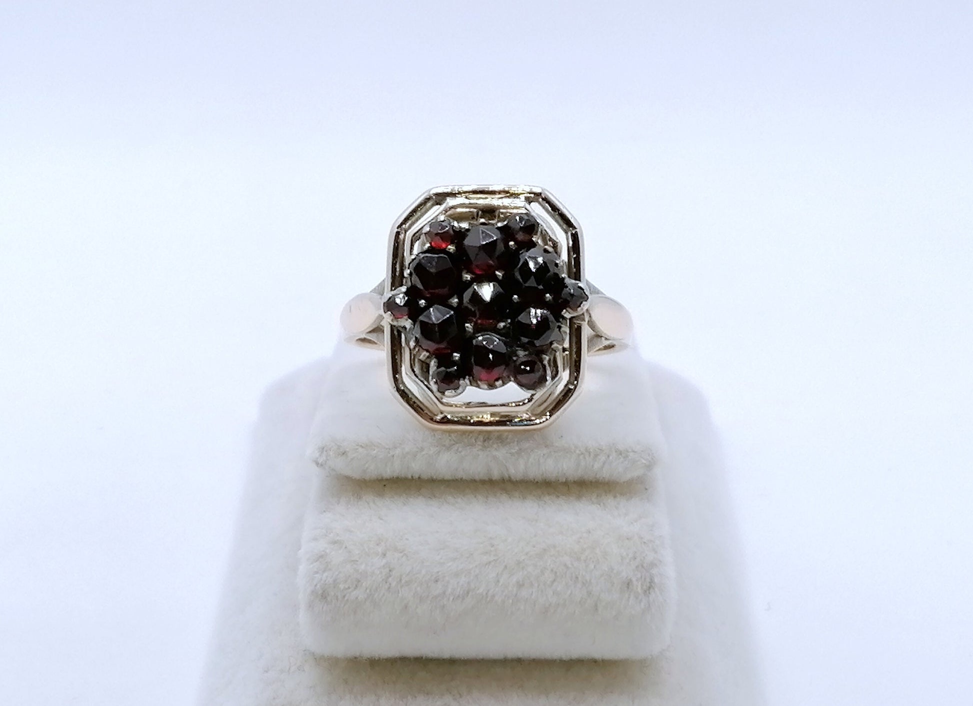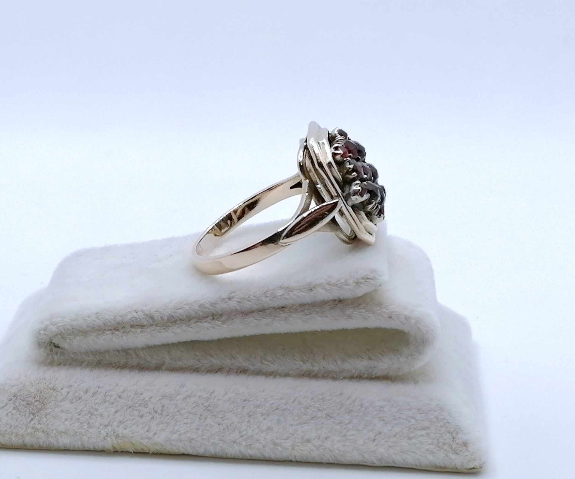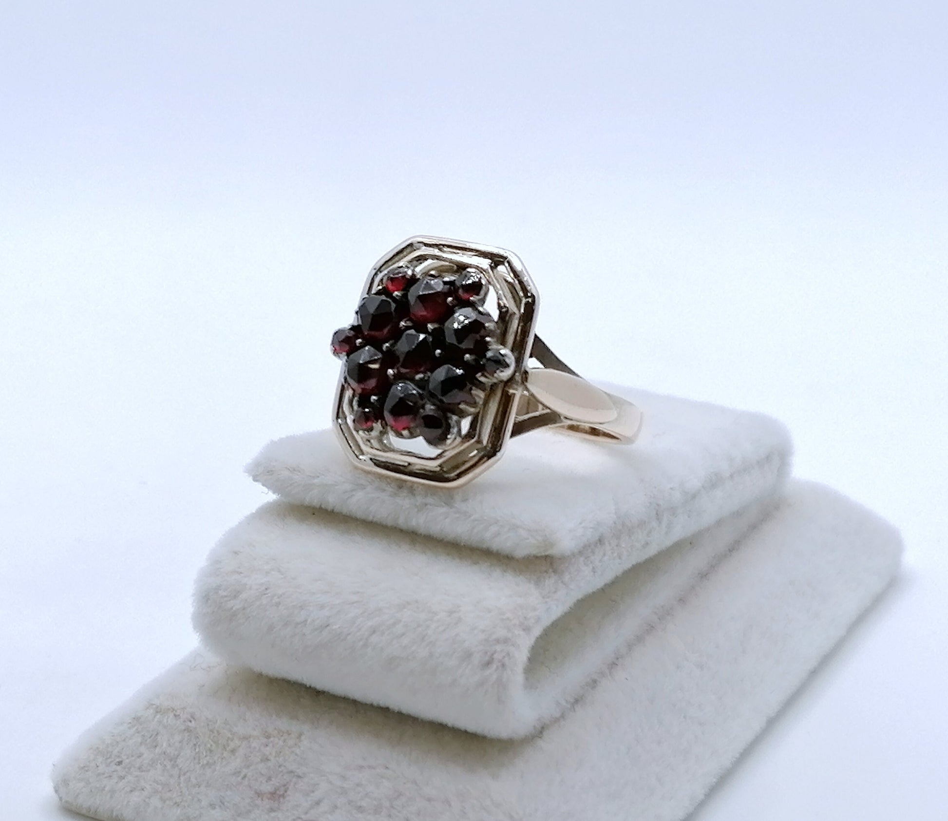 Vintage Rotgold Damenring mit wunderschönen Granatstein Rosen. Der Ring ist aus 333er 8 karat Gold gefertigt.