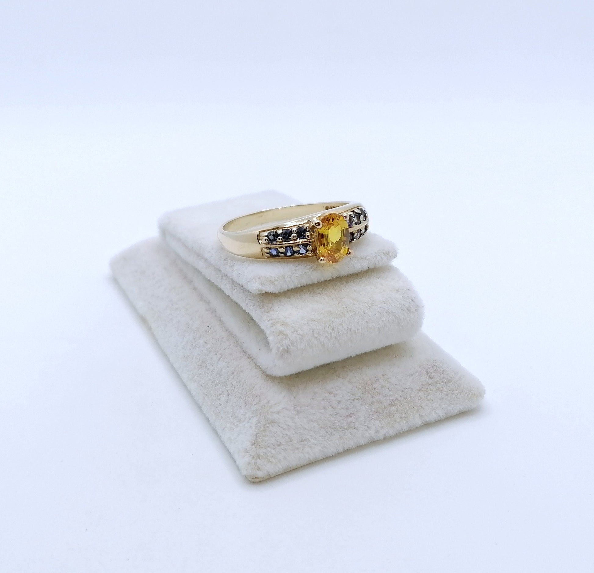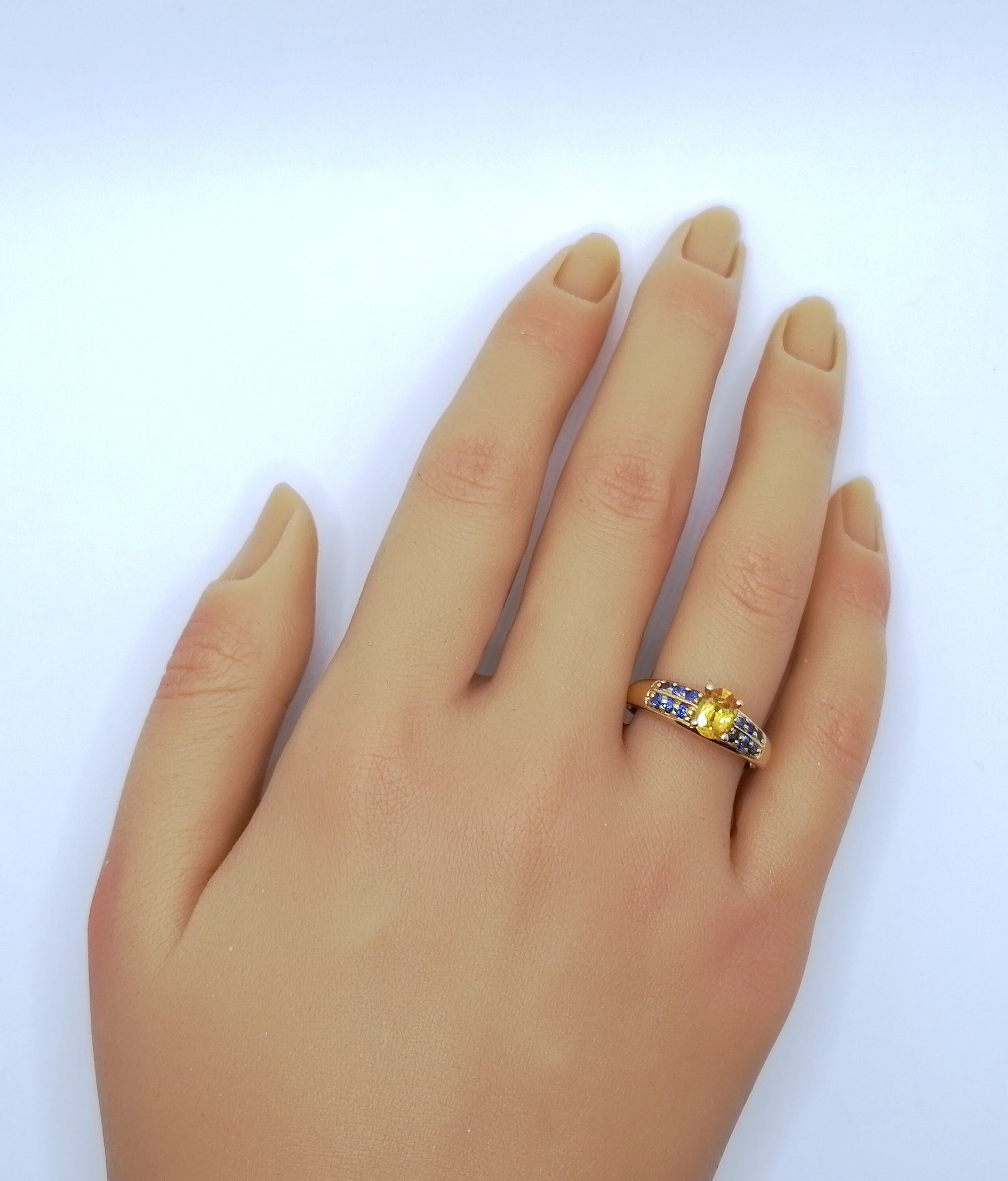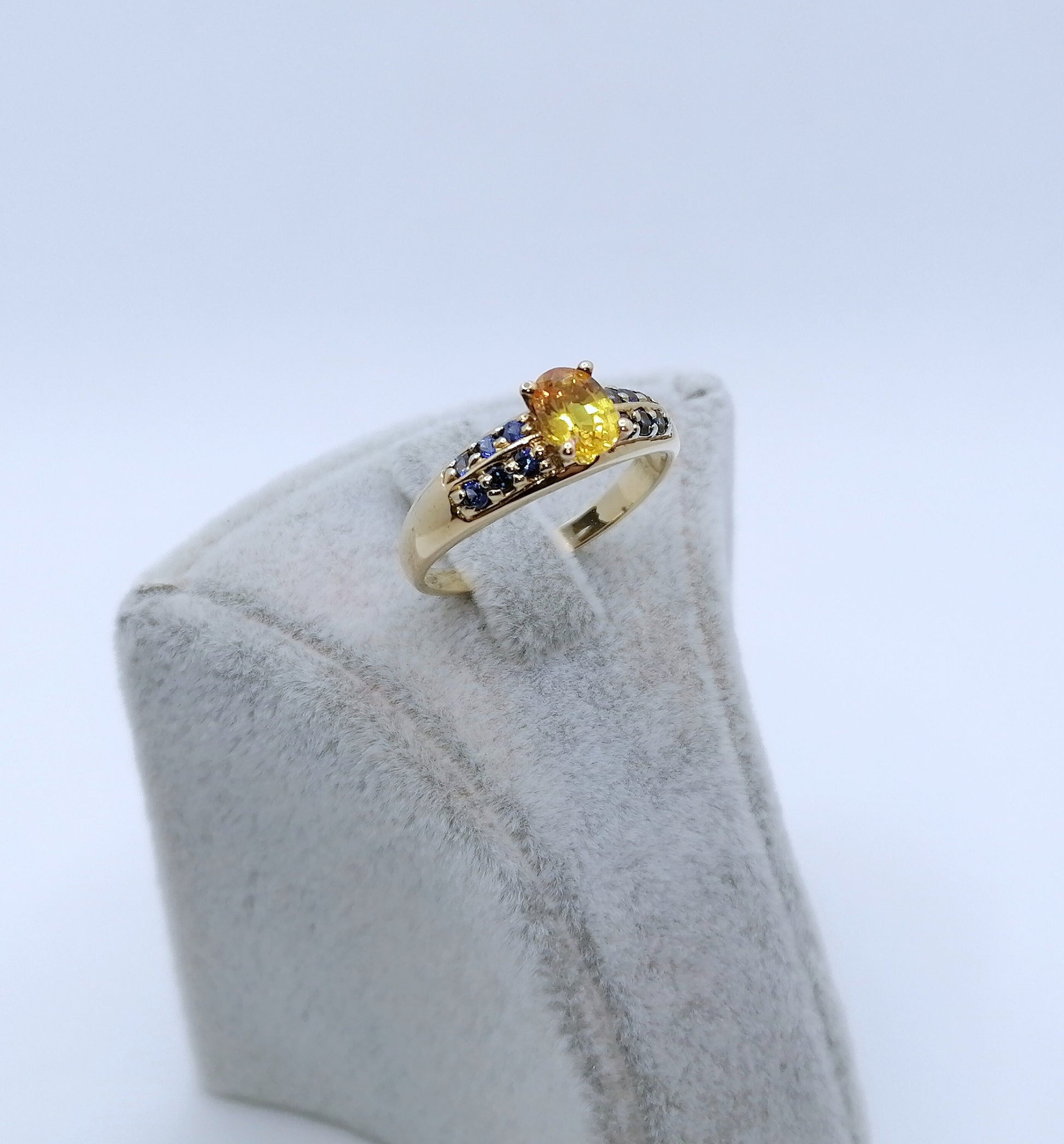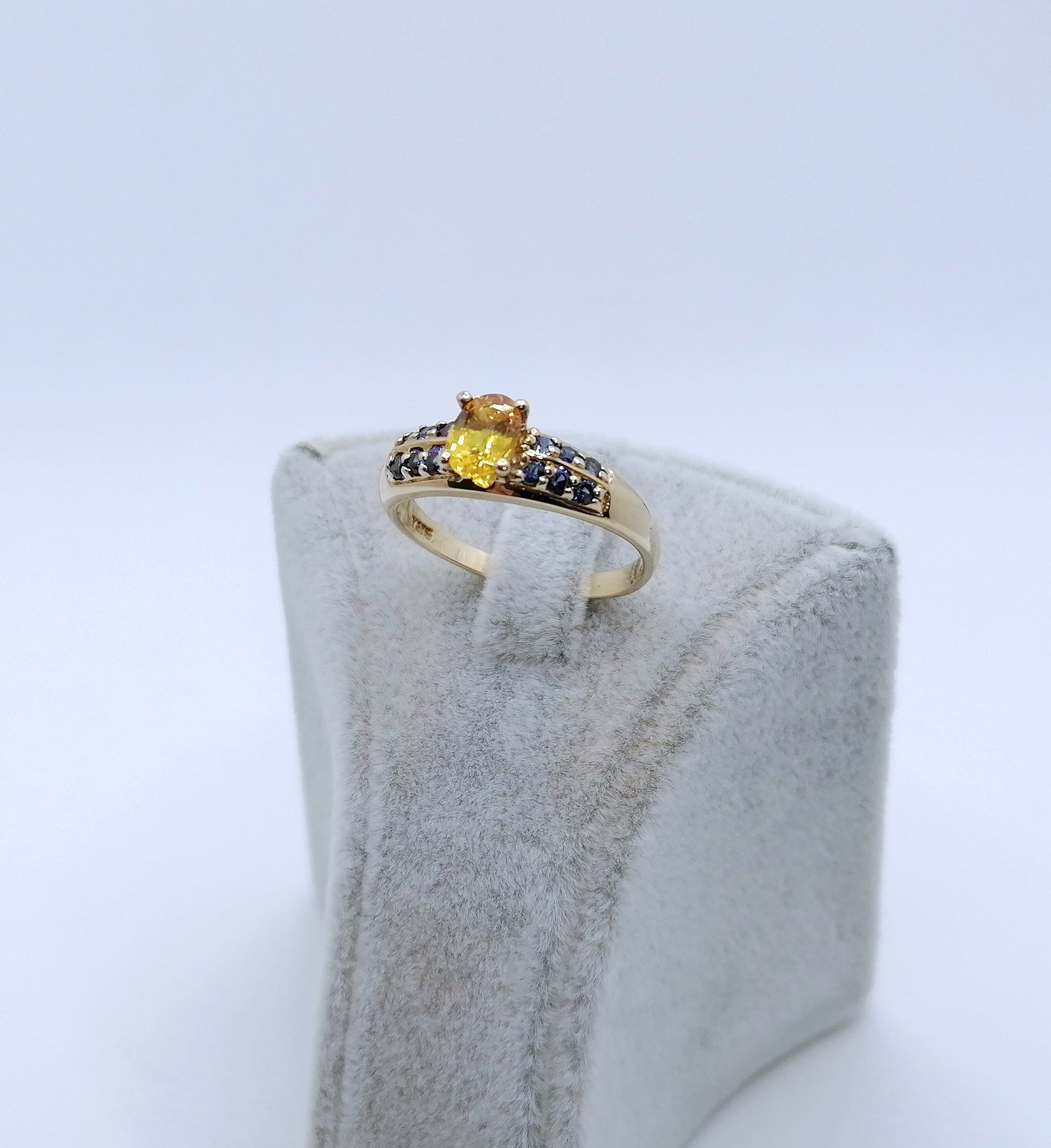 Gold Damenring mit einem gelben und 12 blauen Saphir Edelsteinen. Der Ring ist aus 375er 9 karat Gold gefertigt.