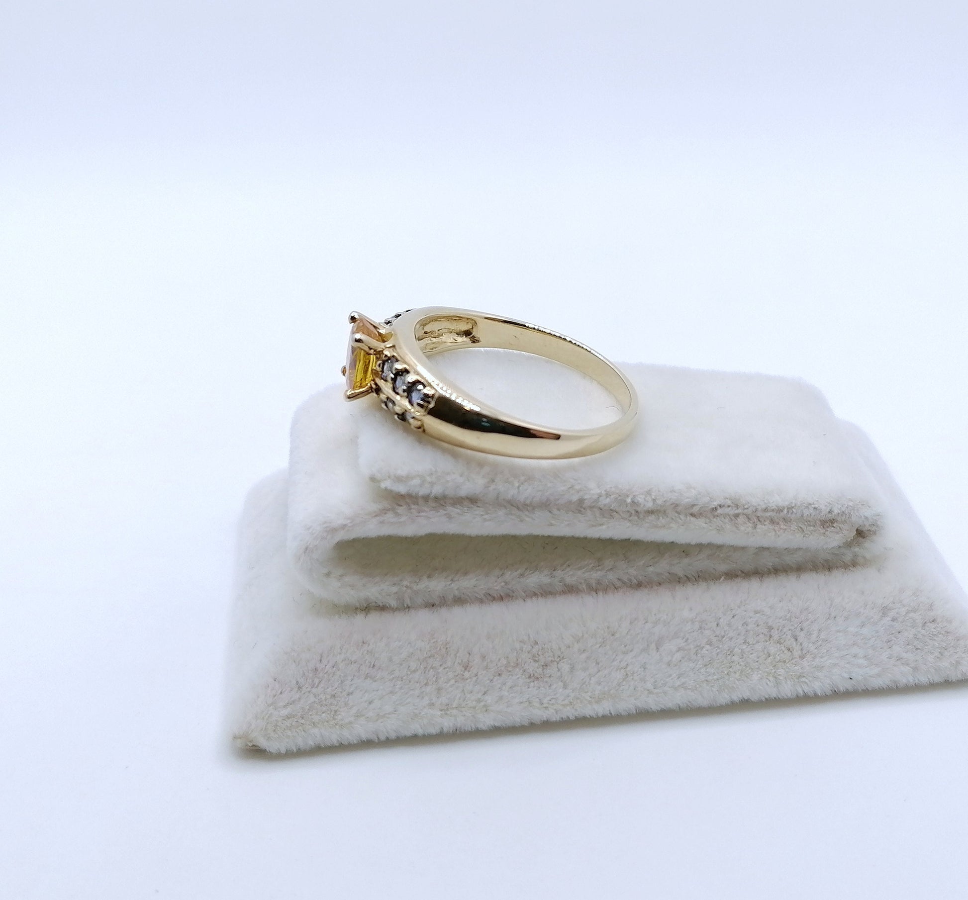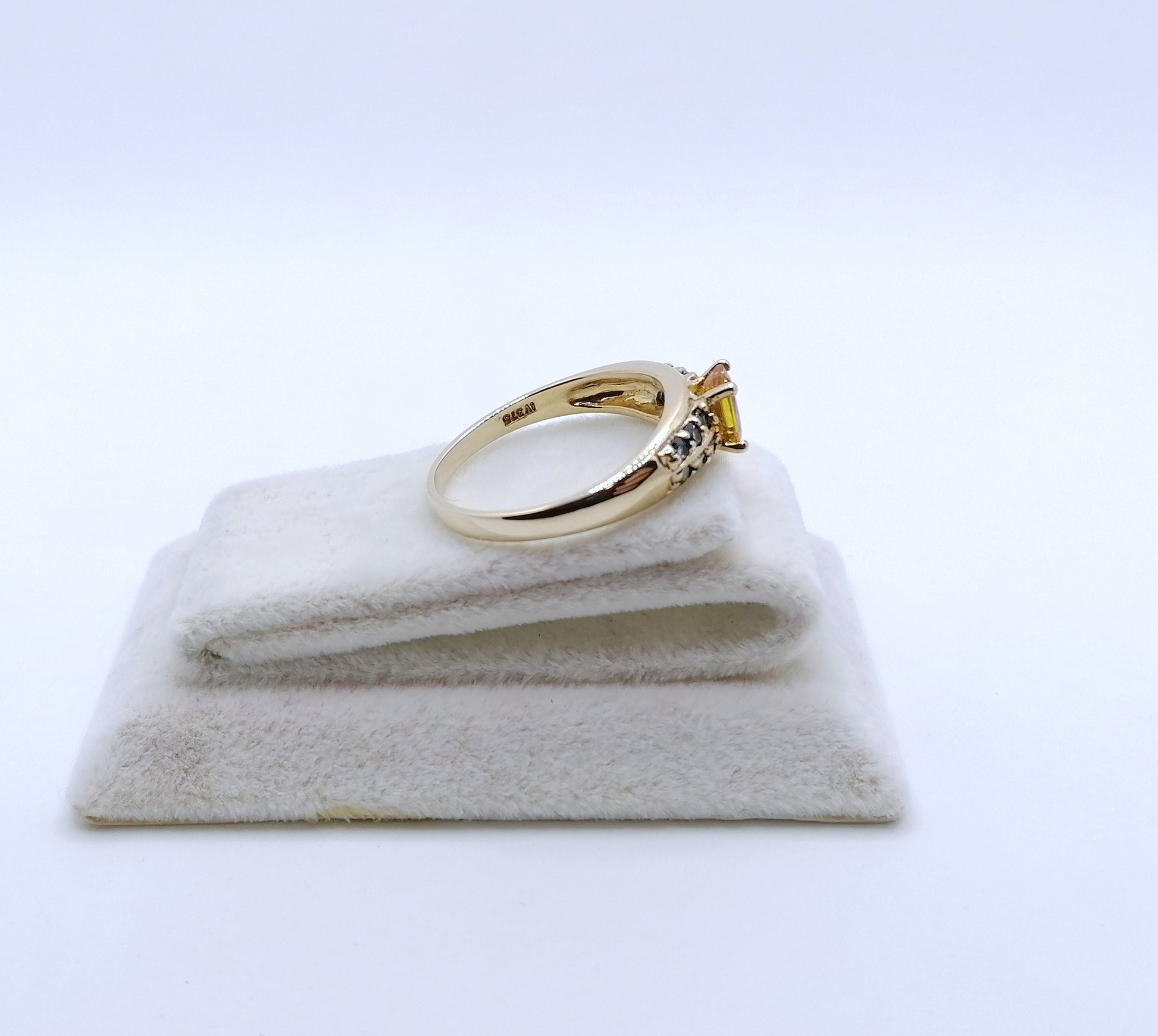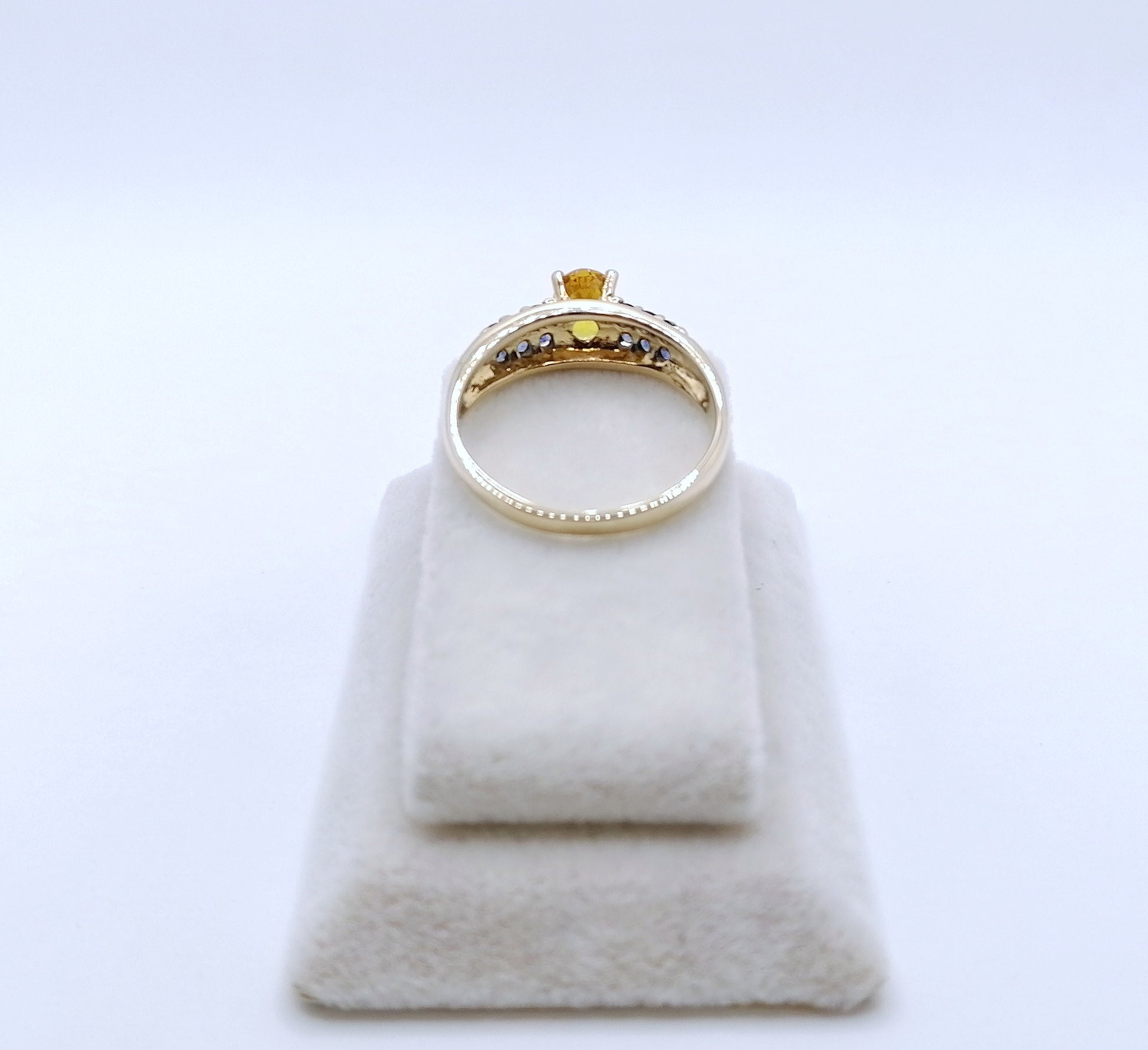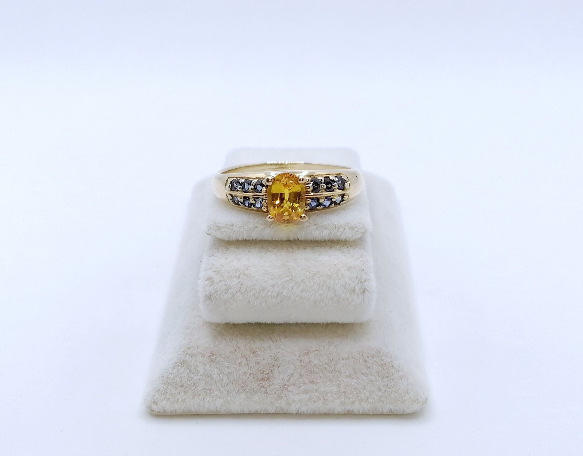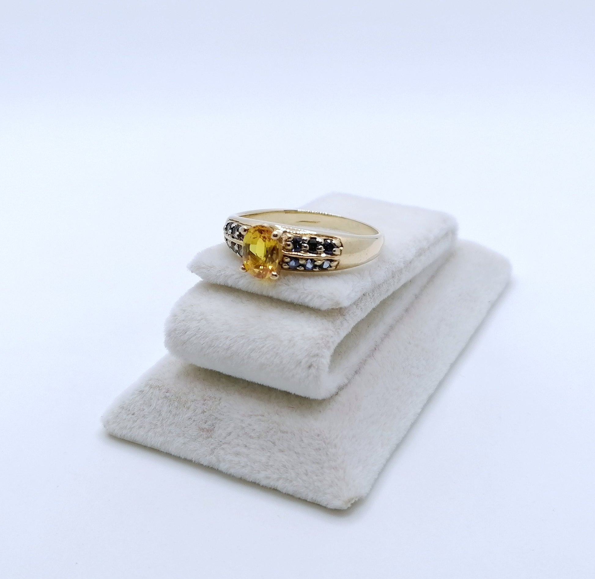 Gold Damenring mit einem gelben und 12 blauen Saphir Edelsteinen. Der Ring ist aus 375er 9 karat Gold gefertigt.