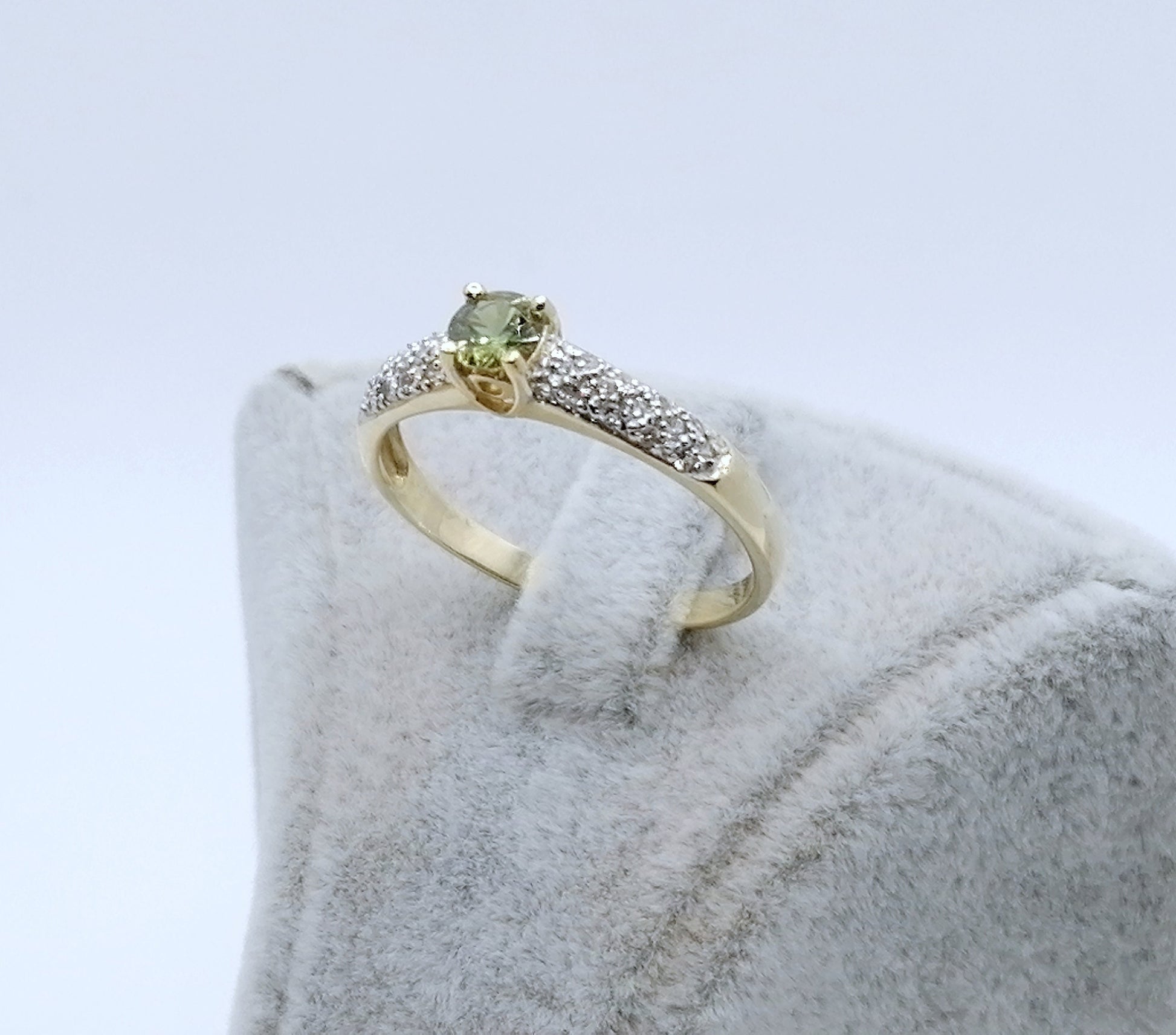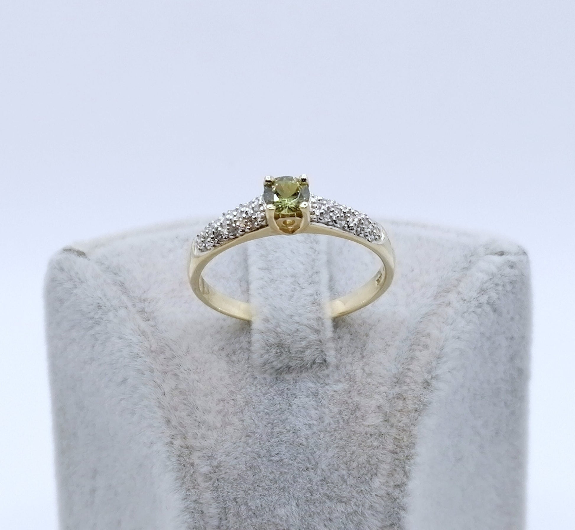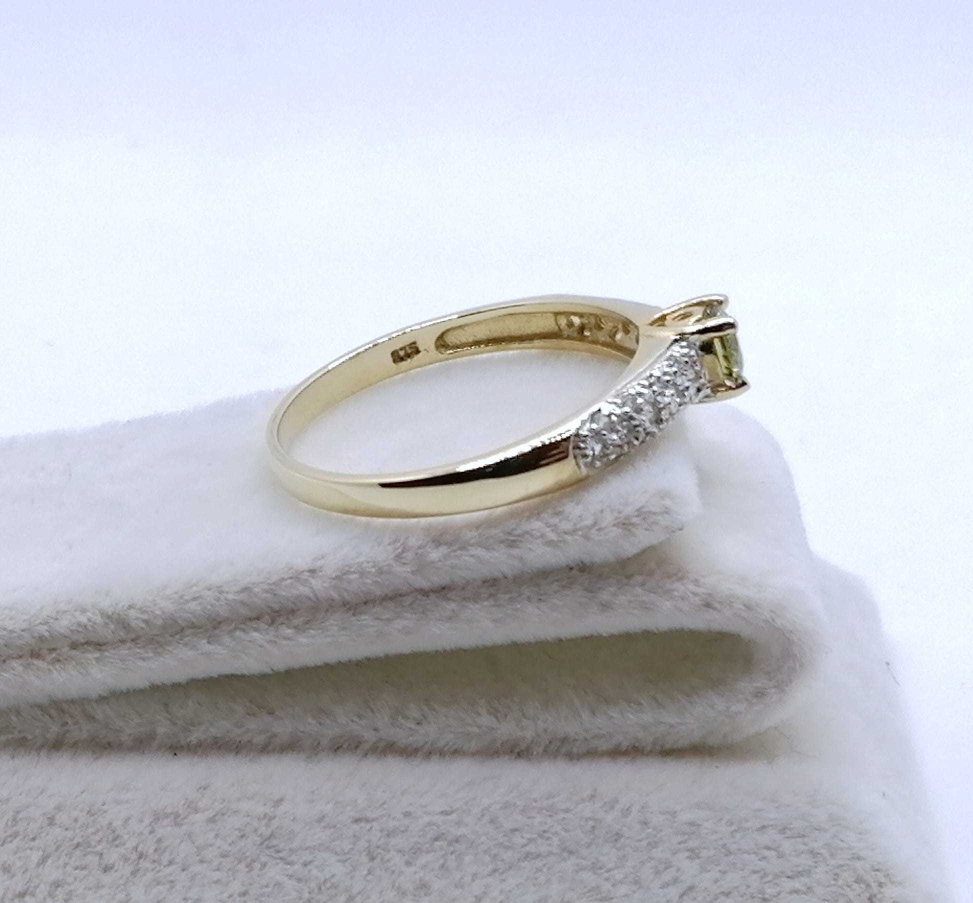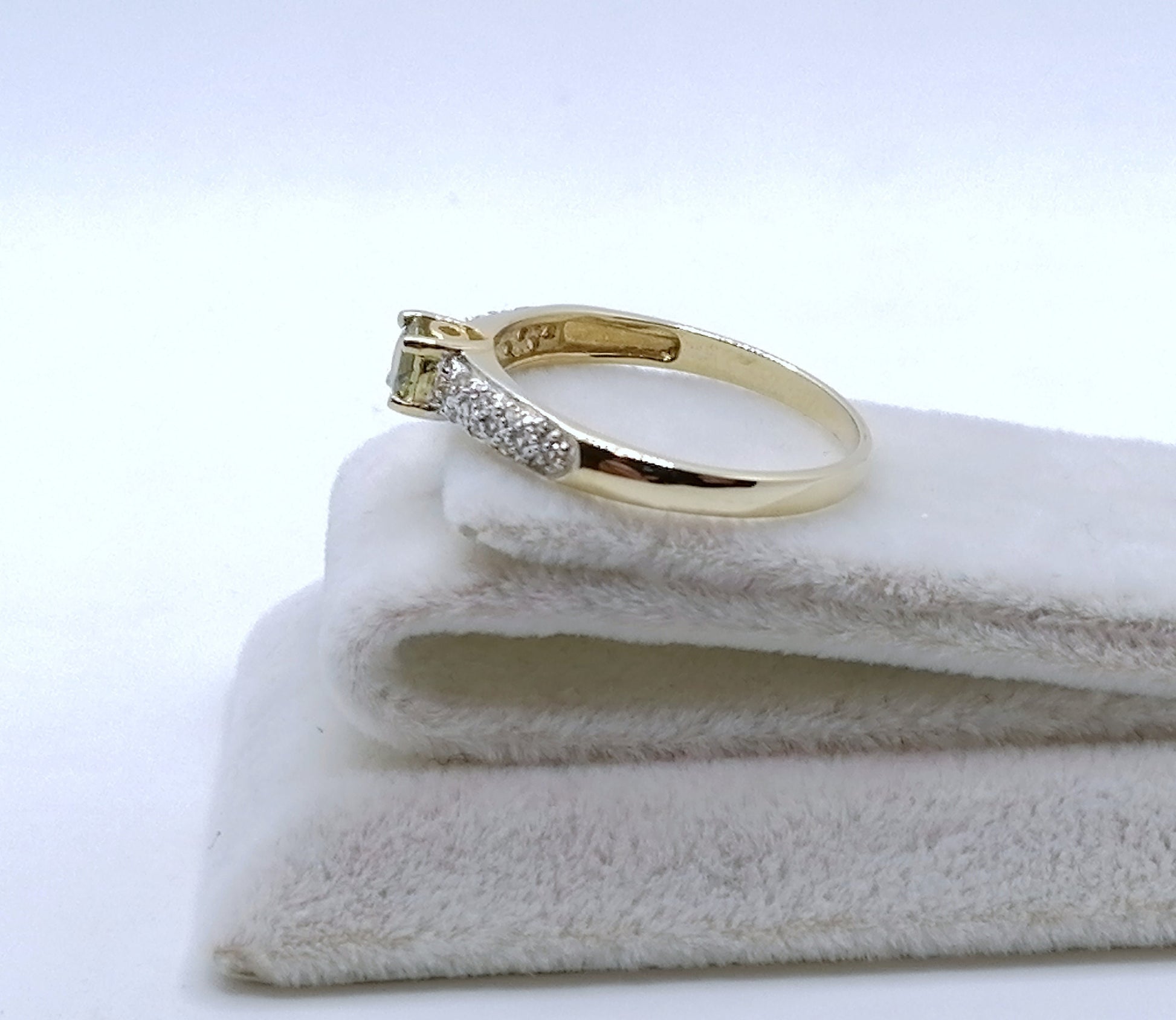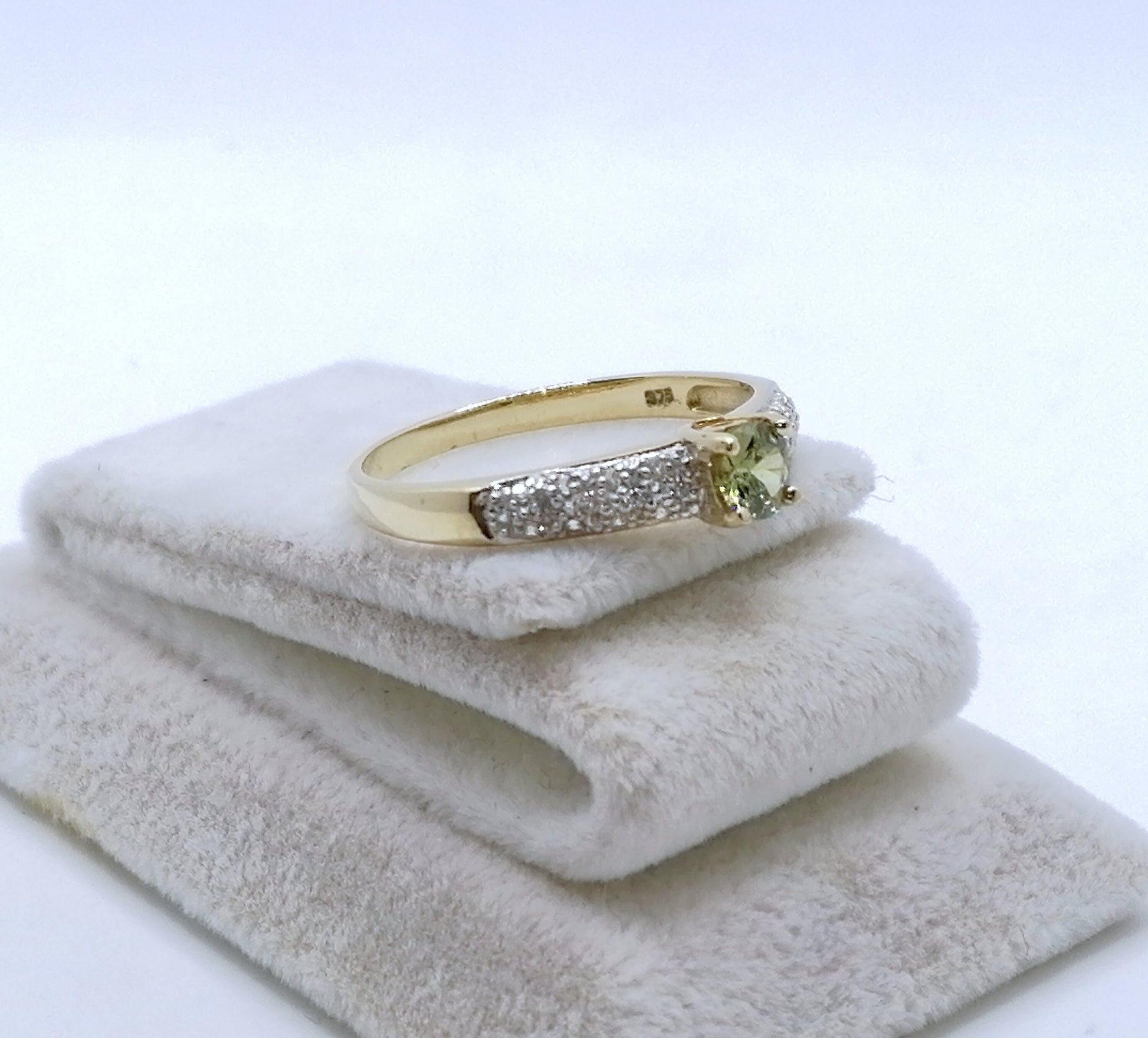 Gold Damenring mit einem grünen Amethyst (Prasiolith) und zahlreichen funkelnden Zirkonen. Der Ring ist aus 375er 9 Karat Gold gefertigt.