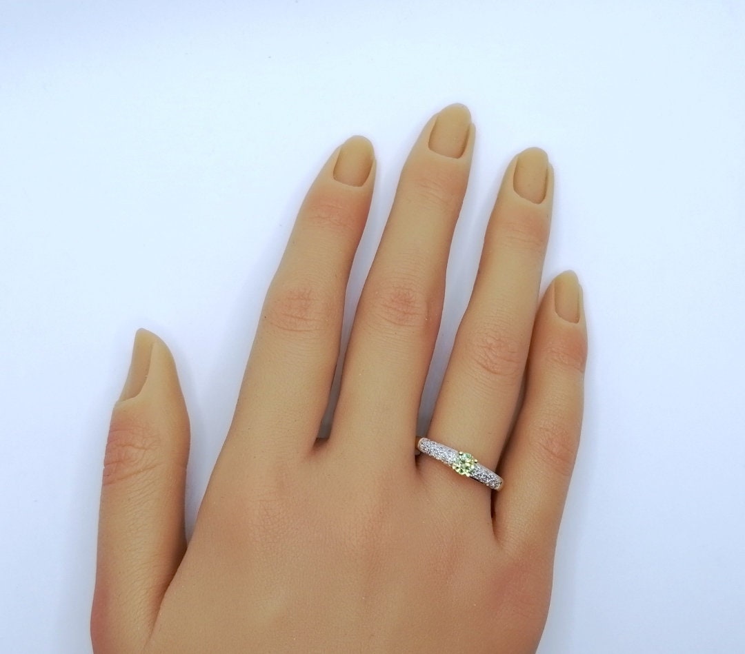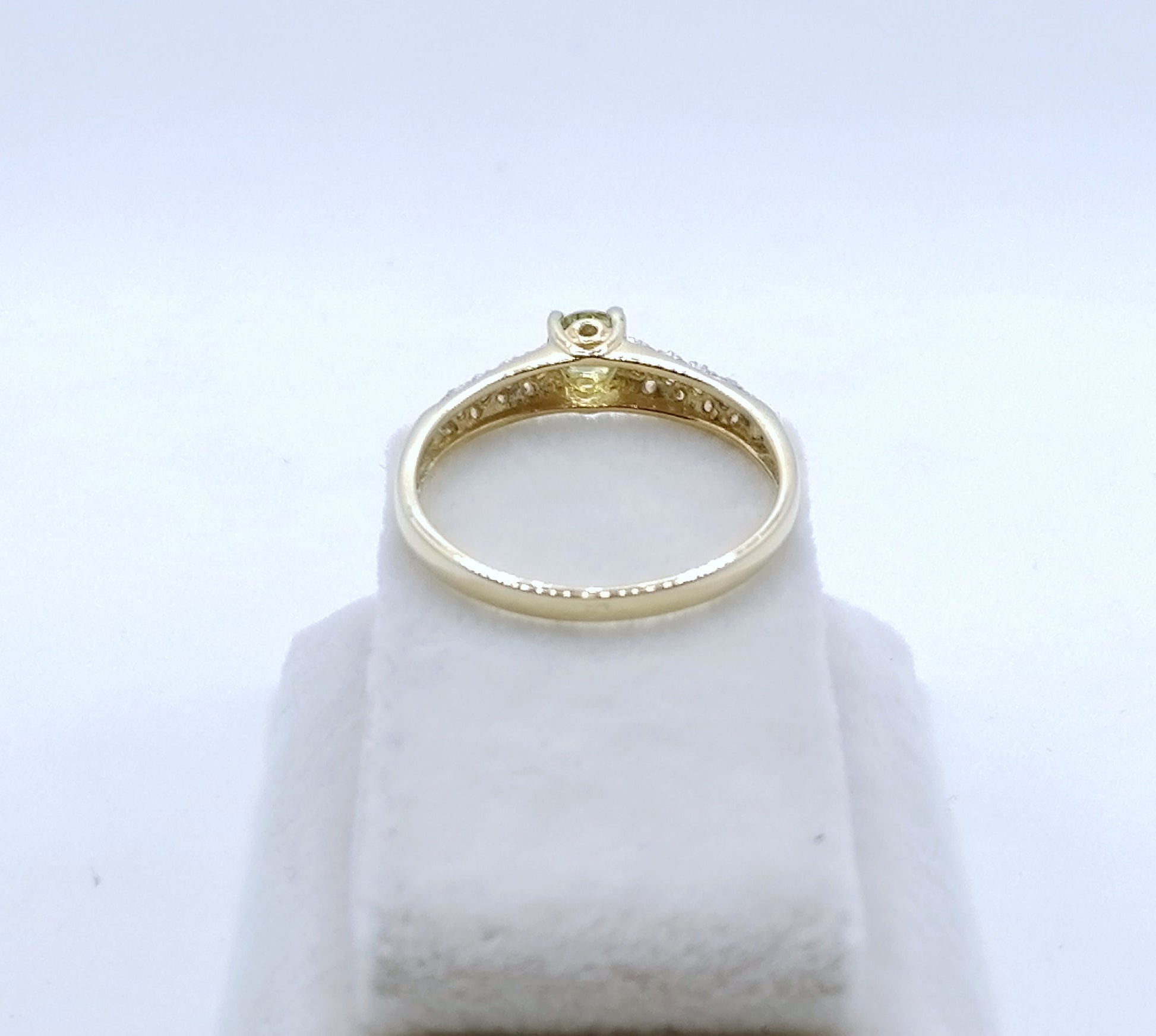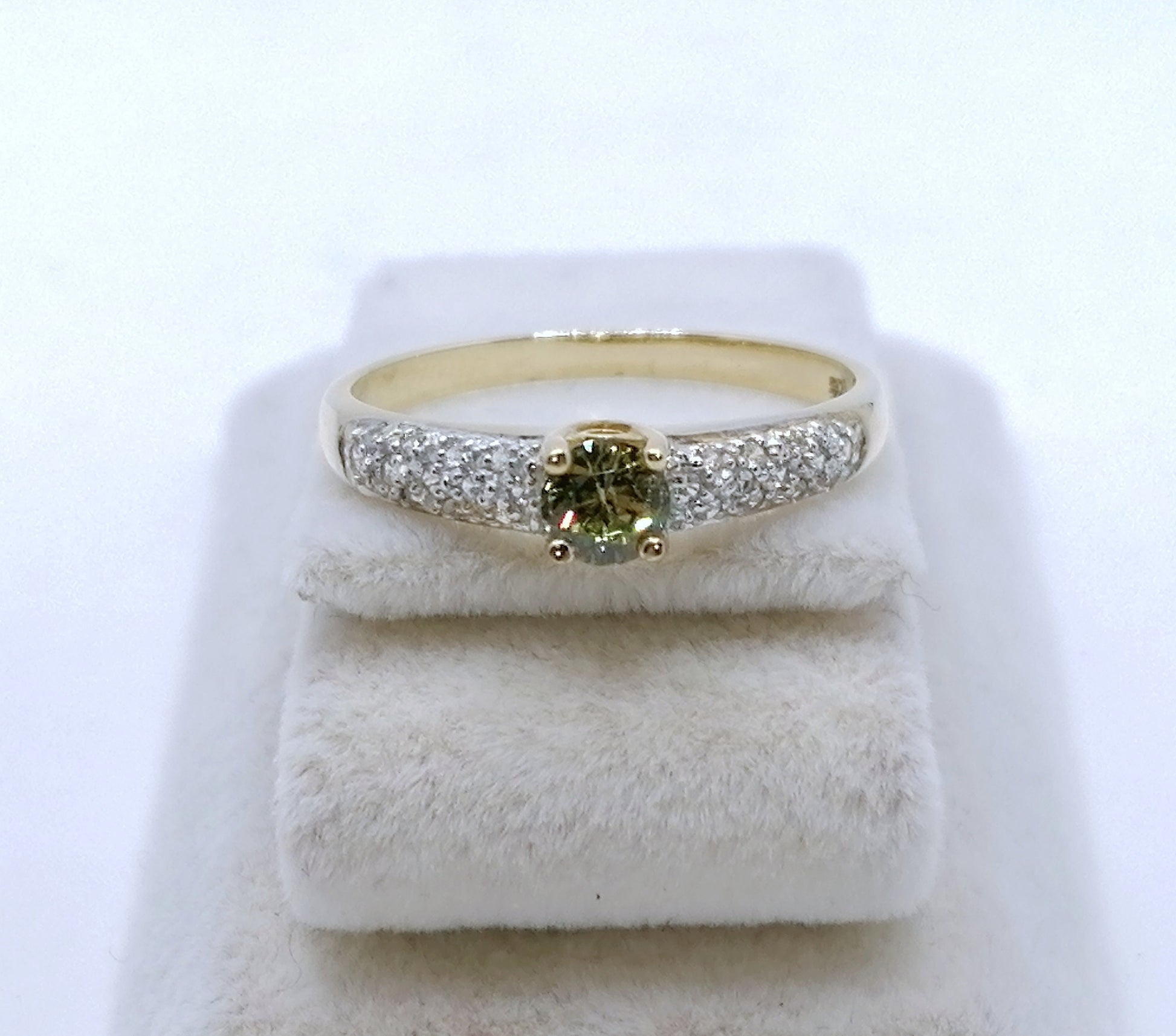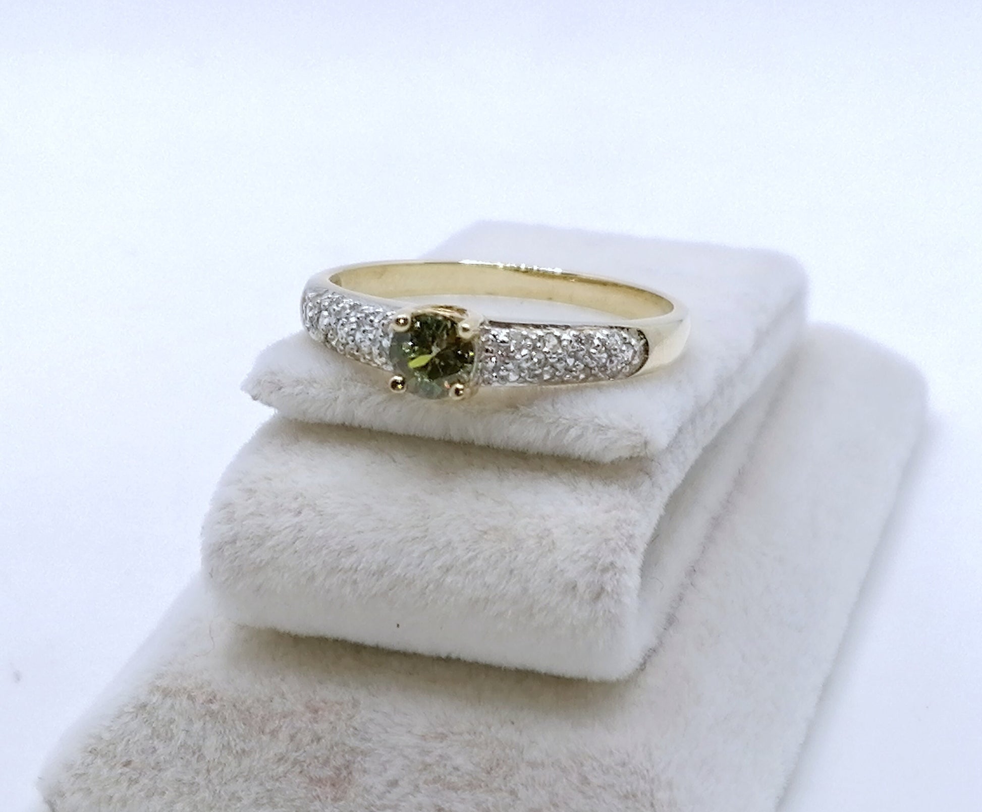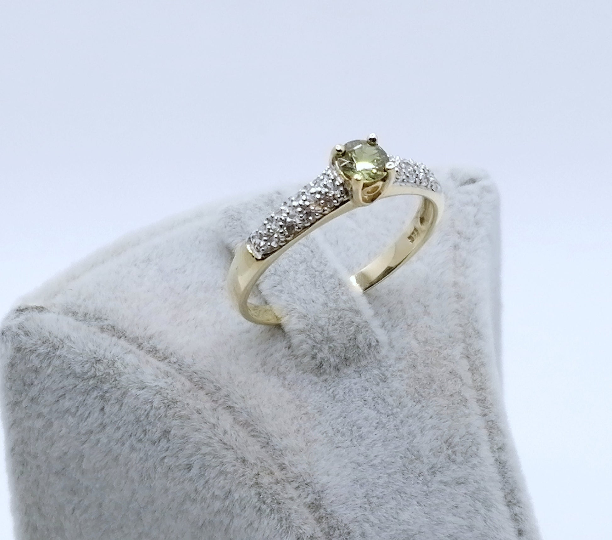 Gold Damenring mit einem grünen Amethyst (Prasiolith) und zahlreichen funkelnden Zirkonen. Der Ring ist aus 375er 9 Karat Gold gefertigt.