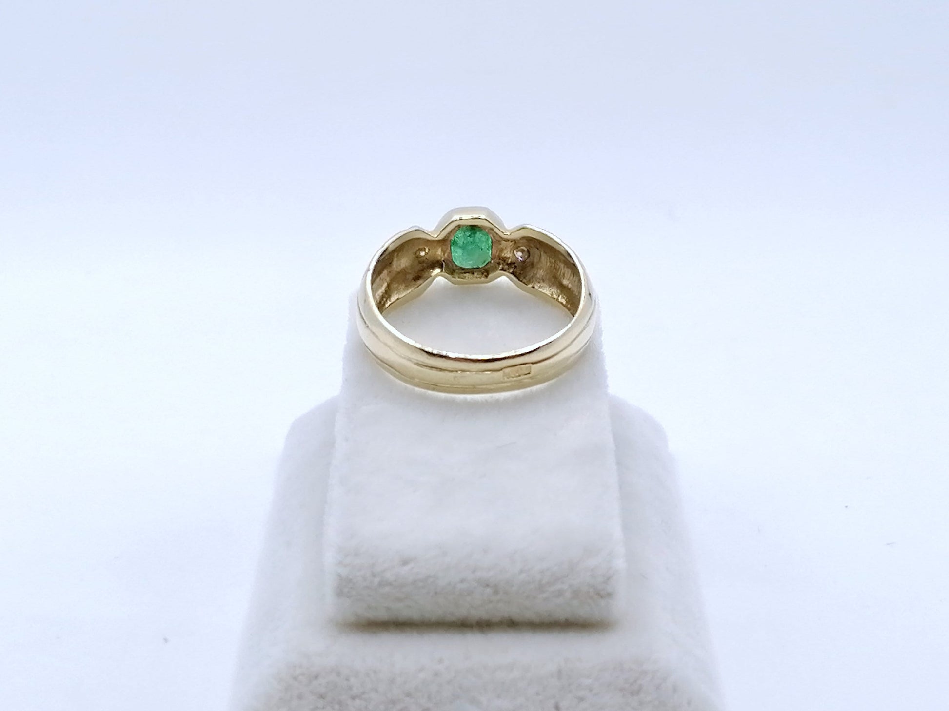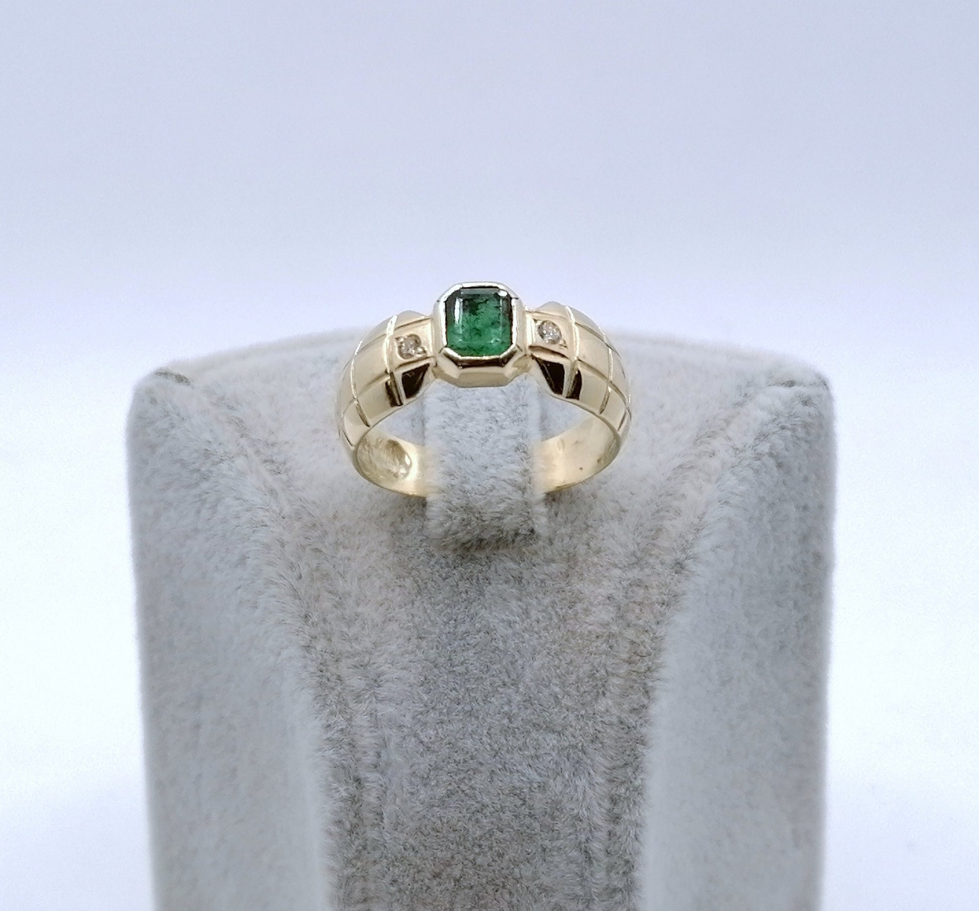 Vintage UdSSR Sowjet Damenring mit einem Smaragd Edelstein und zwei funkelnden Brillanten. Der Ring ist aus 583er 14 Karat Gold gefertigt und befindet sich in einem neuwertigen Zustand.