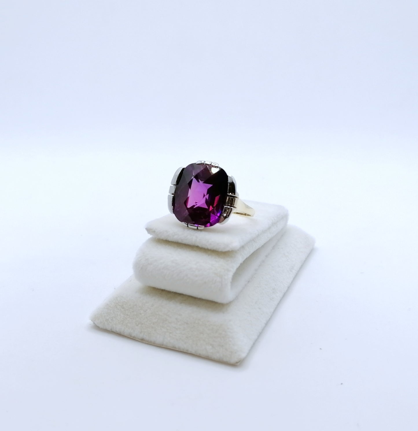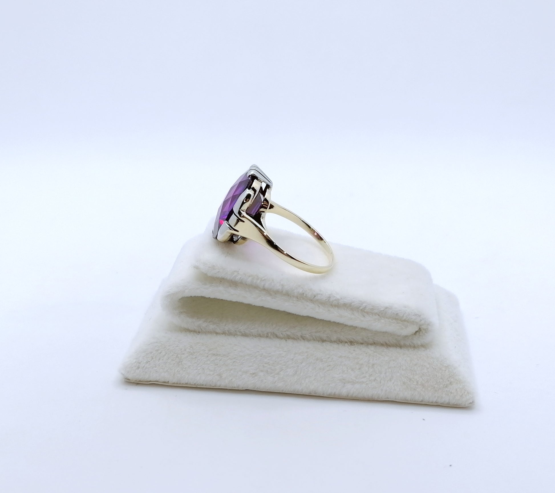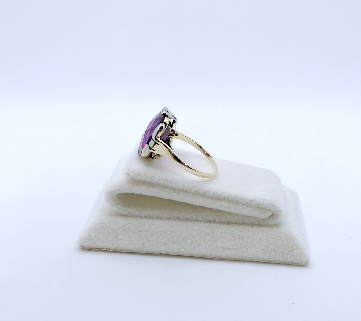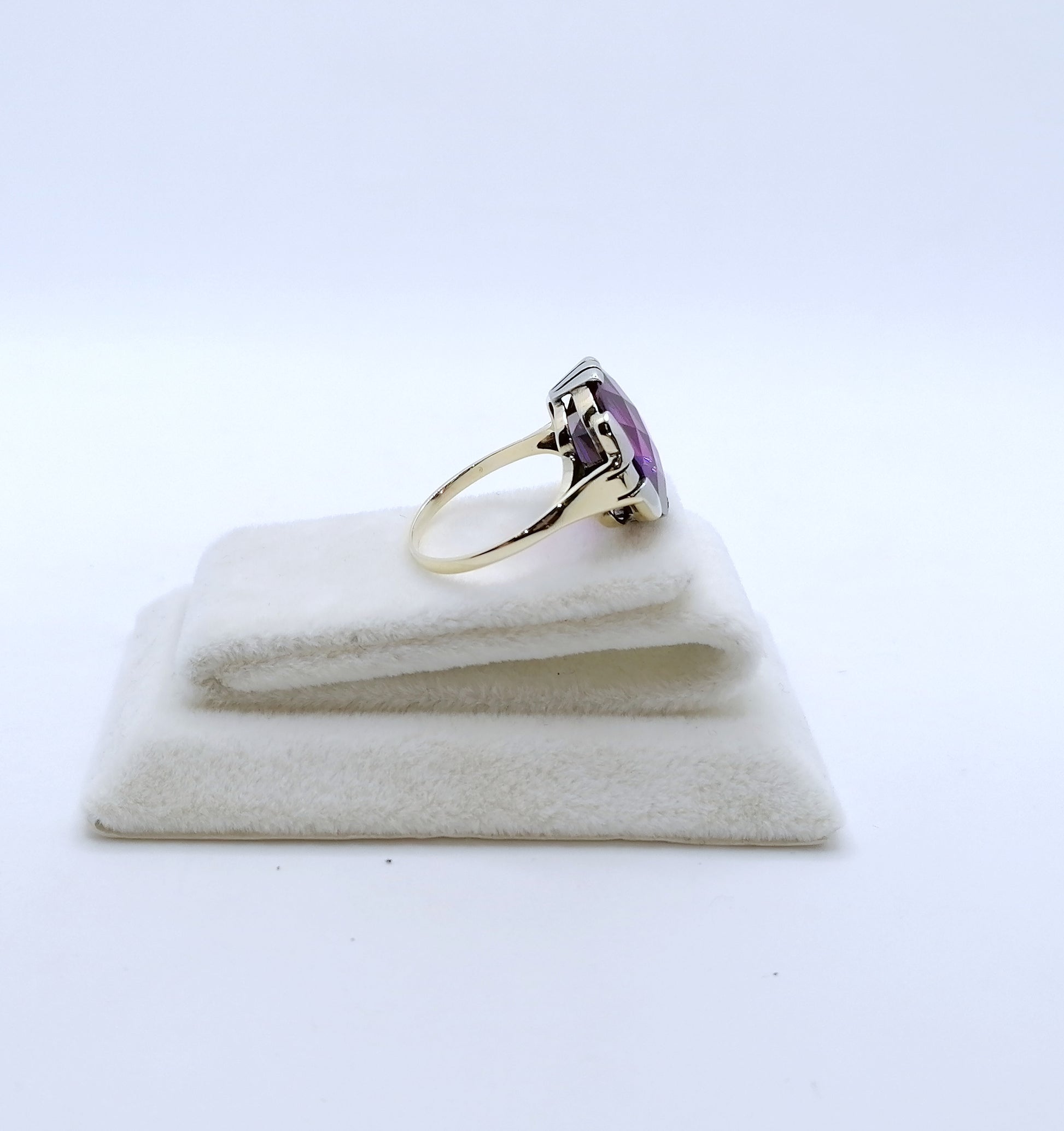 Prunkvoller Gold Damenring mit einem Alexandrit Edelstein. Der Ring ist aus 585er 14 karat Gold gefertigt. Die Fassungen ist teils aus Weißgold.