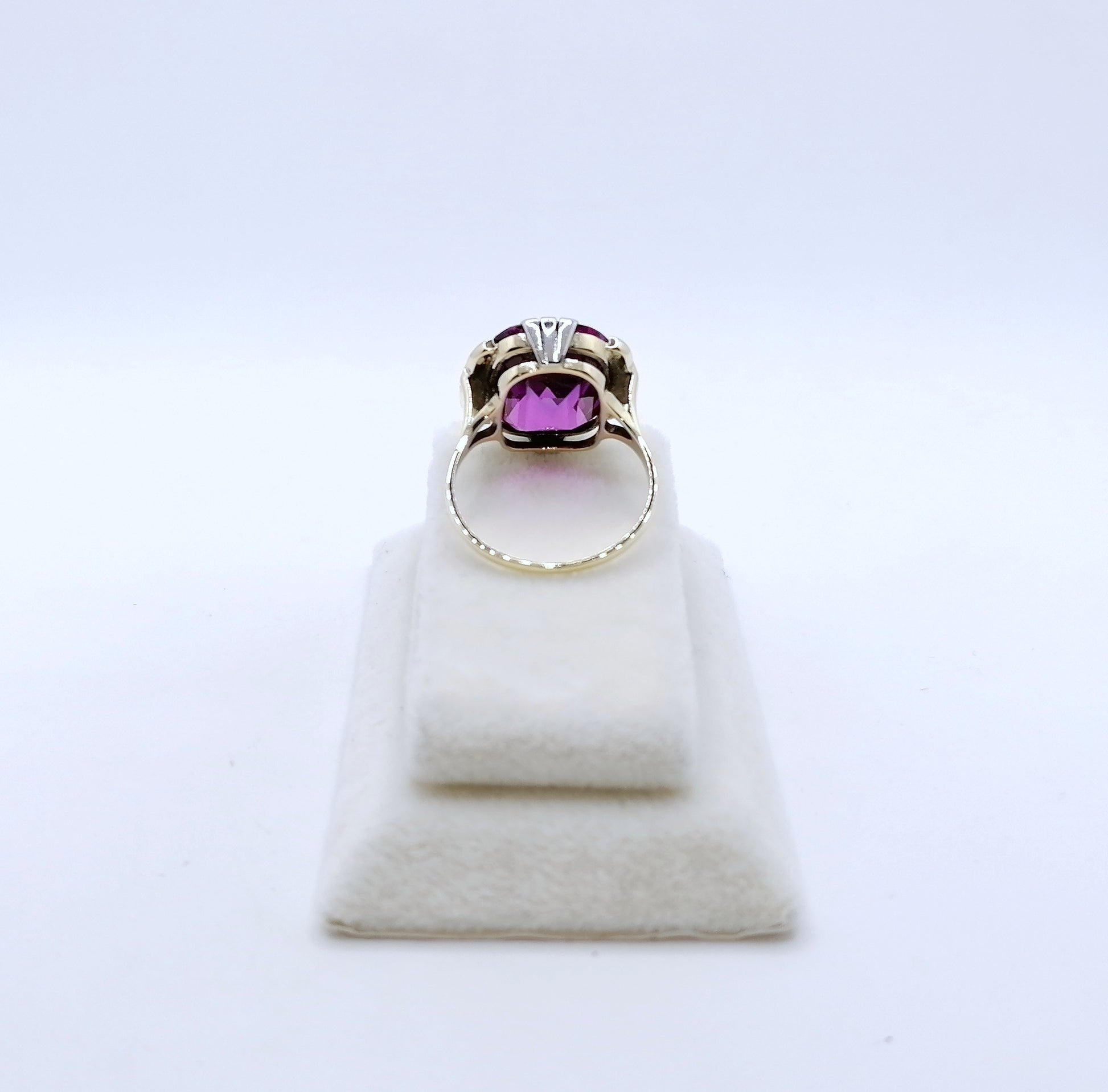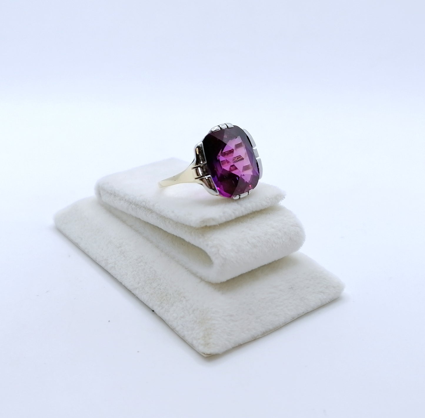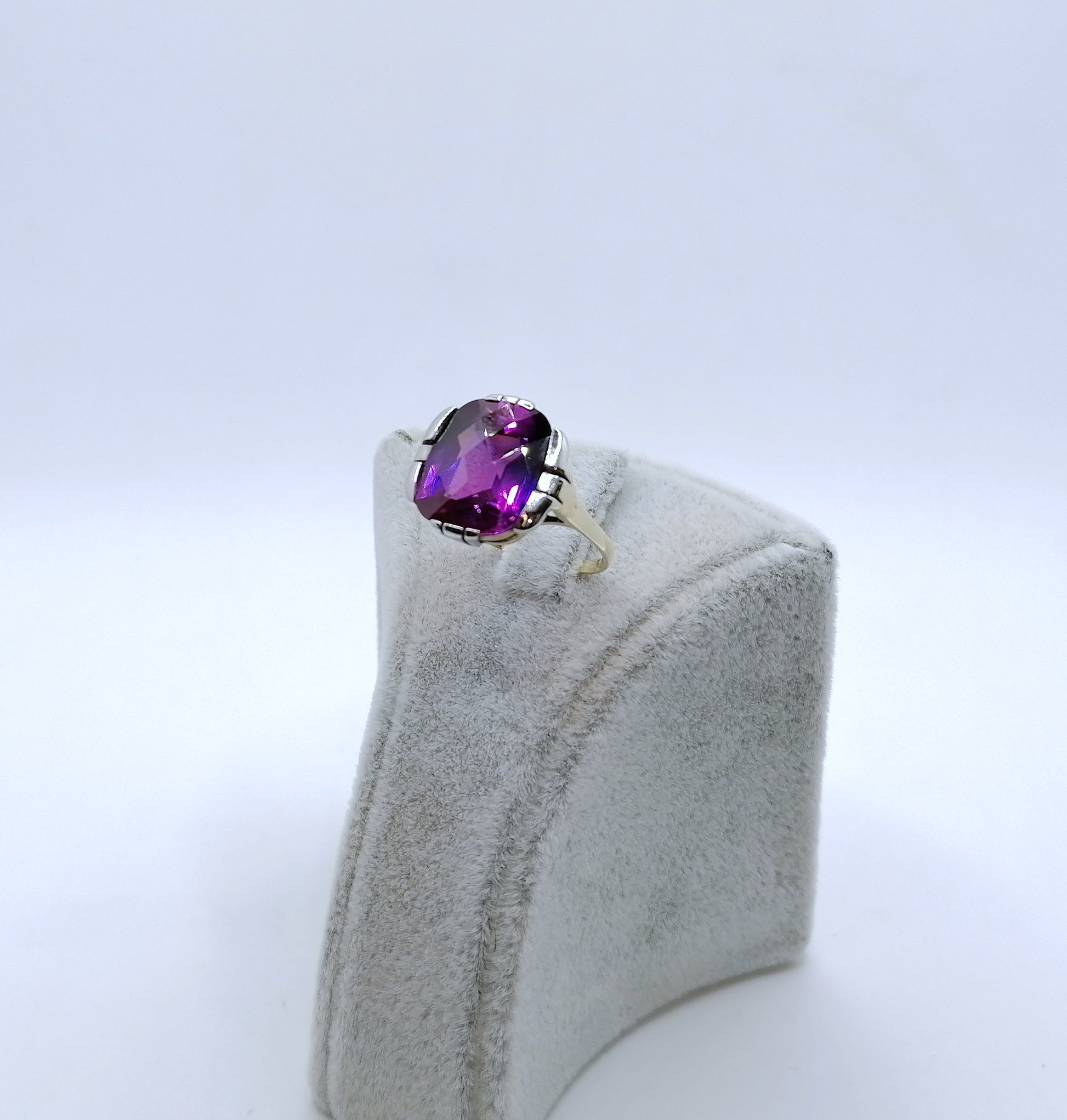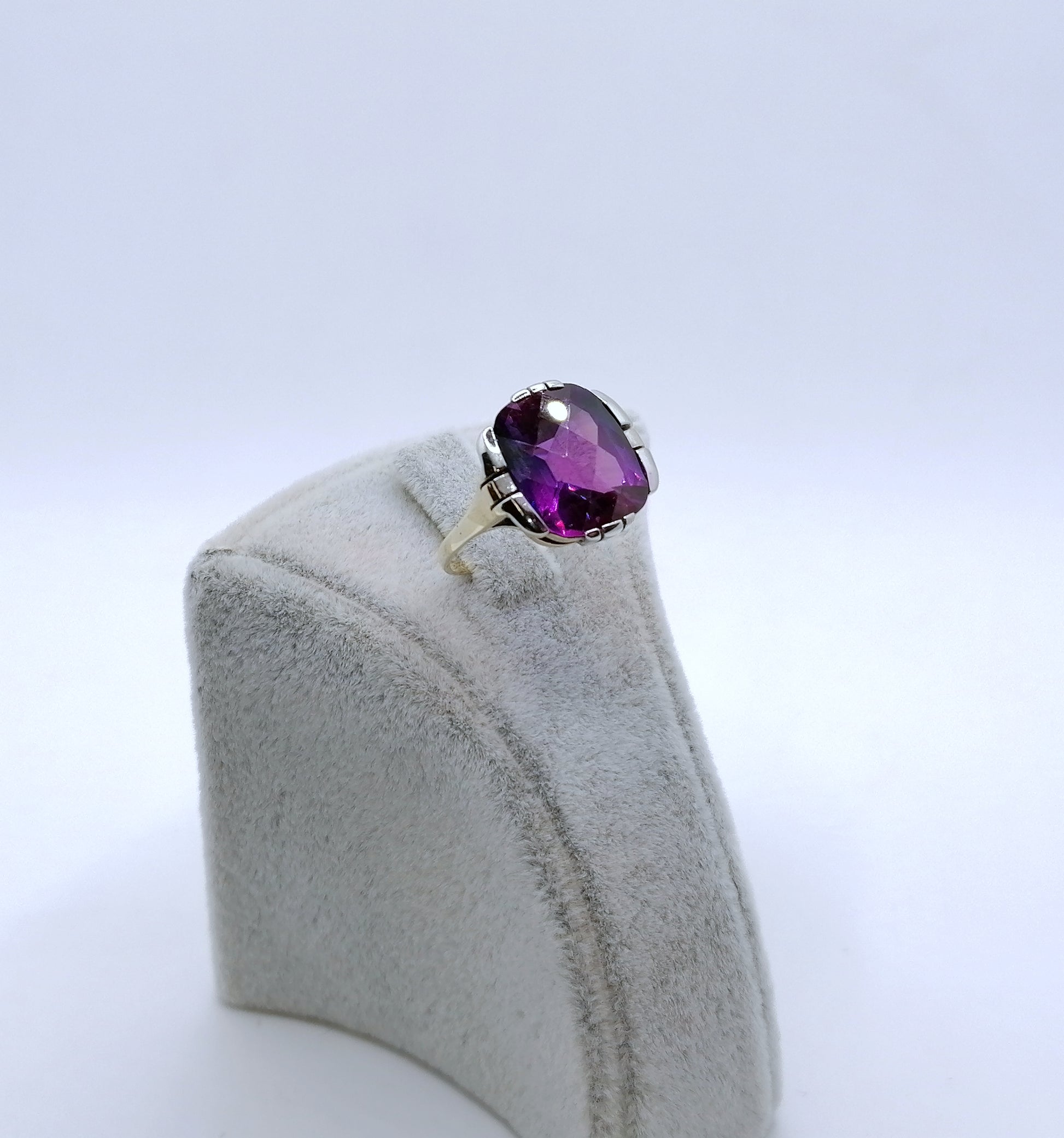 Prunkvoller Gold Damenring mit einem Alexandrit Edelstein. Der Ring ist aus 585er 14 karat Gold gefertigt. Die Fassungen ist teils aus Weißgold.