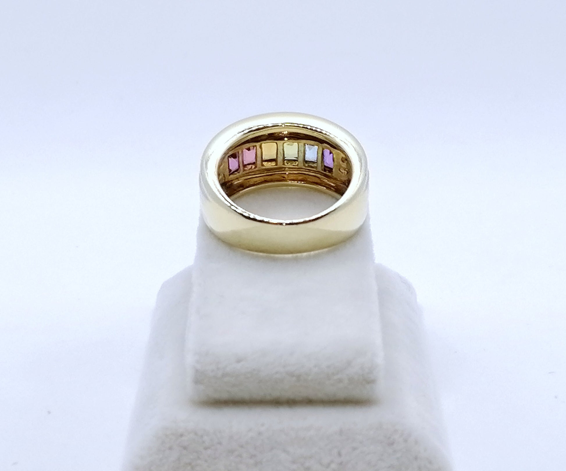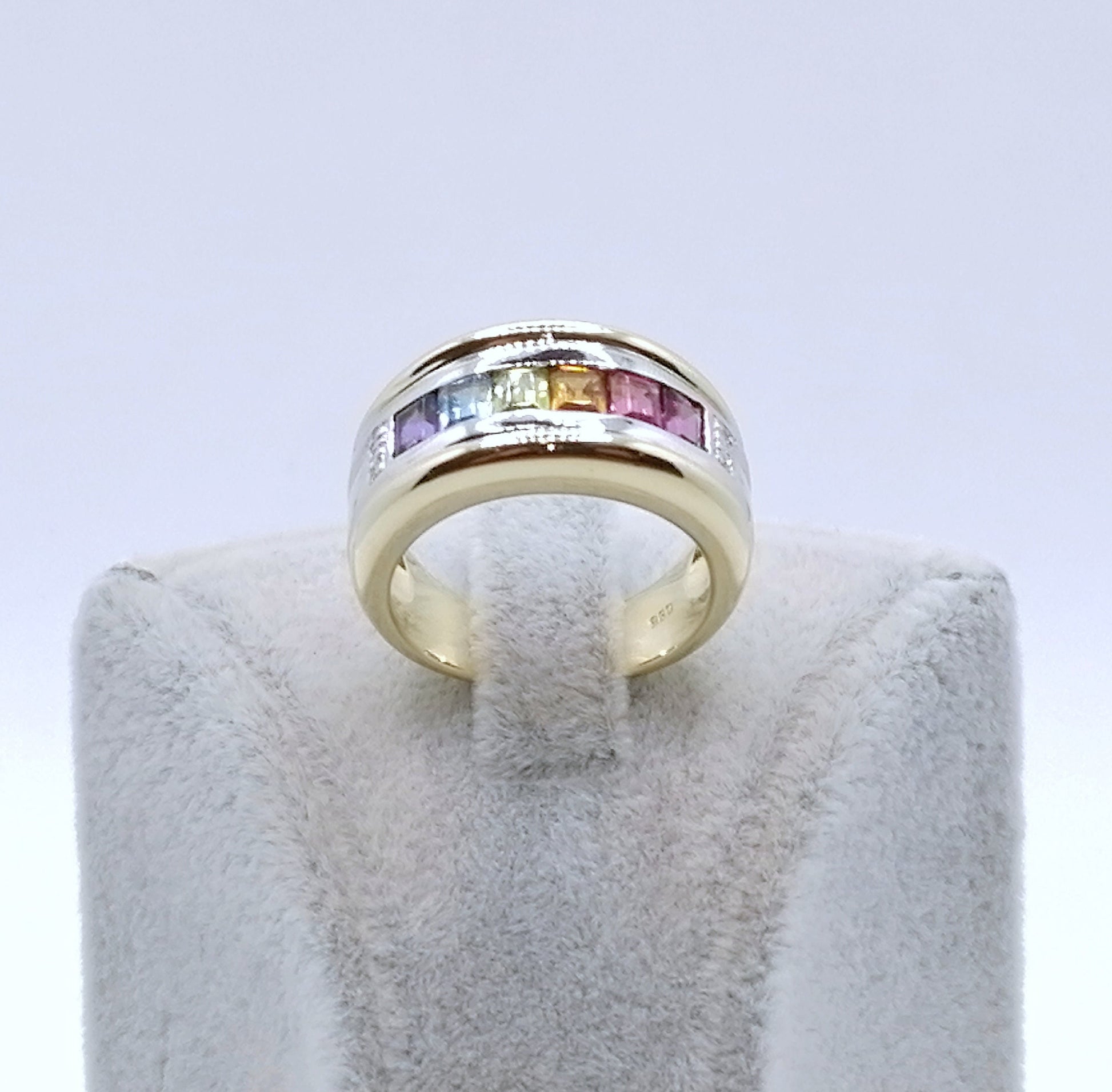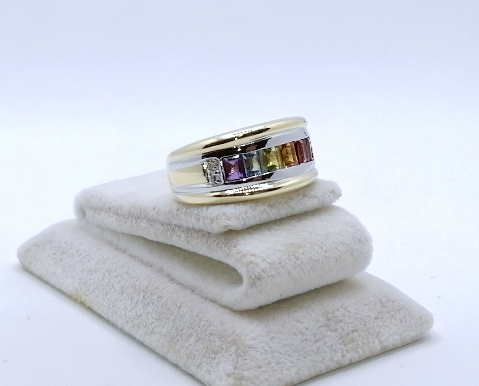 Gold Damenring mit einem Tourmalin, Topas, Citrin, Rhodolith, Amethyst und Peridot. Des Weiteren ist der Ring mit 4 Diamantsplitter besetzt. Der Ring ist aus 585er 14 karat Gold gefertigt.