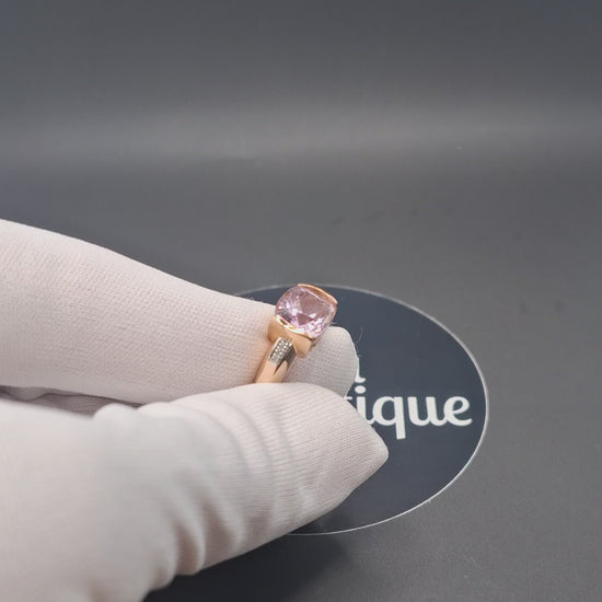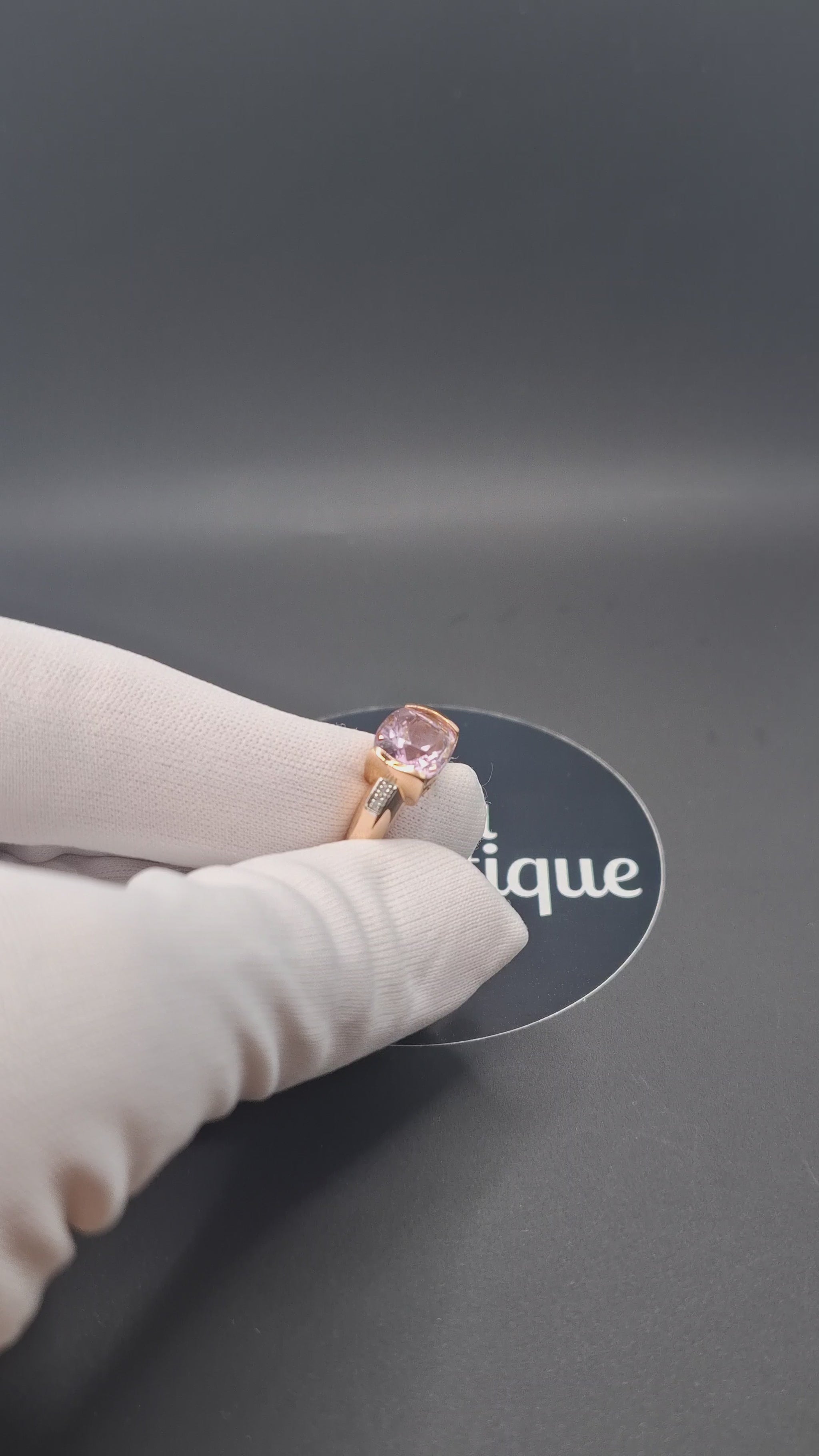 Gold Damenring mit einem Kunzit Edelstein und funkelnden Zirkonen. Der Ring ist aus 585er 14 karat Rosegold gefertigt.