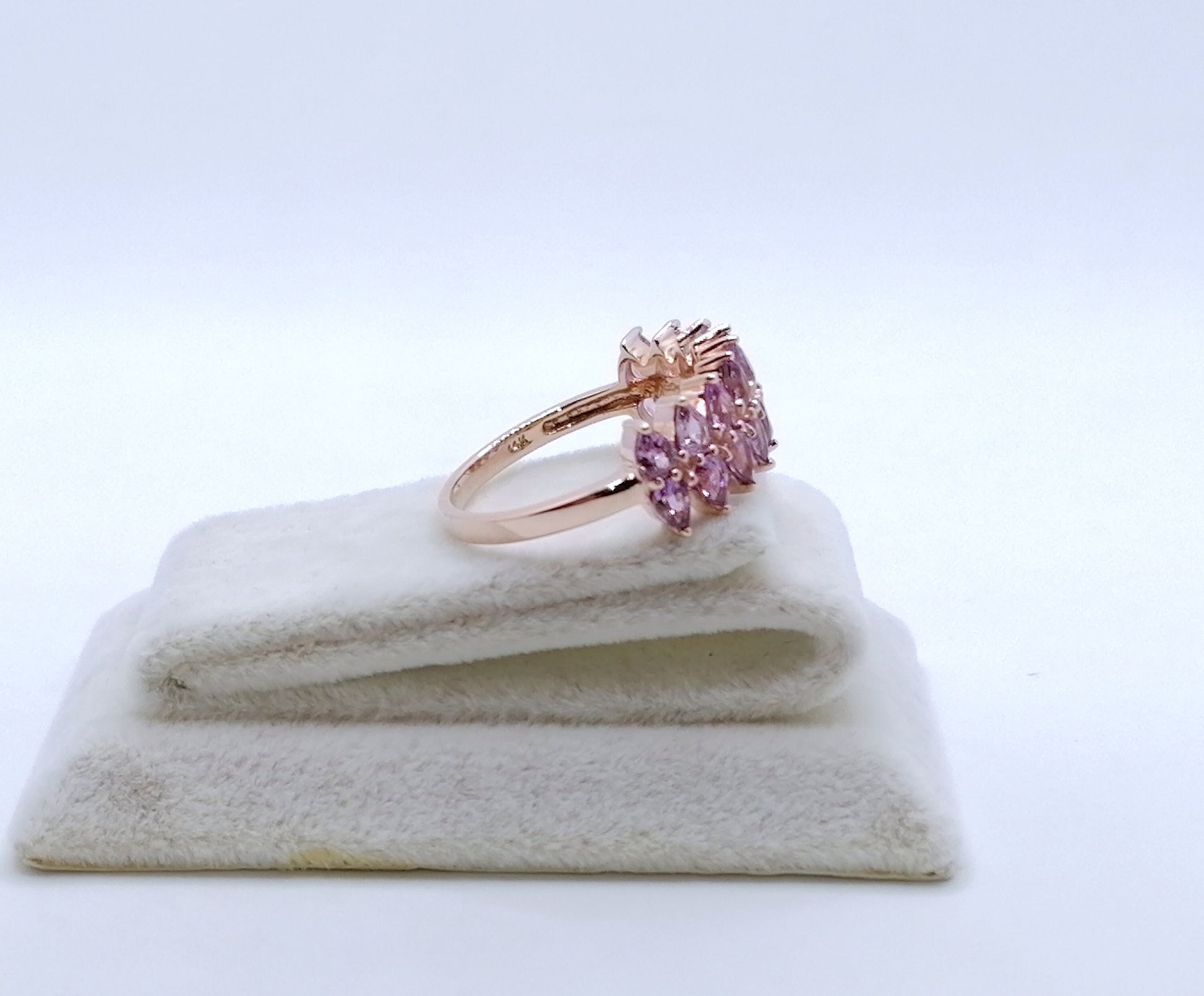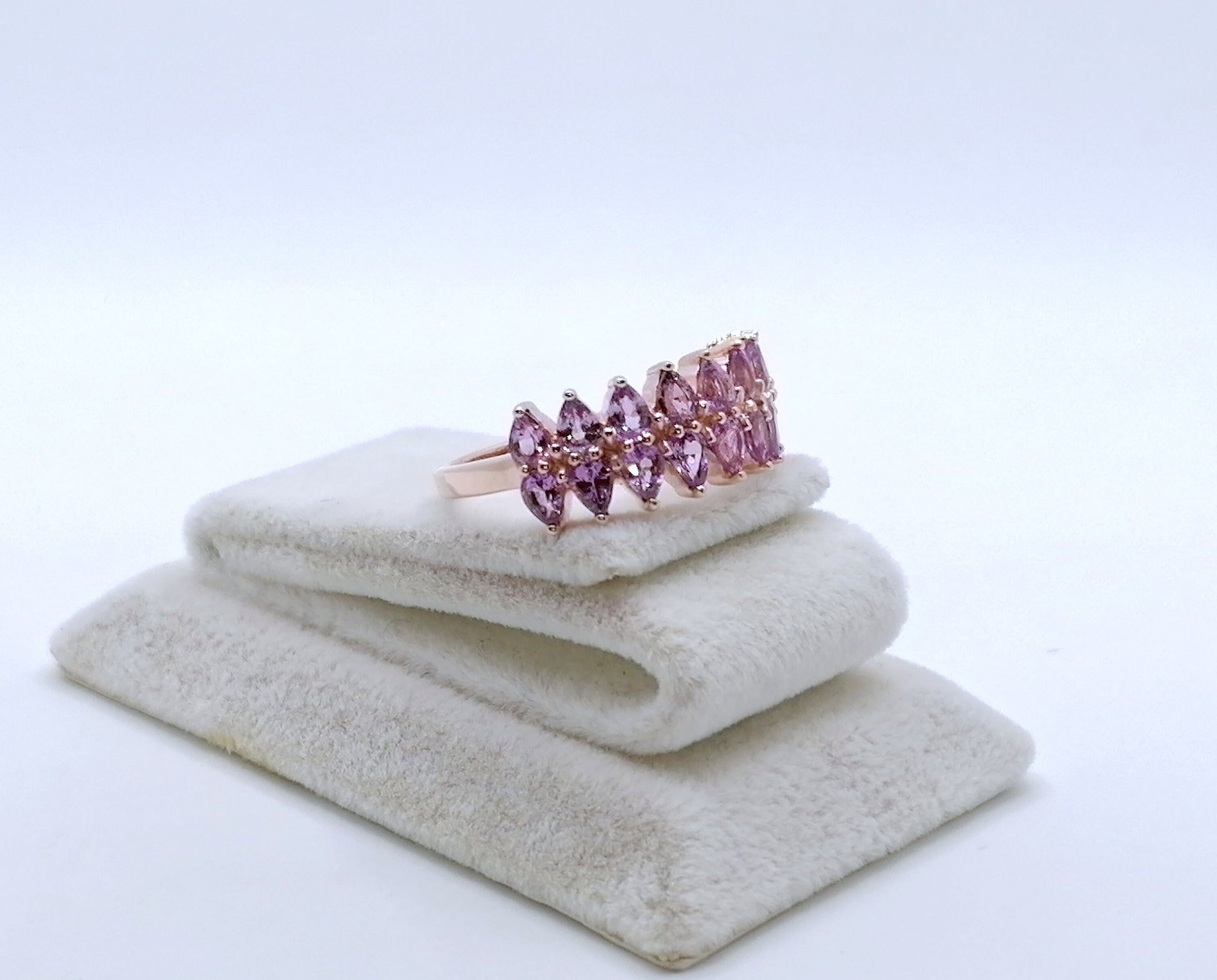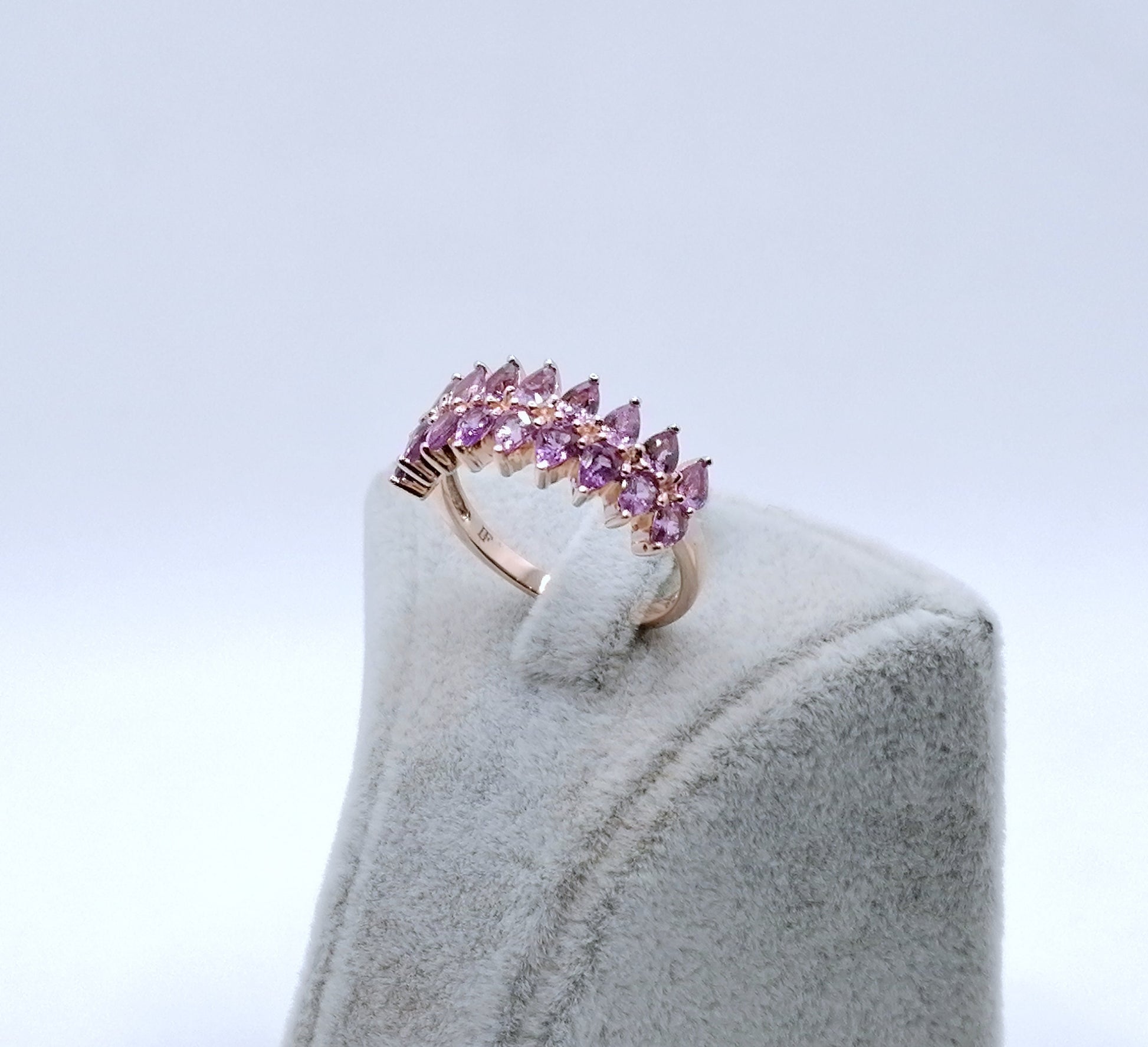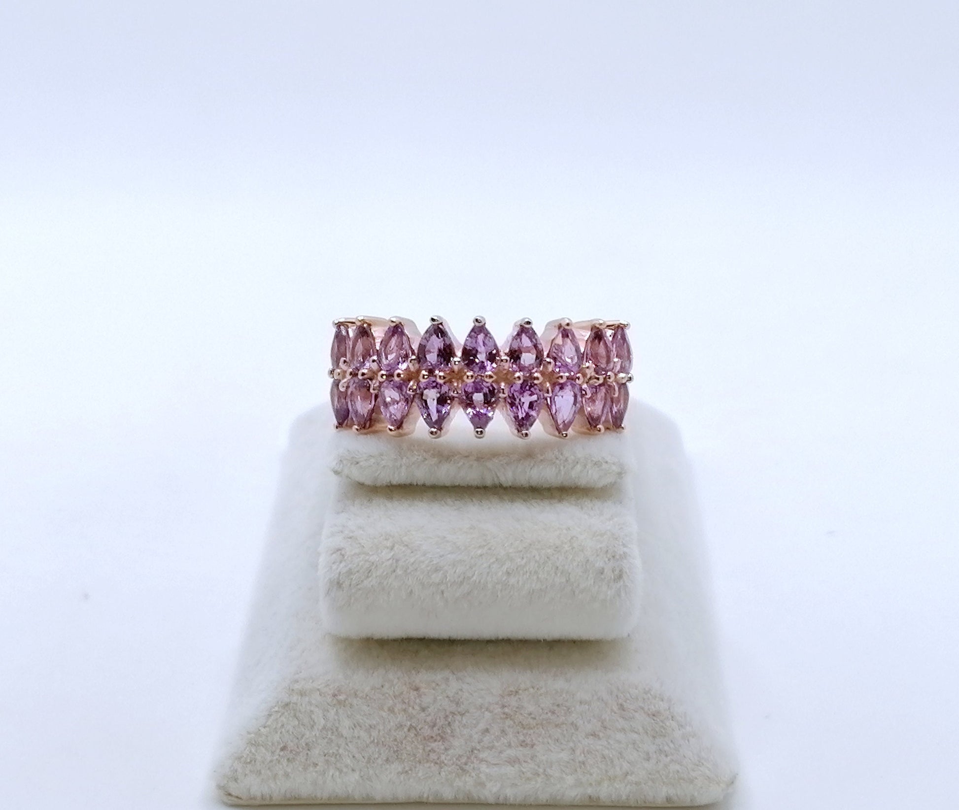 Gold Damenring mit Purpur Saphir Edelsteinen. Der Ring ist aus 585er 14 karat Rosegold gefertigt.