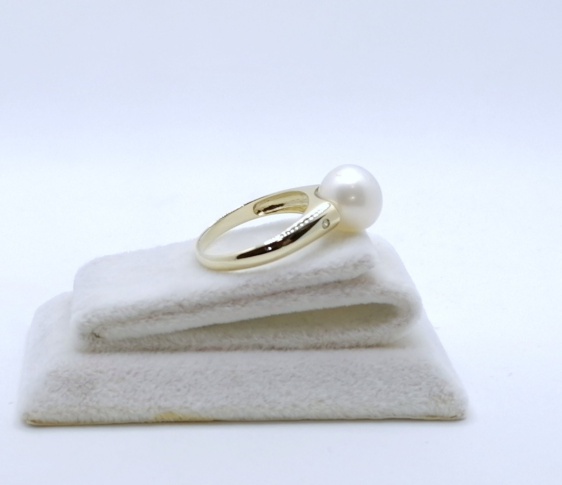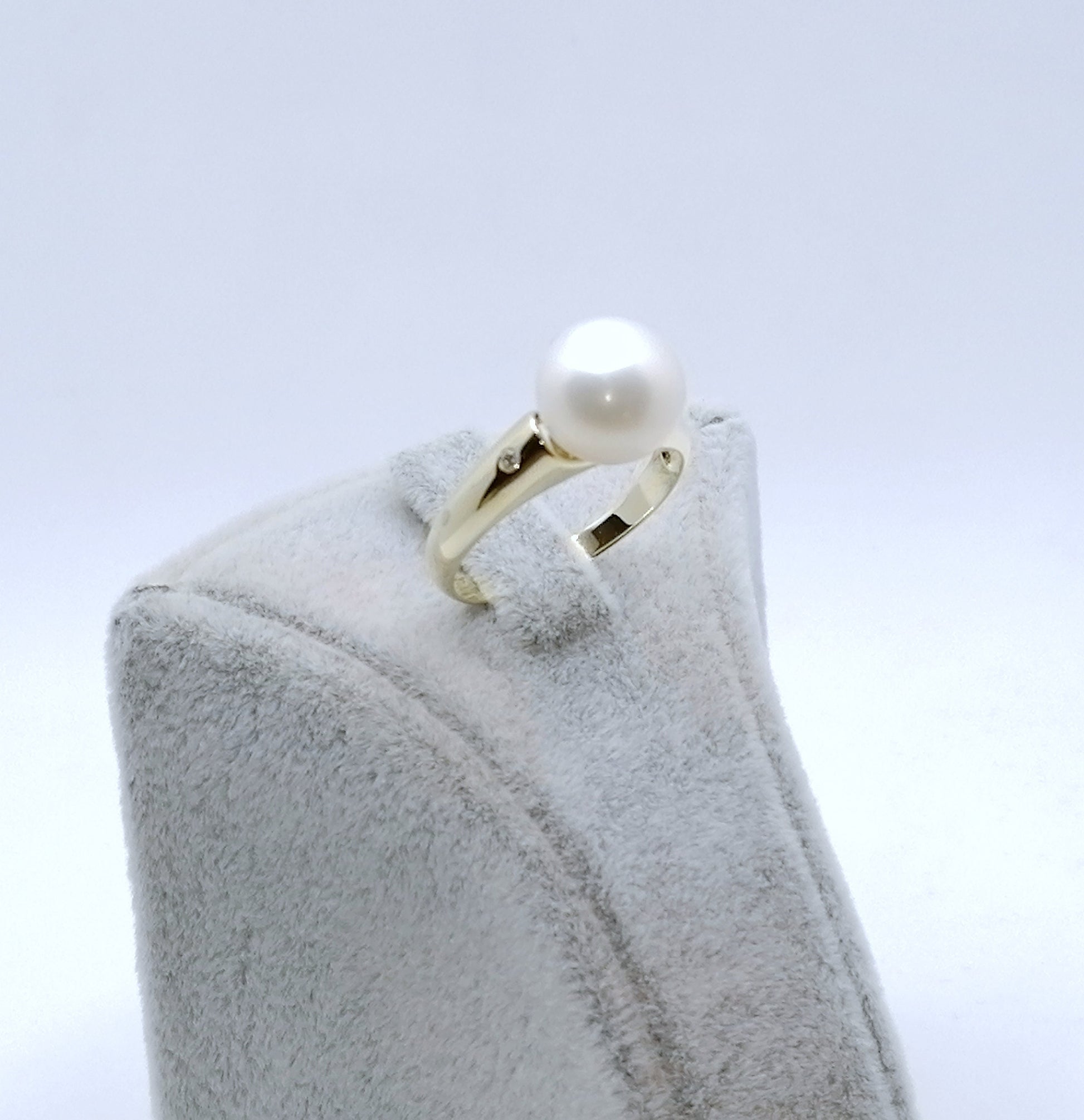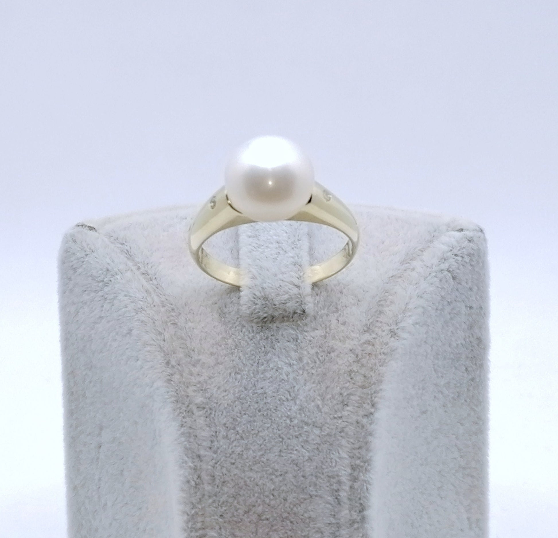 Damenring mit einer Perle und zwei funkelnden Diamantsplitter. Der Ring ist aus 585er 14 karat Gold gefertigt.