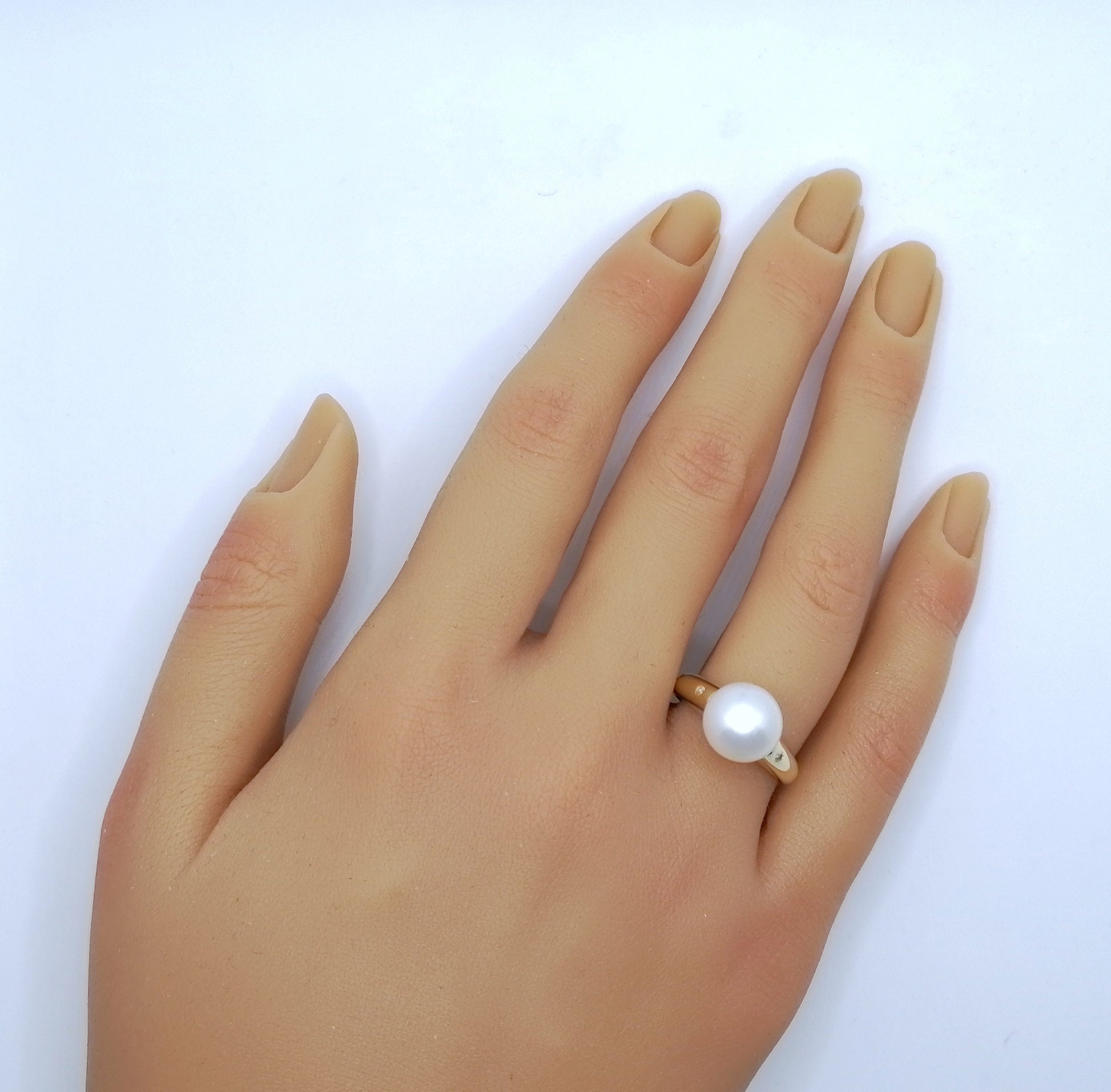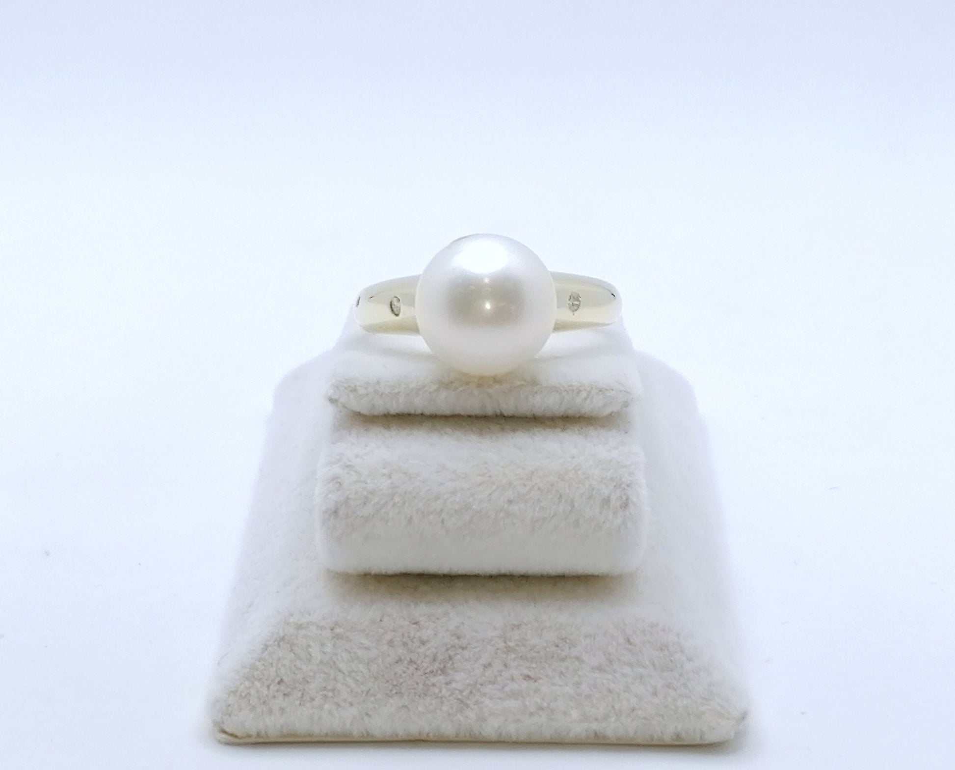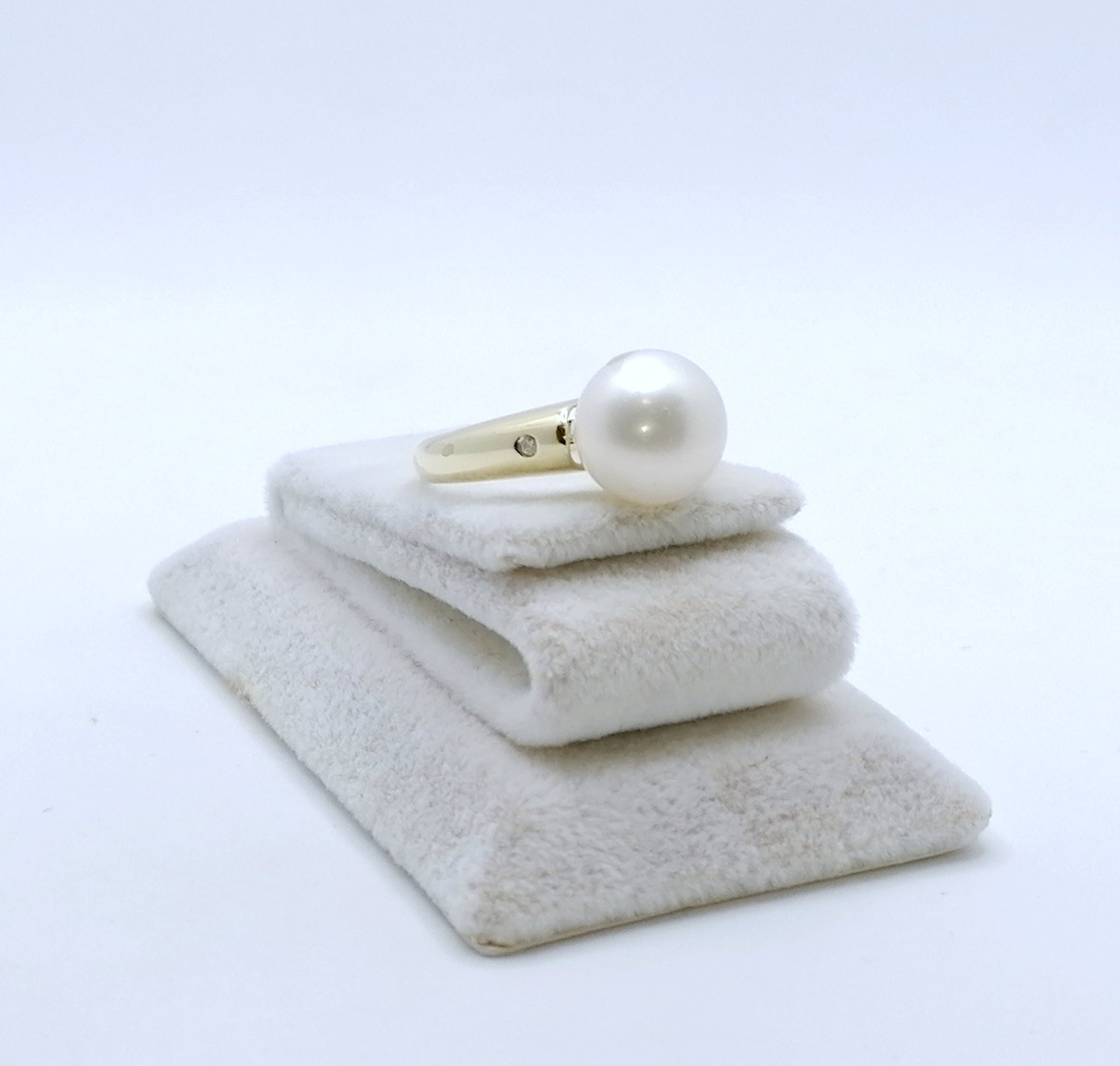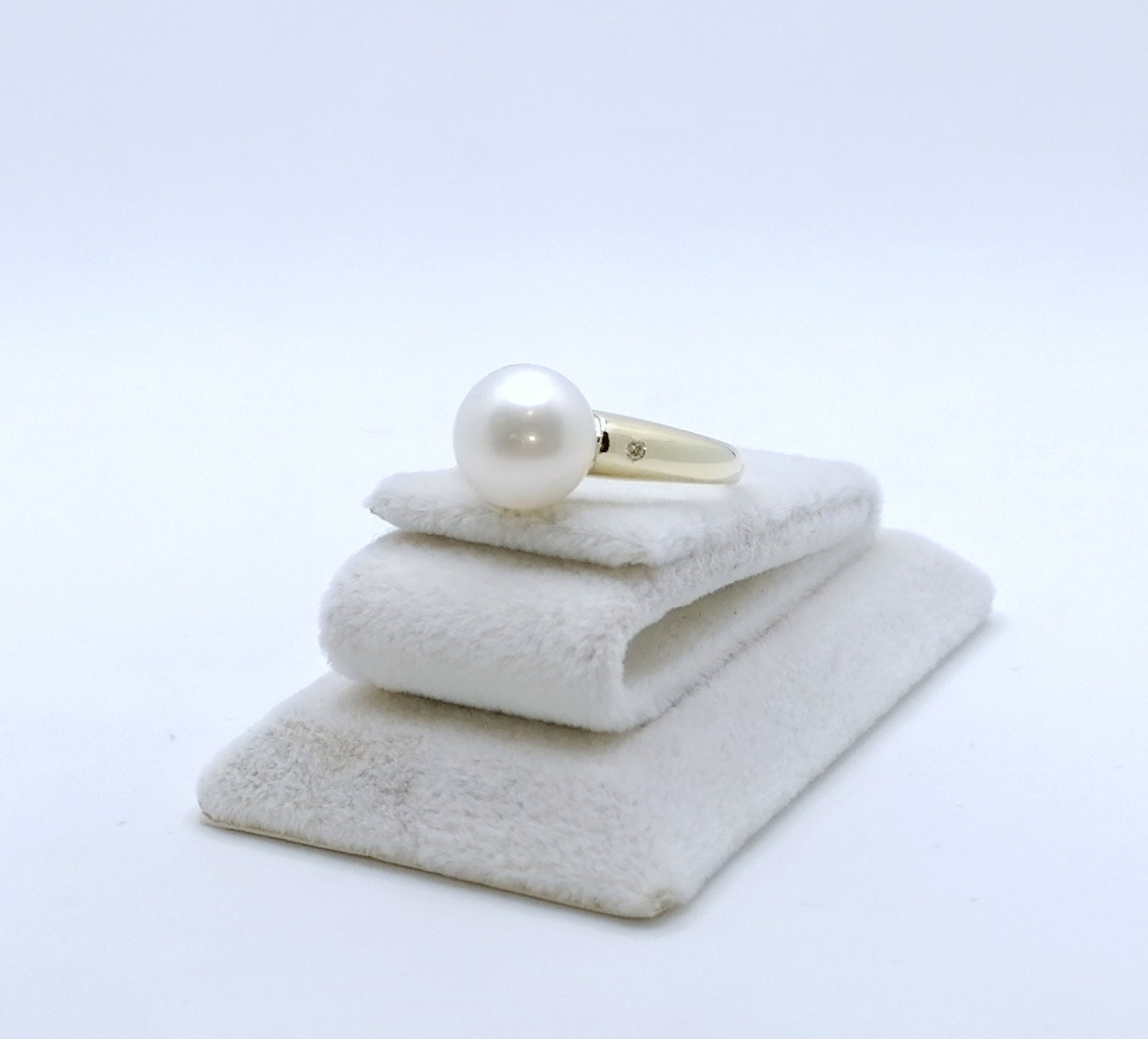 Damenring mit einer Perle und zwei funkelnden Diamantsplitter. Der Ring ist aus 585er 14 karat Gold gefertigt.