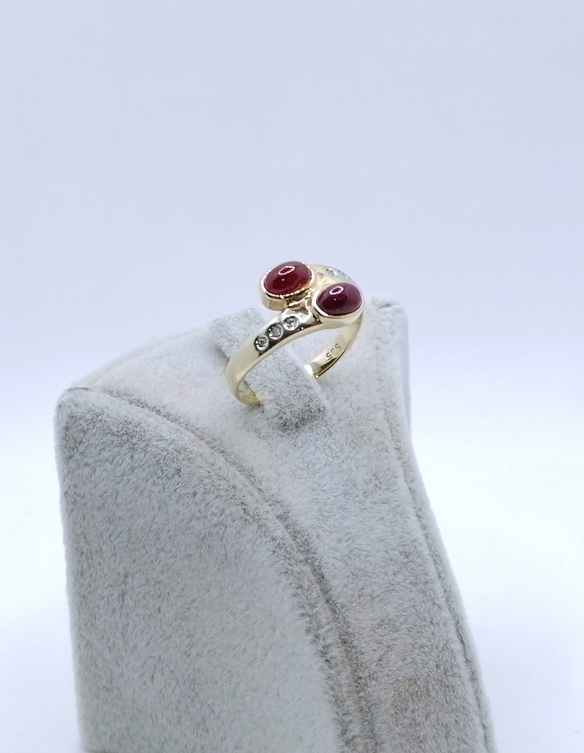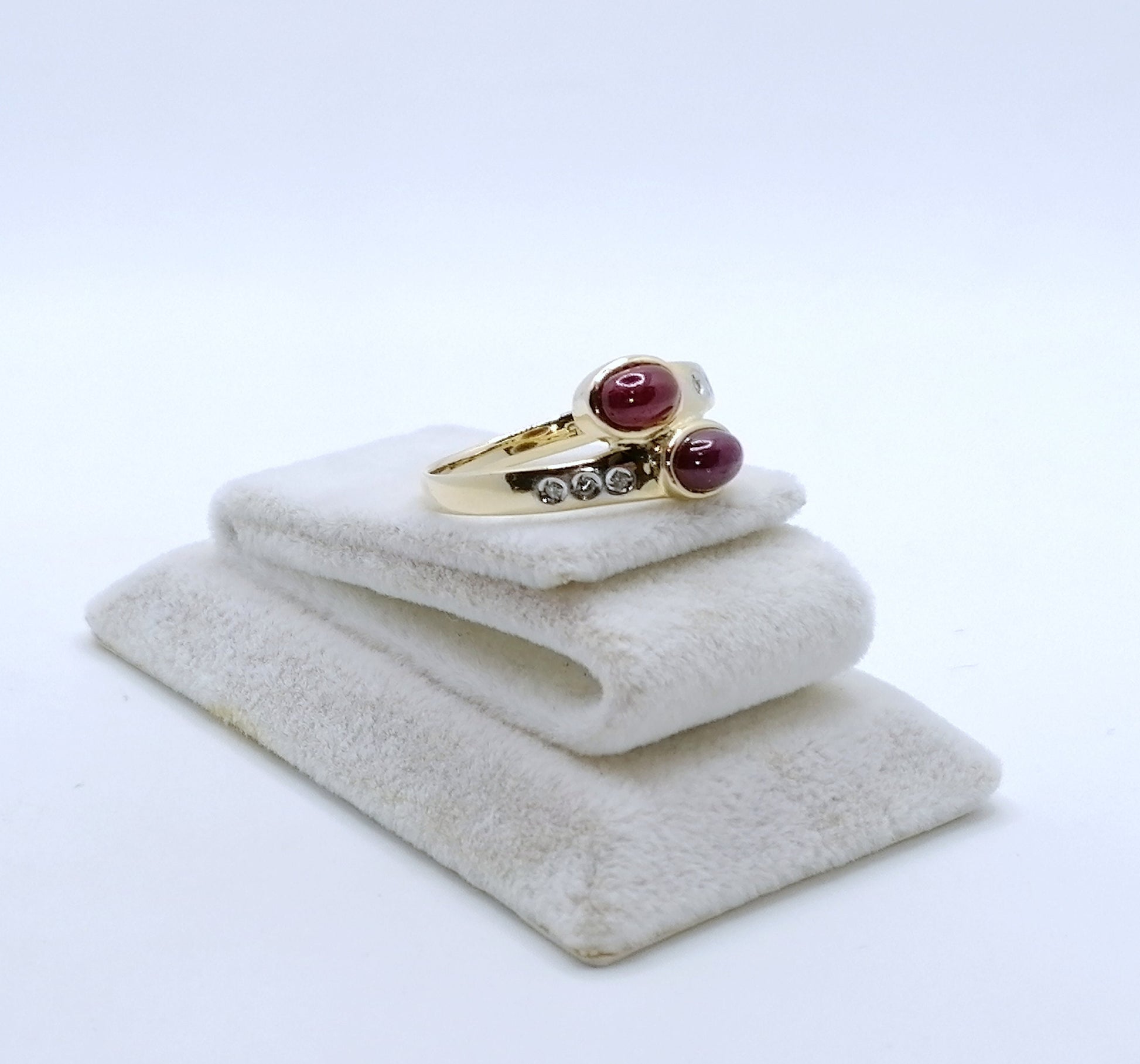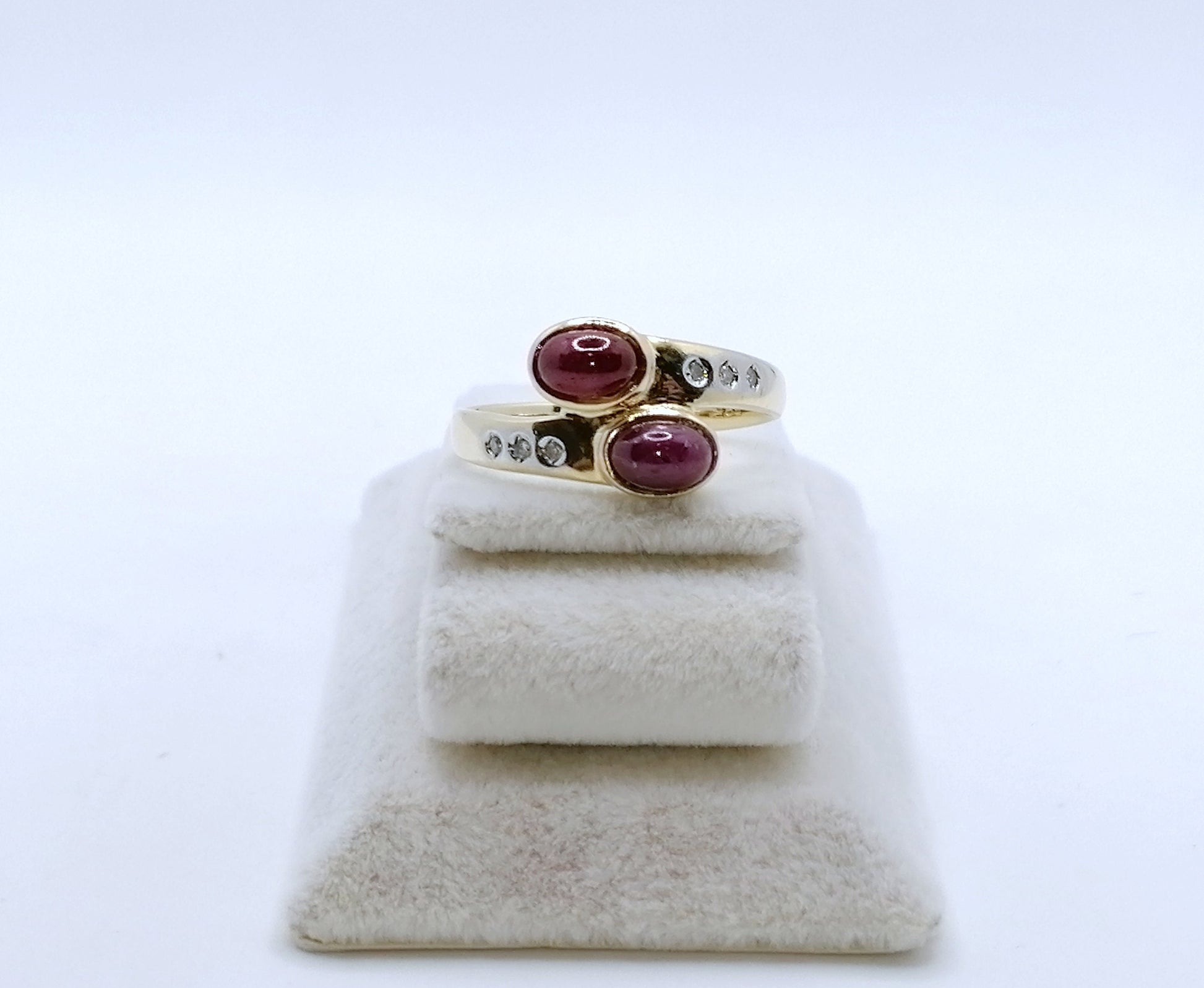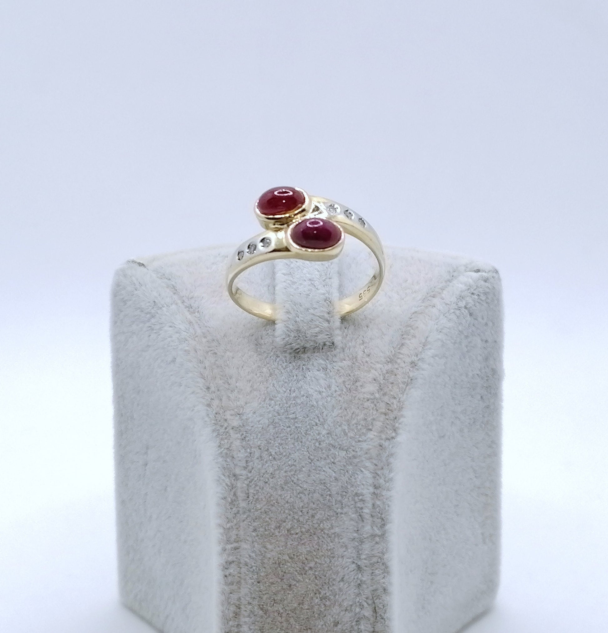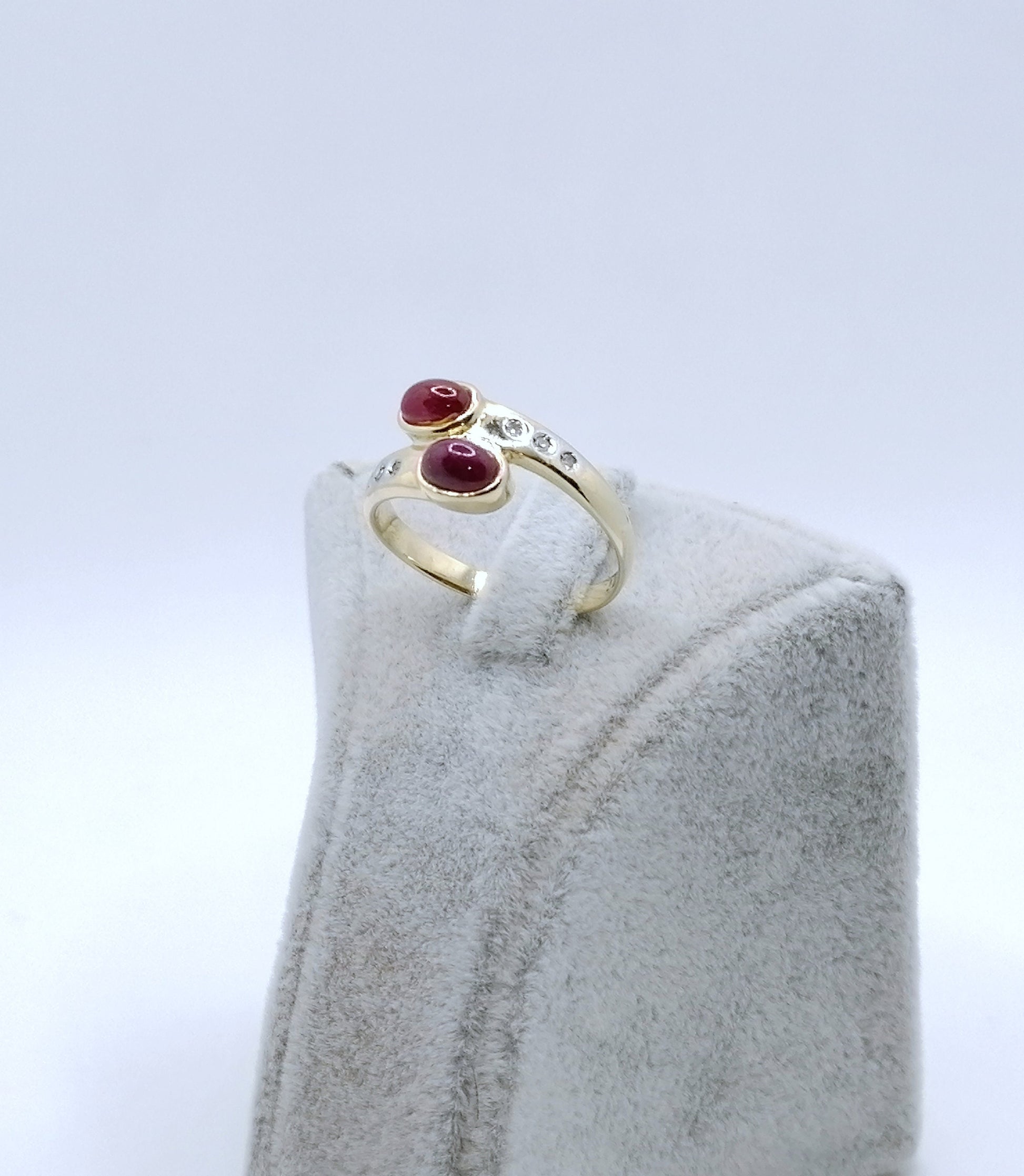 Gold Damenring mit zwei Rubin Cabochon und 6 funkelnden Diamantsplitter. Der Ring ist aus 585er 14 karat Gold gefertigt.