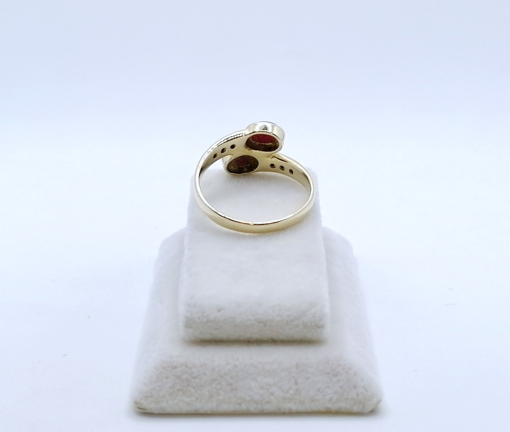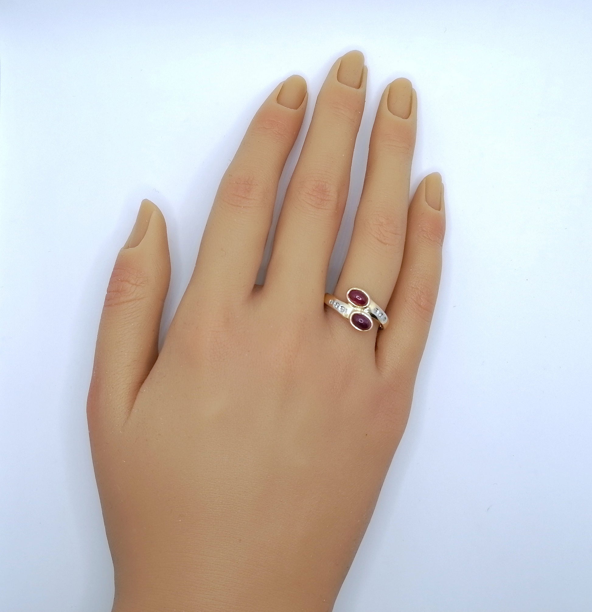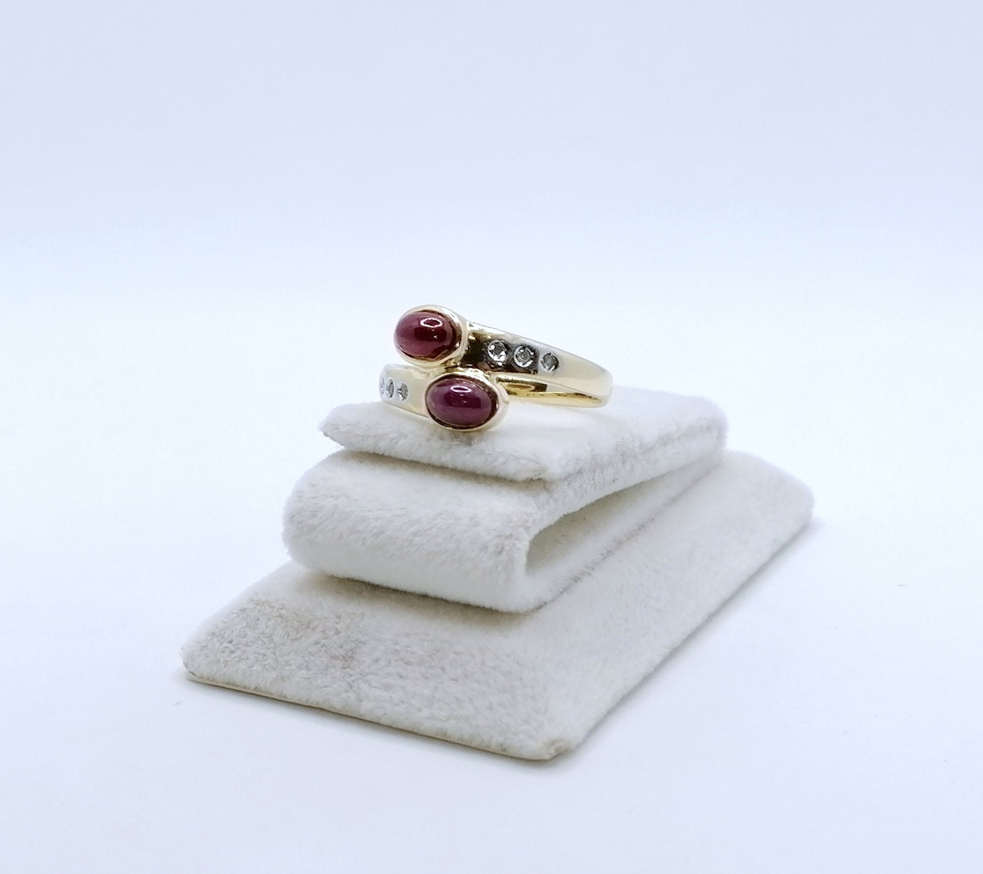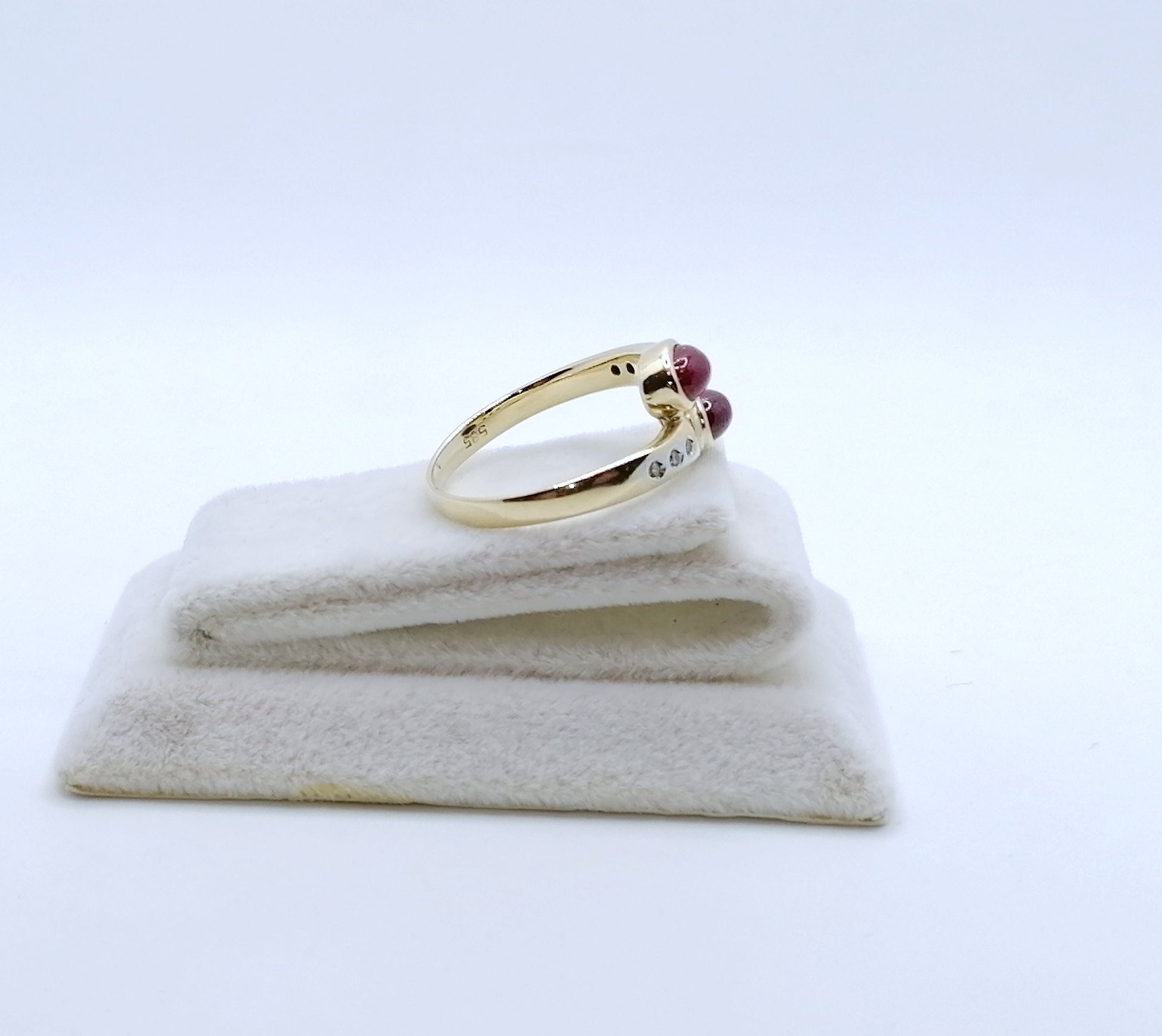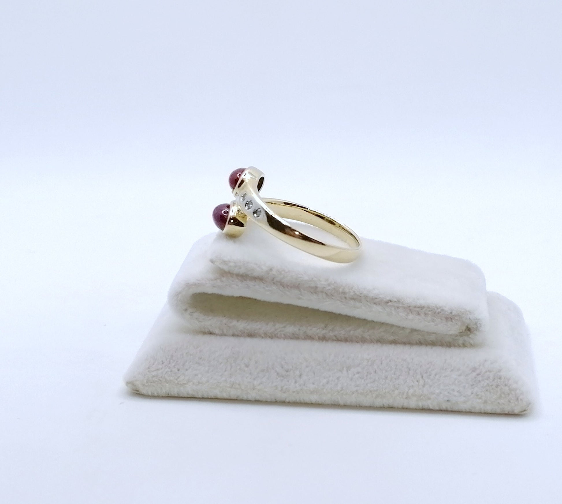 Gold Damenring mit zwei Rubin Cabochon und 6 funkelnden Diamantsplitter. Der Ring ist aus 585er 14 karat Gold gefertigt.