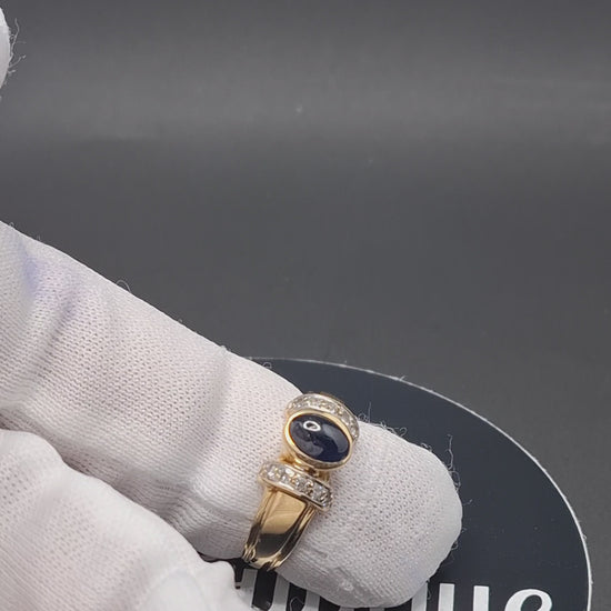 Neuwertiger Gold Damenring mit einem Saphir Cabochon und funkelnden Diamanten. Der Ring ist aus 585er 14 karat Gold gefertigt.