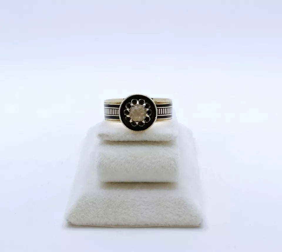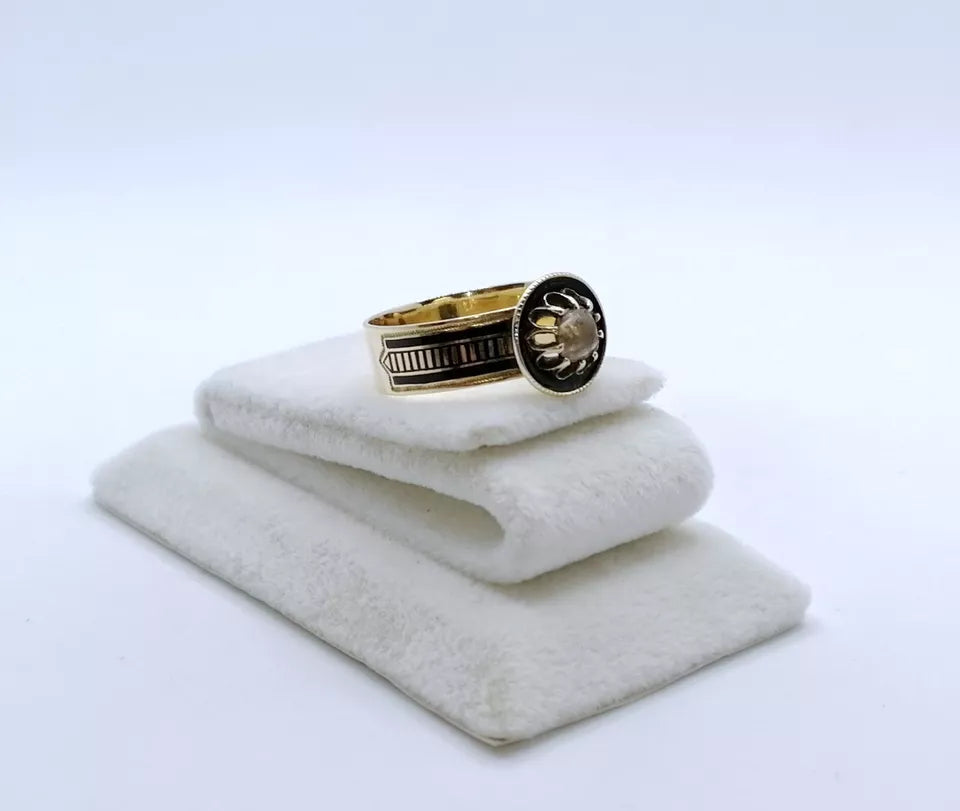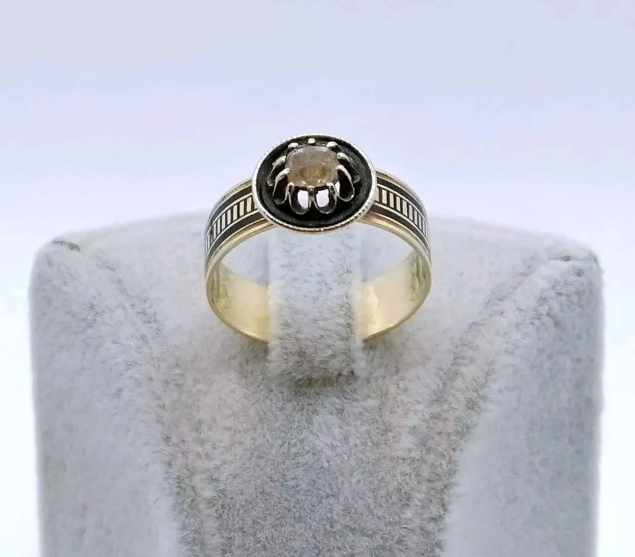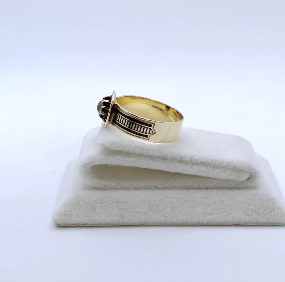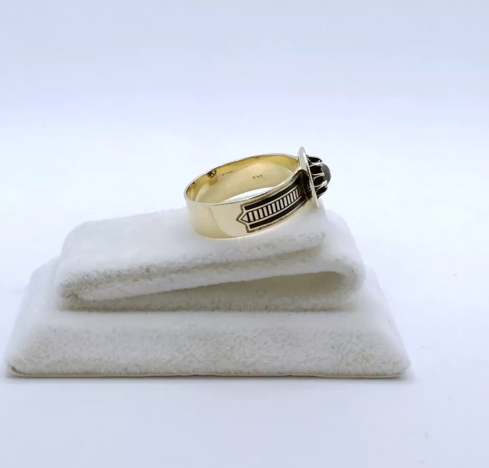 Vintage Gold Damenring mit einem unbekannten Stein. Der Ring ist aus 585er 14 karat Gold gefertigt und die Ringschiene ist mit schwarzer Emaille verziert.