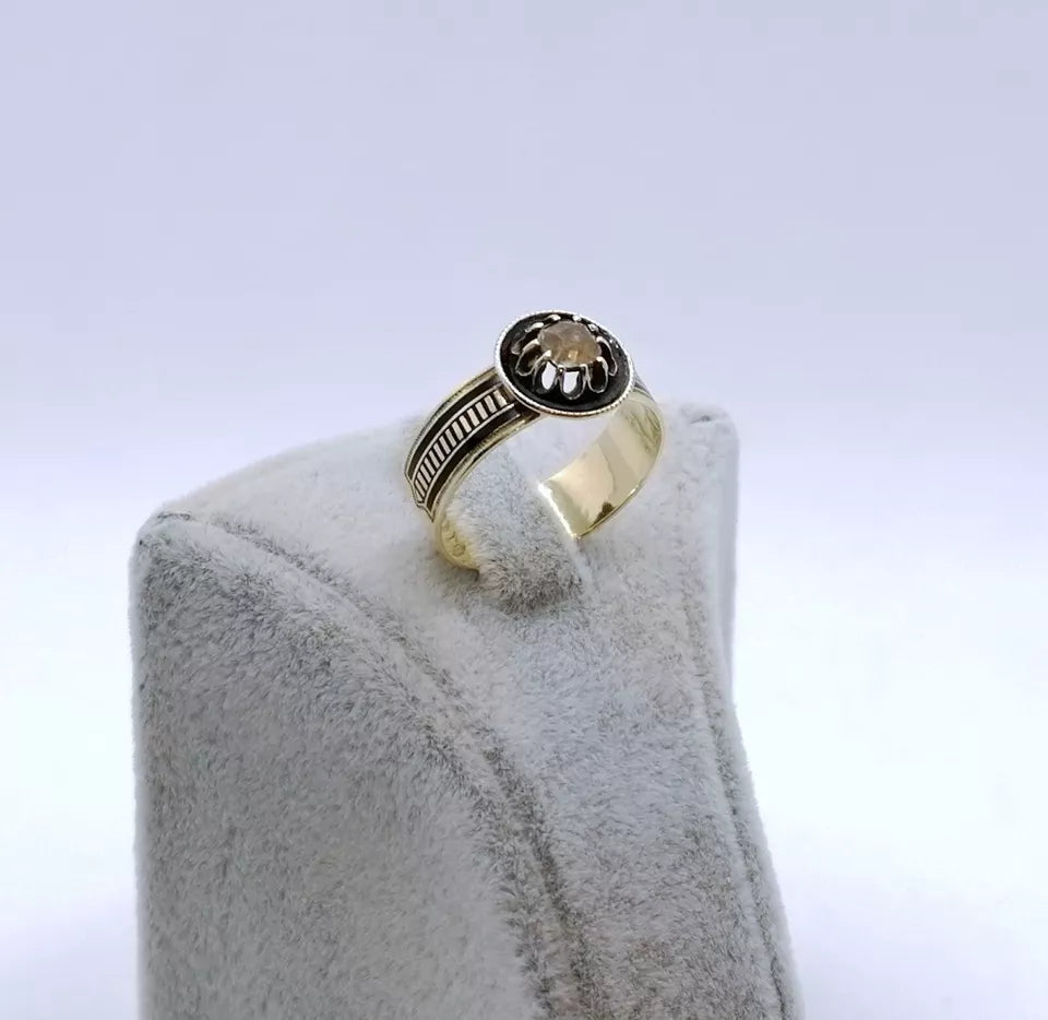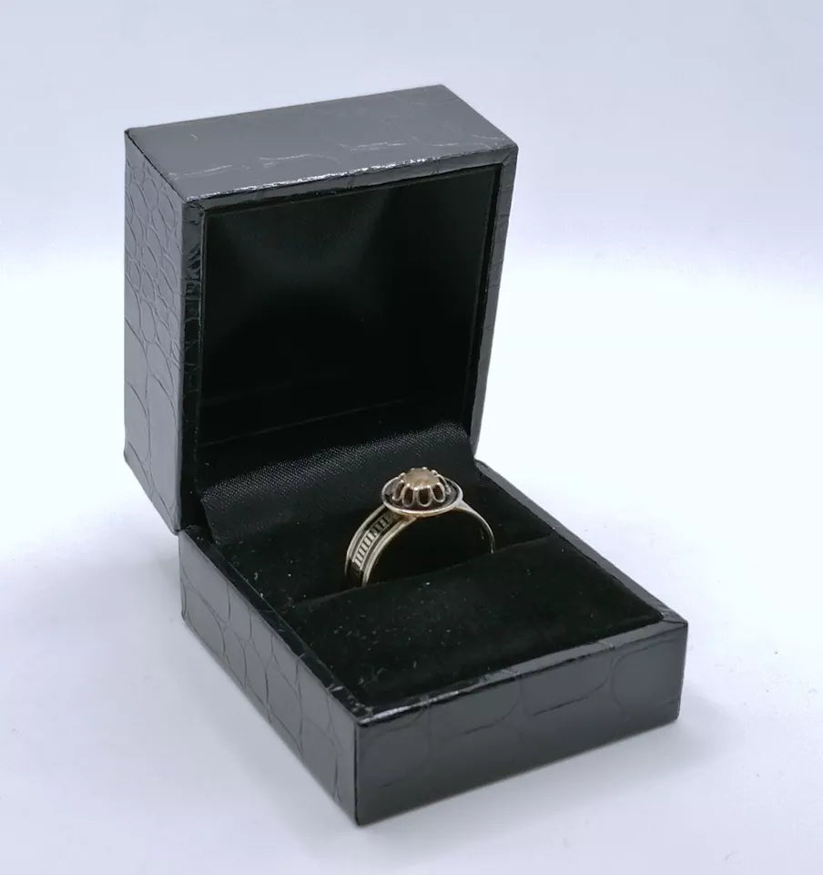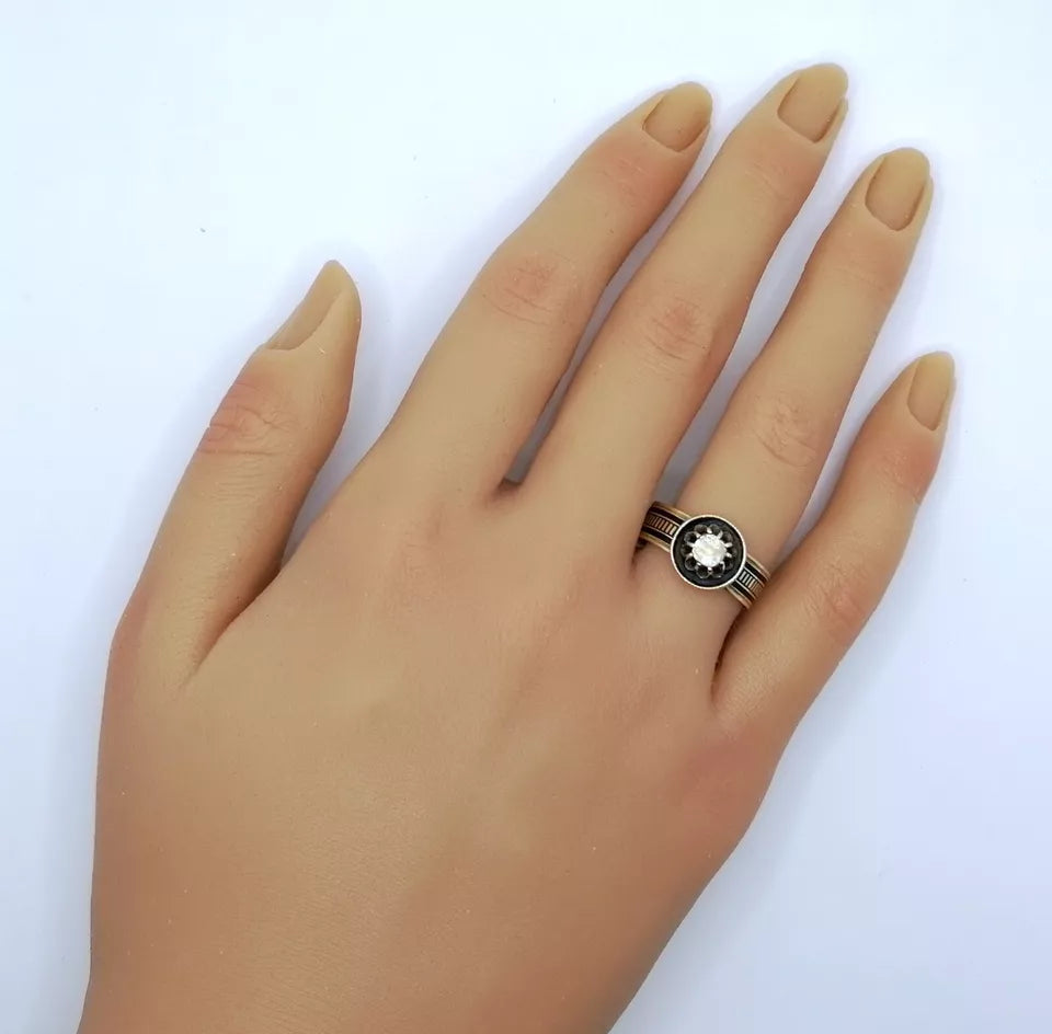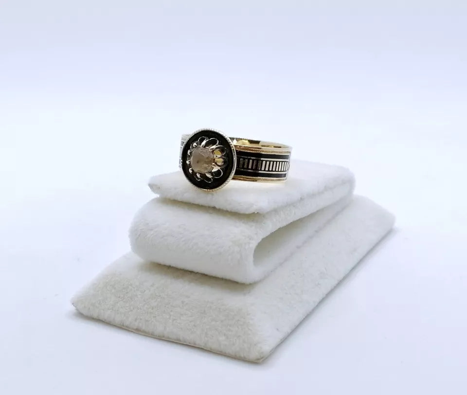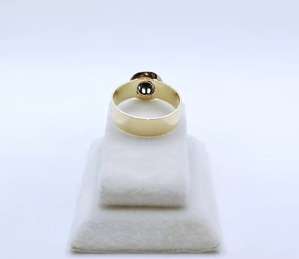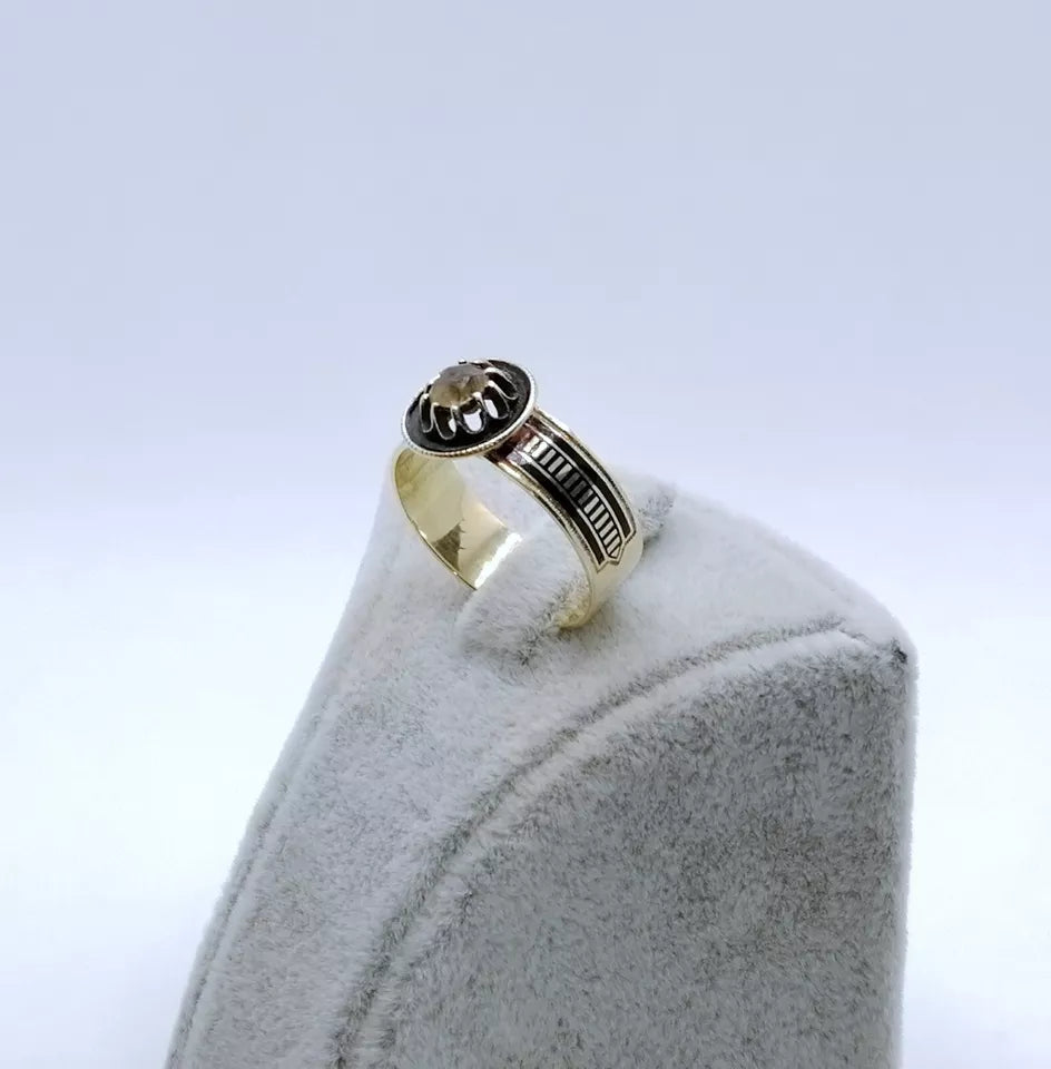 Vintage Gold Damenring mit einem unbekannten Stein. Der Ring ist aus 585er 14 karat Gold gefertigt und die Ringschiene ist mit schwarzer Emaille verziert.