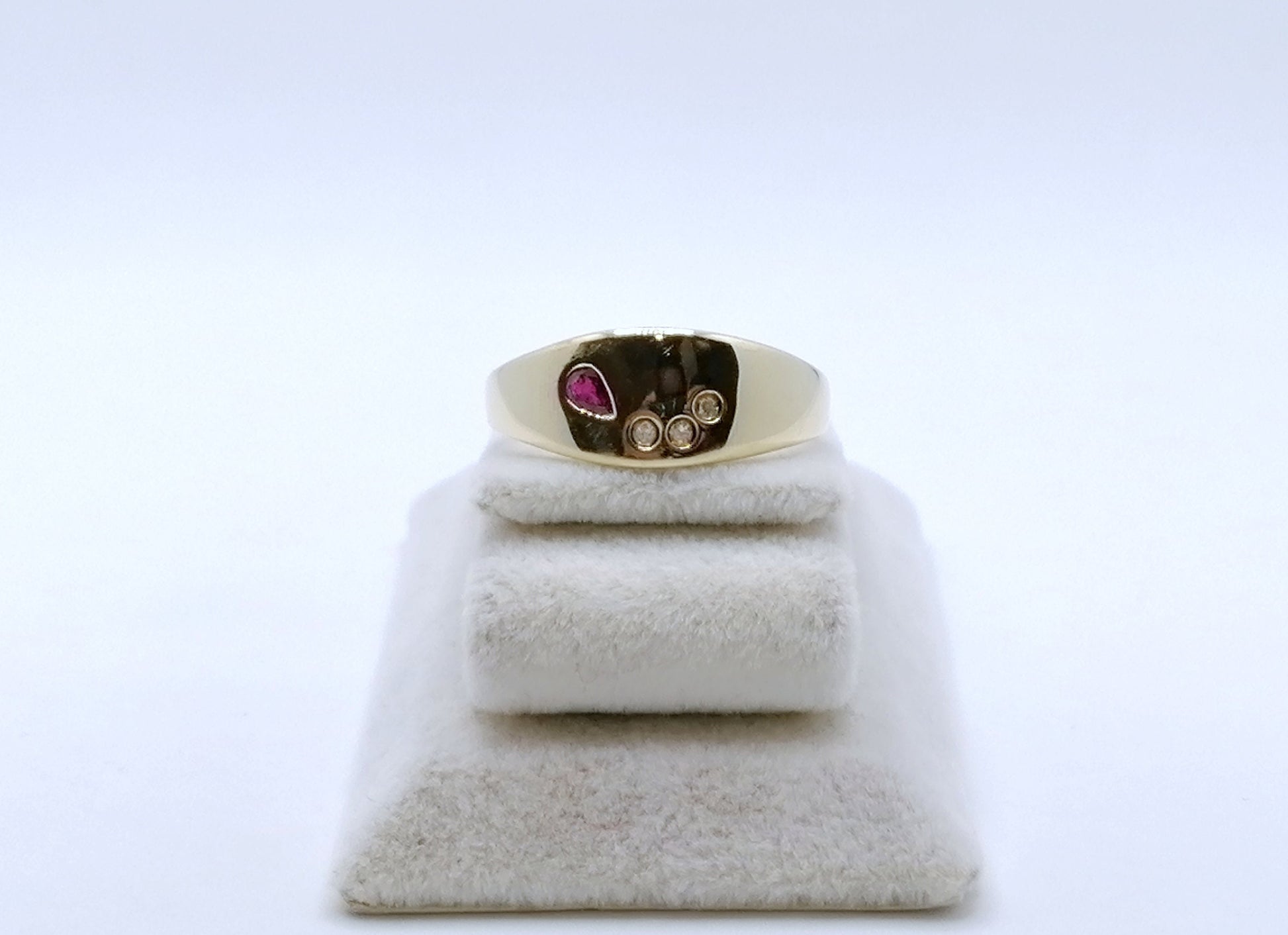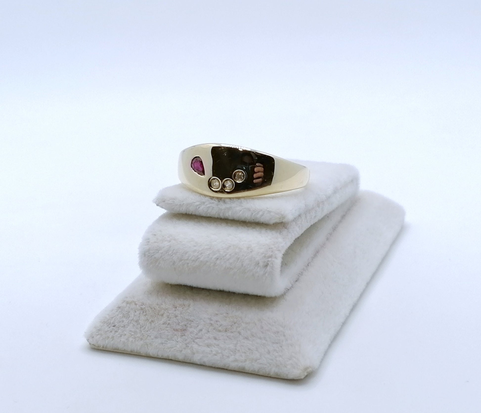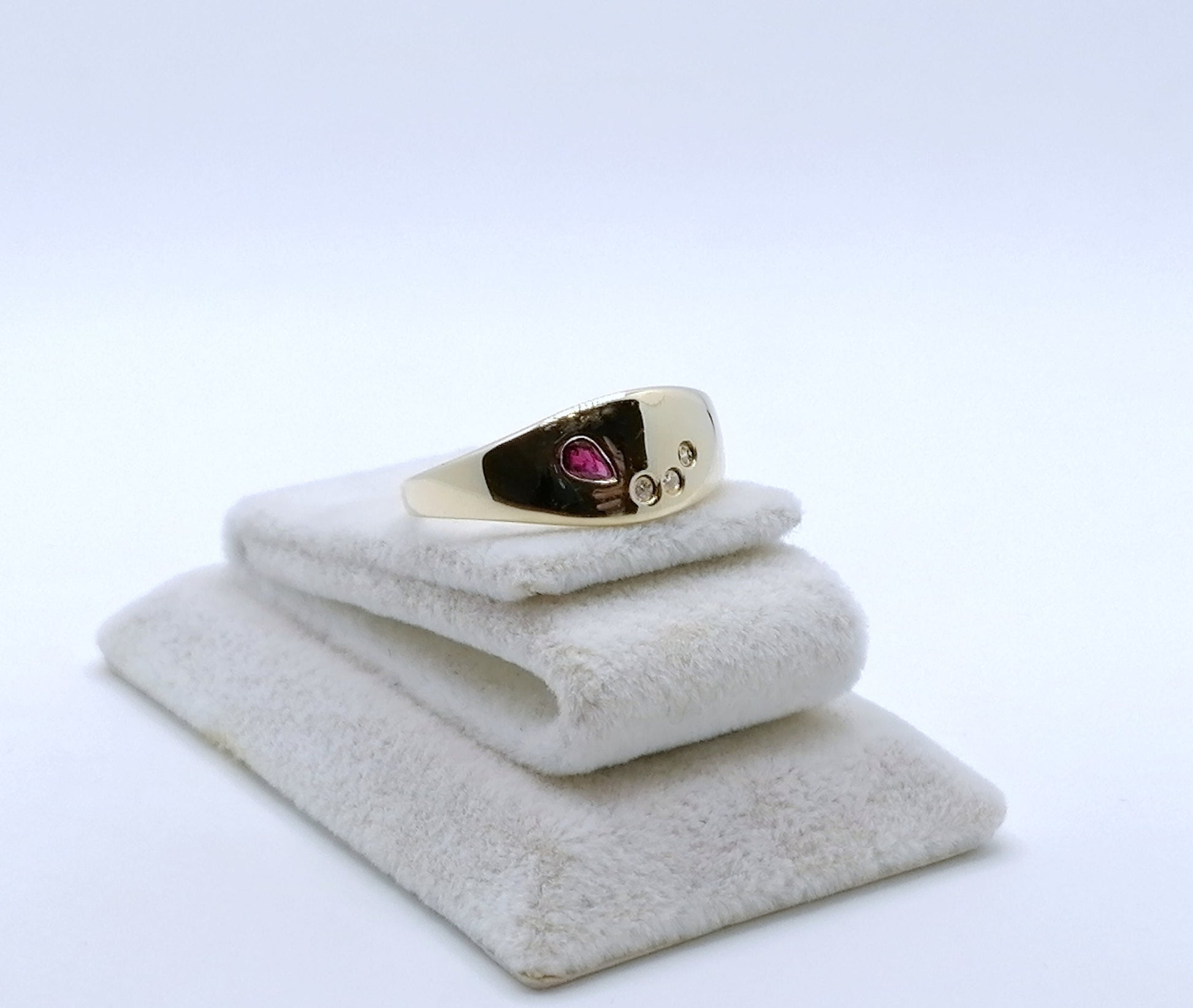 Gold Damenring mit einem Rubin und funkelnden Diamantsplitter. Der Ring ist aus 585er 14 karat Gold.
