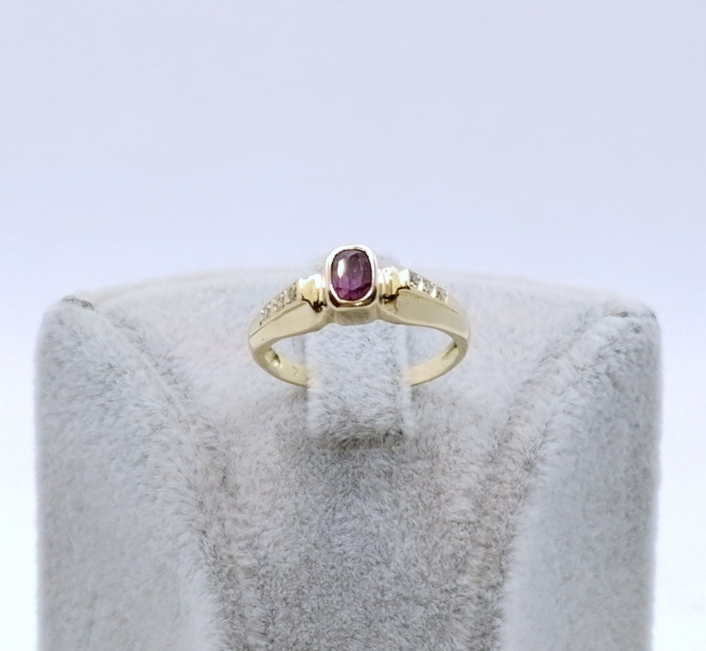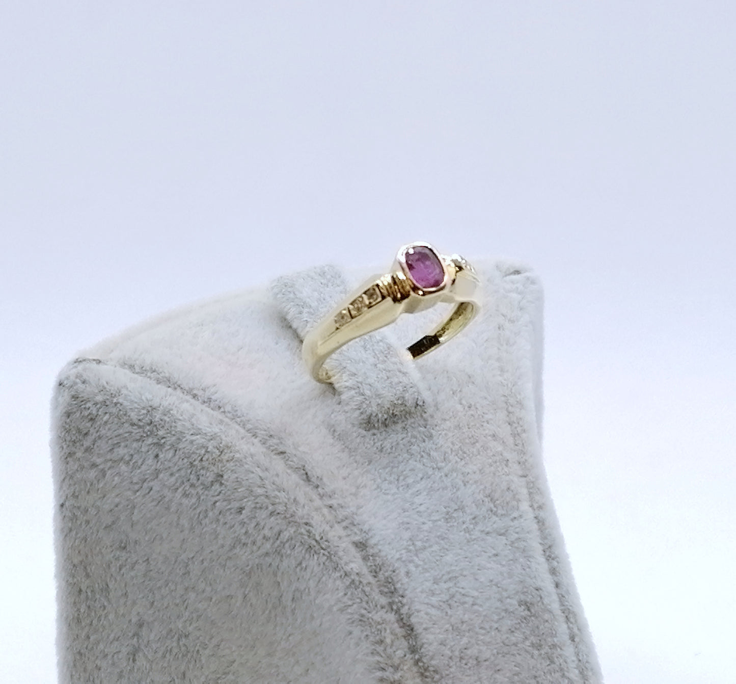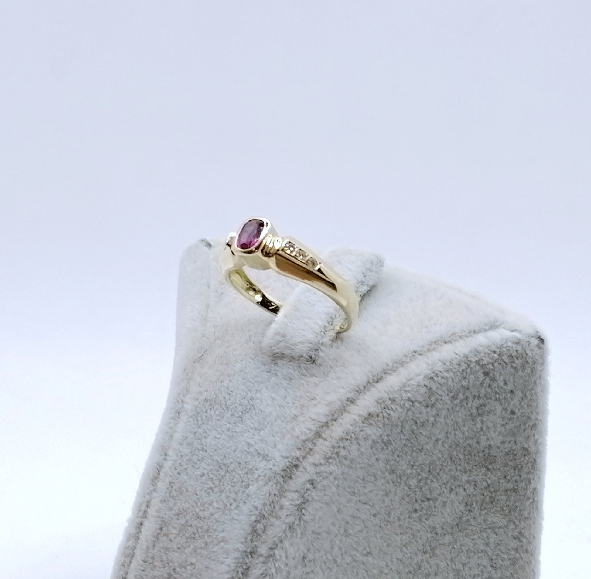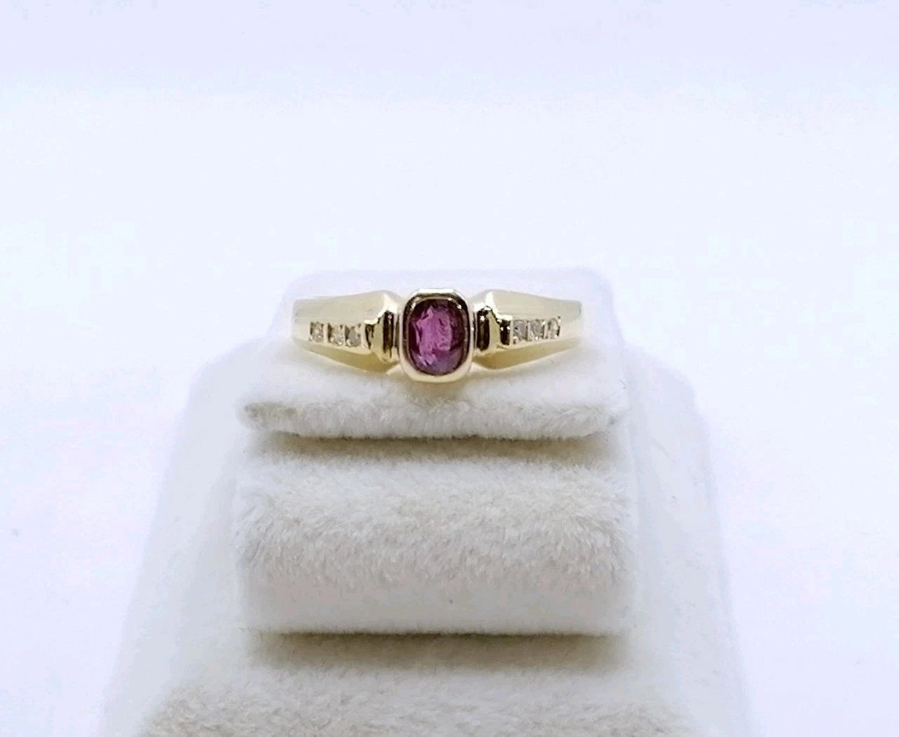 Neuwertiger Gold Damenring mit einem Rubin und funkelnden Diamanten. Der Ring ist aus 750er 18 Karat Gelbgold gefertigt.