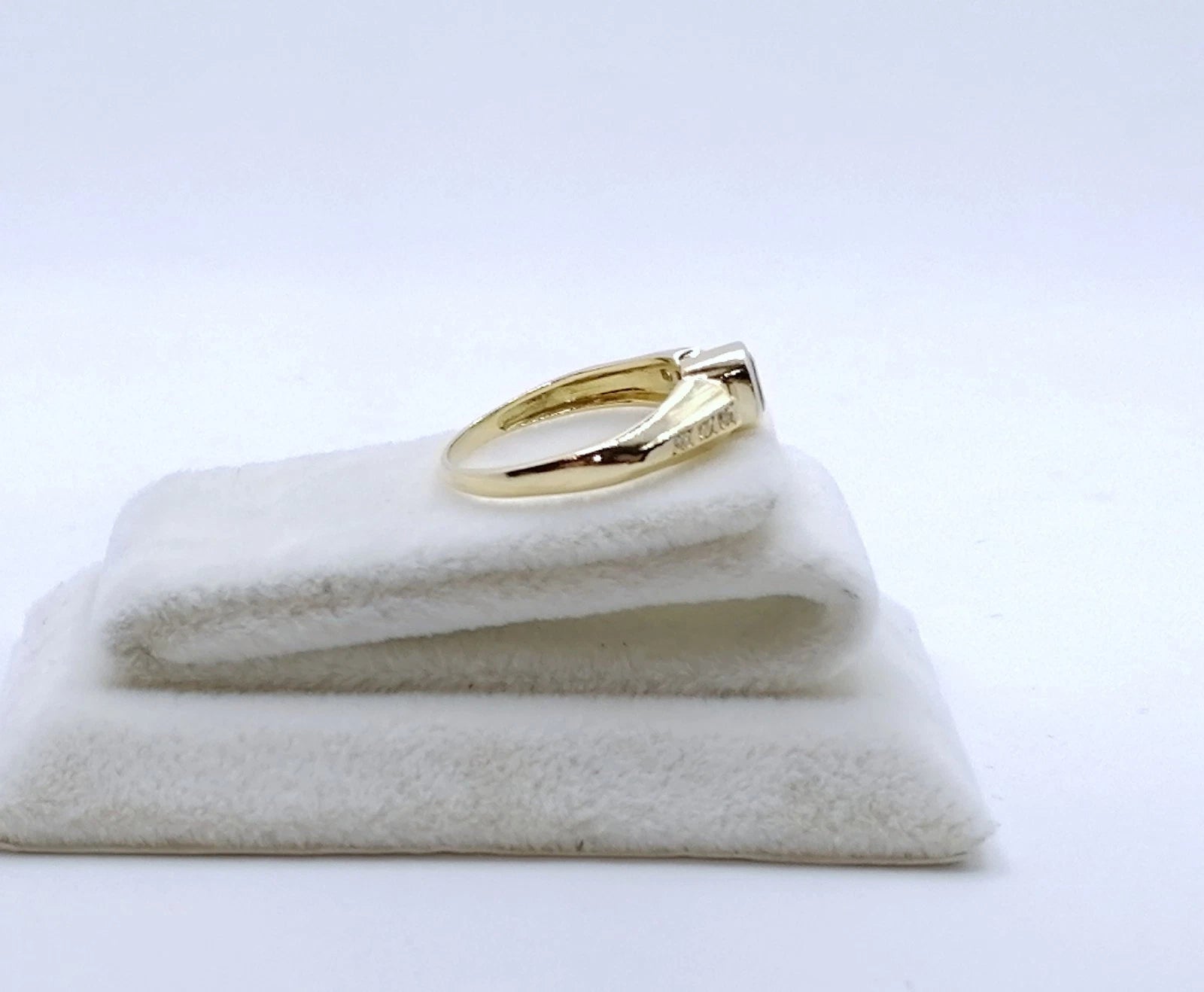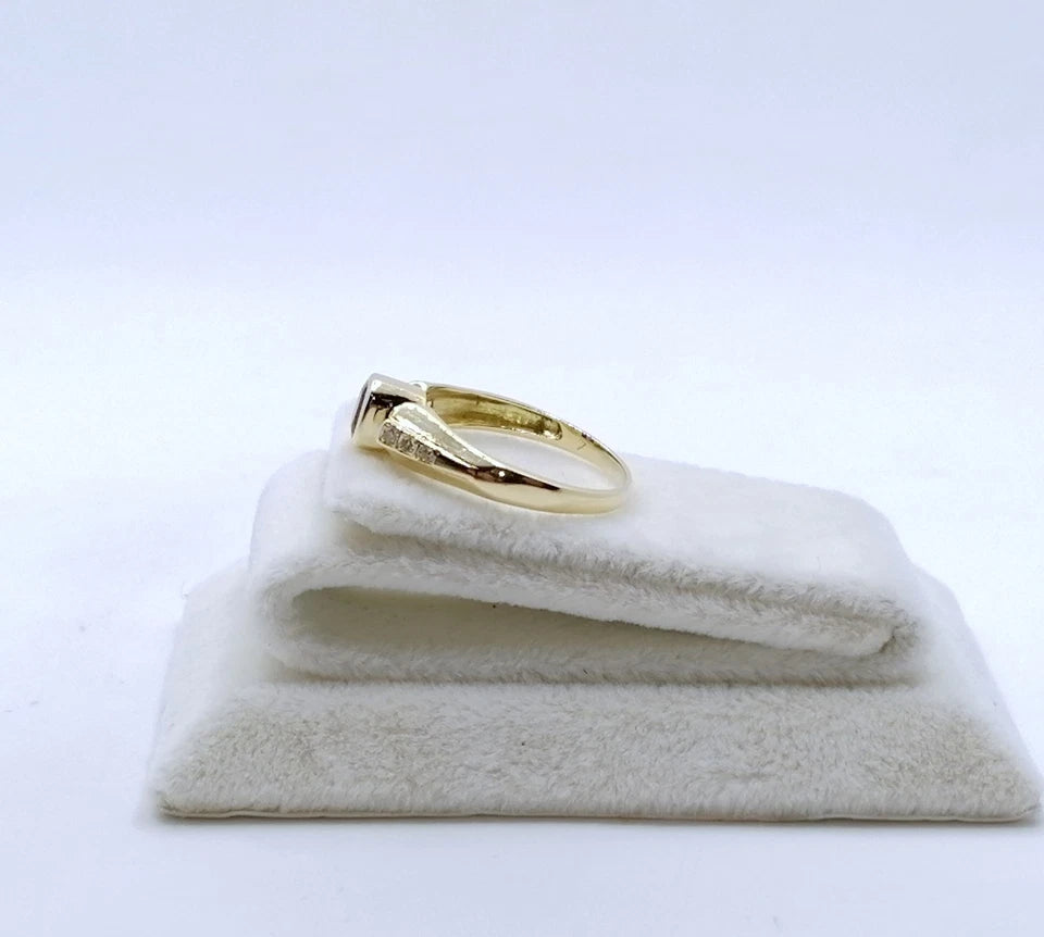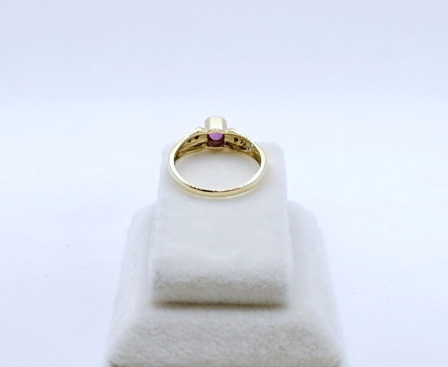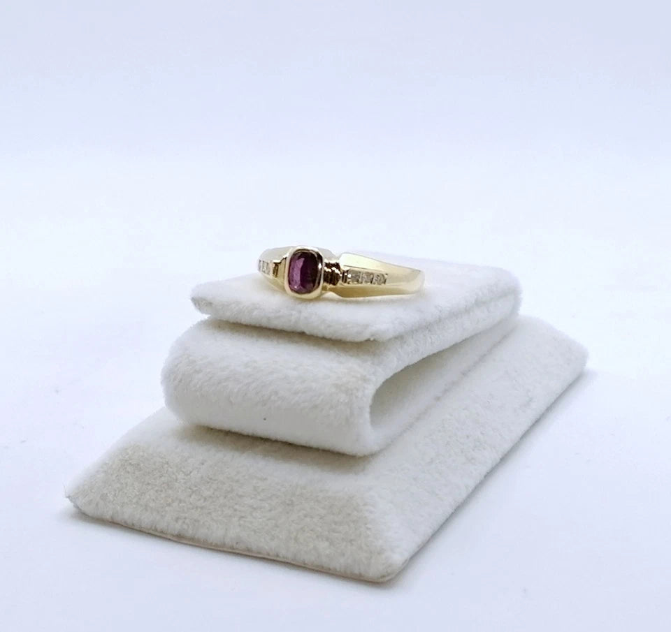 Neuwertiger Gold Damenring mit einem Rubin und funkelnden Diamanten. Der Ring ist aus 750er 18 Karat Gelbgold gefertigt.
