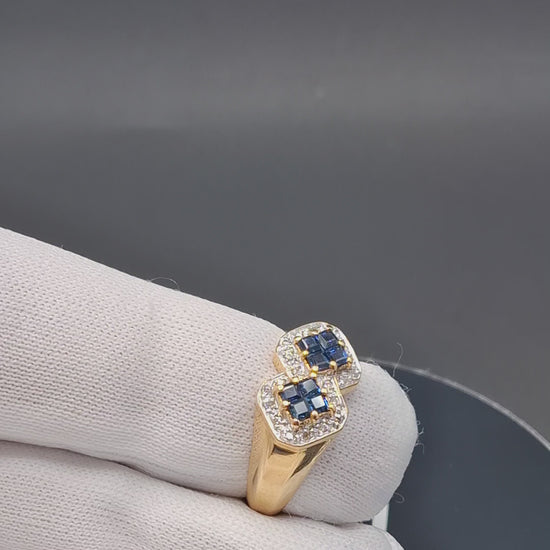 Neuwertiger Gold Damenring mit Saphiren und funkelnden Diamantsplitter. Der Ring ist aus 750er 18 Karat Gold gefertigt.