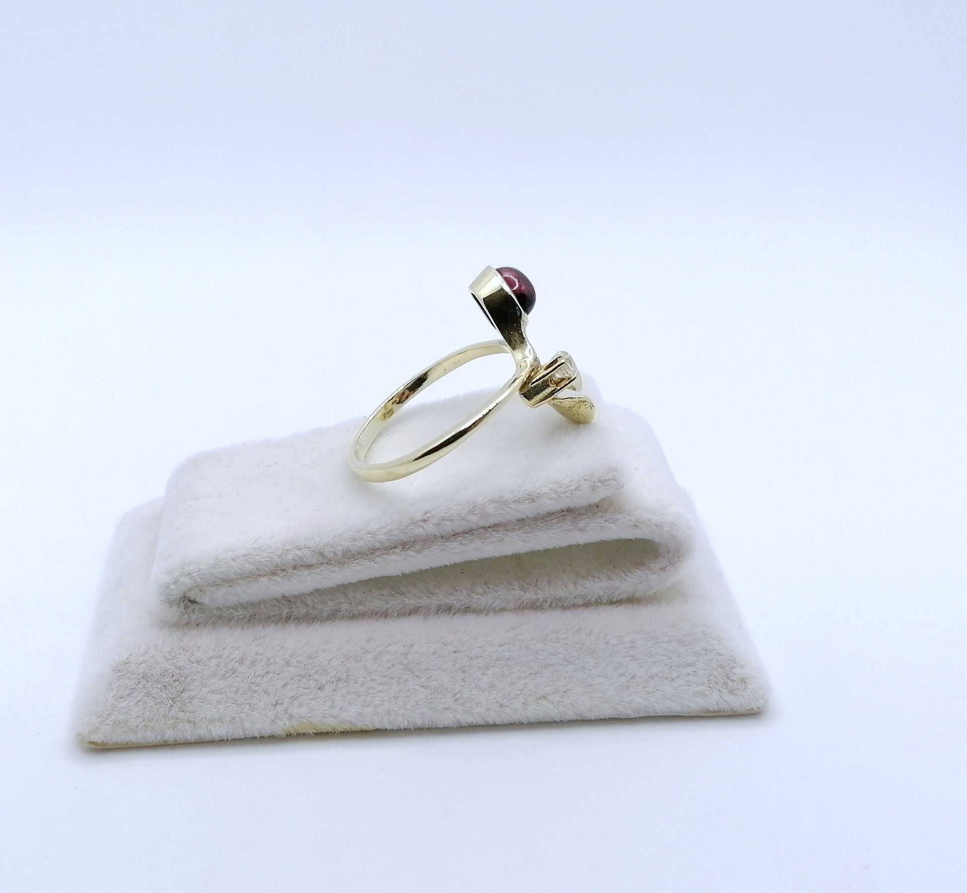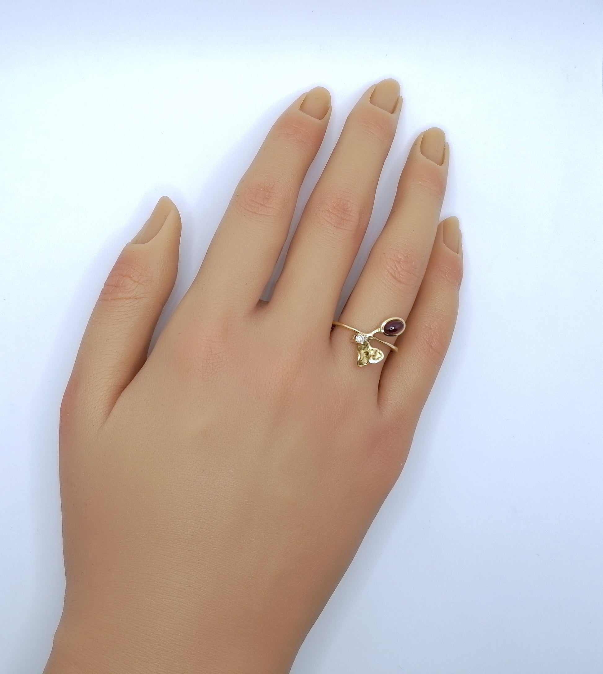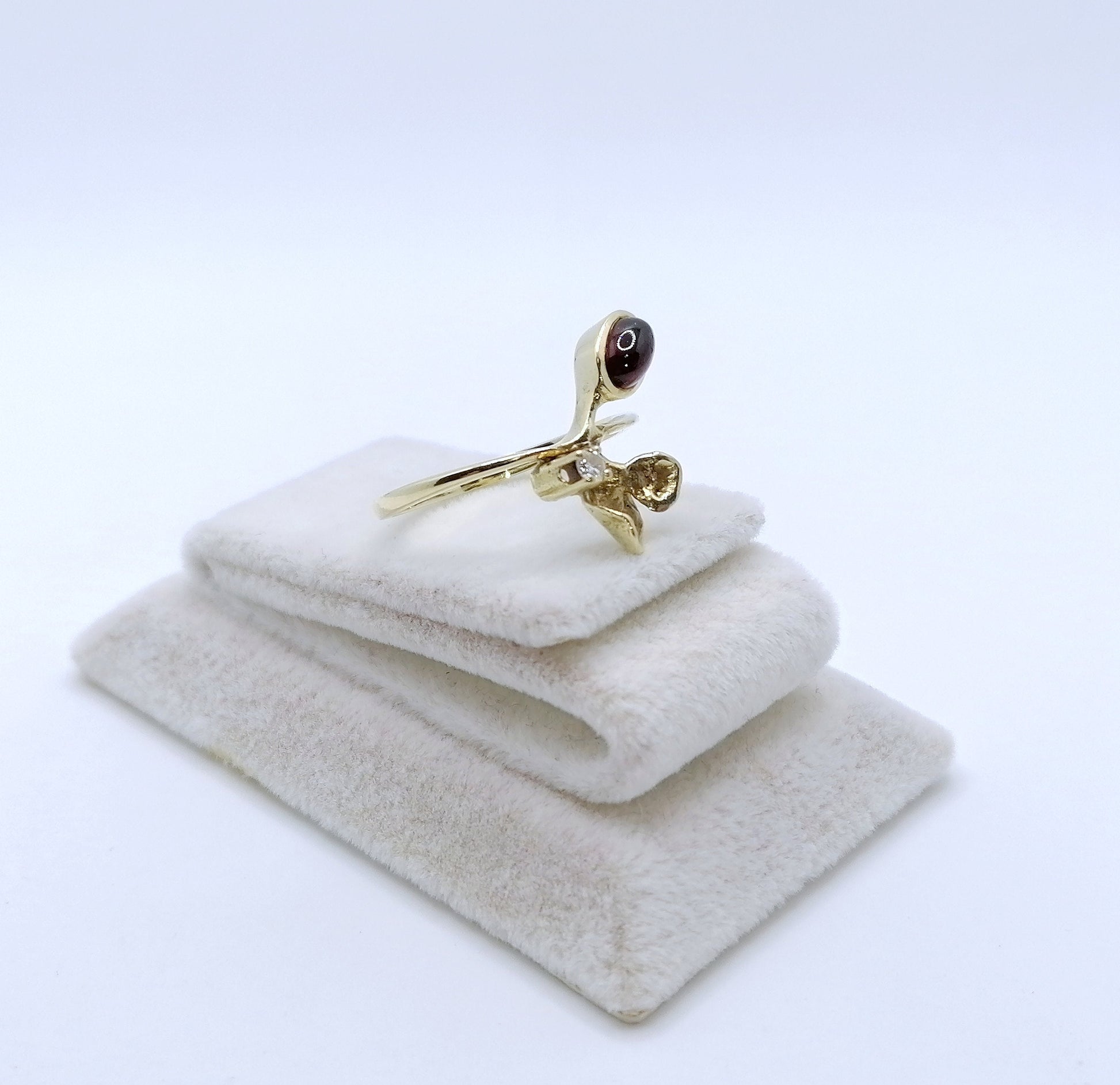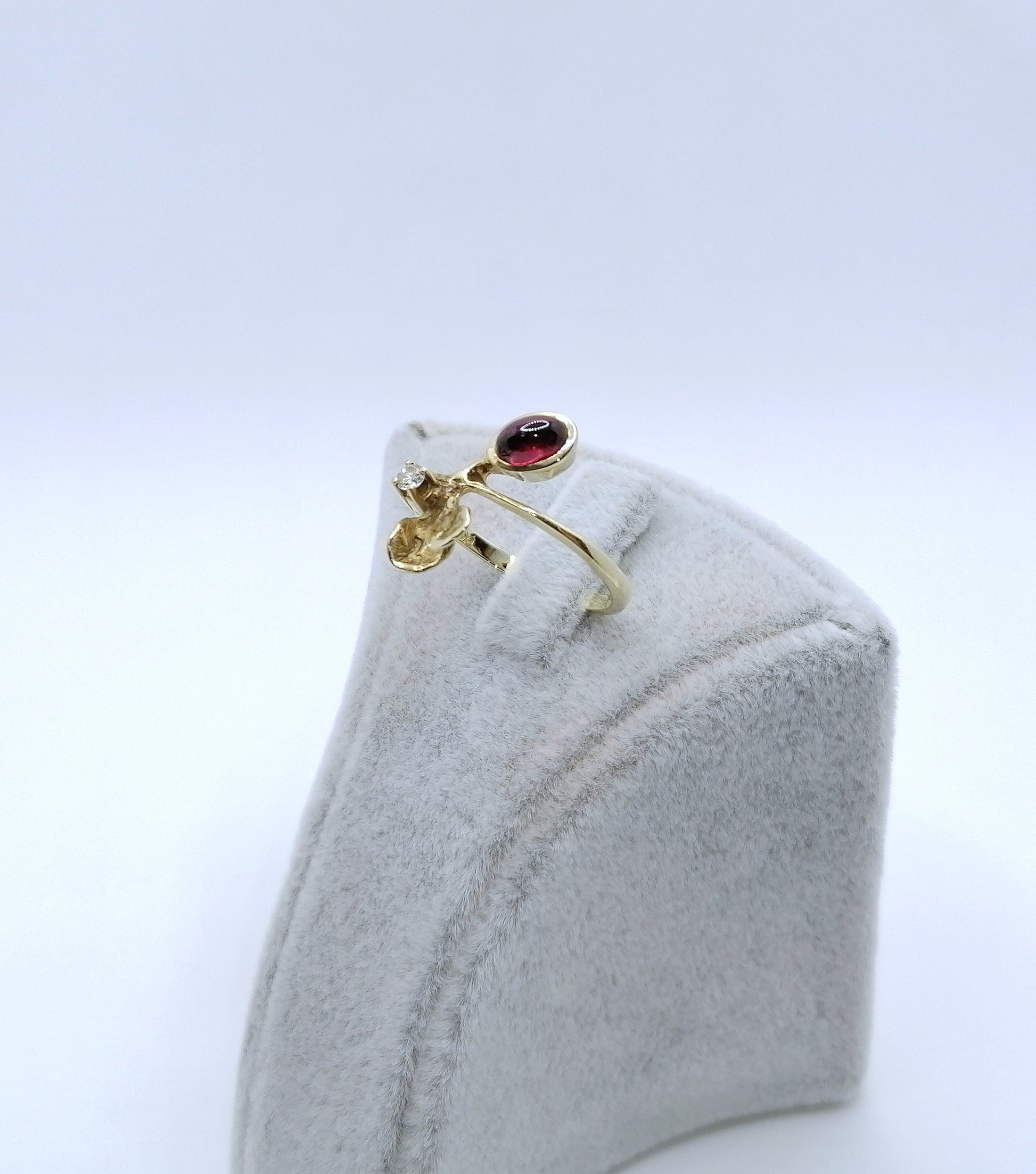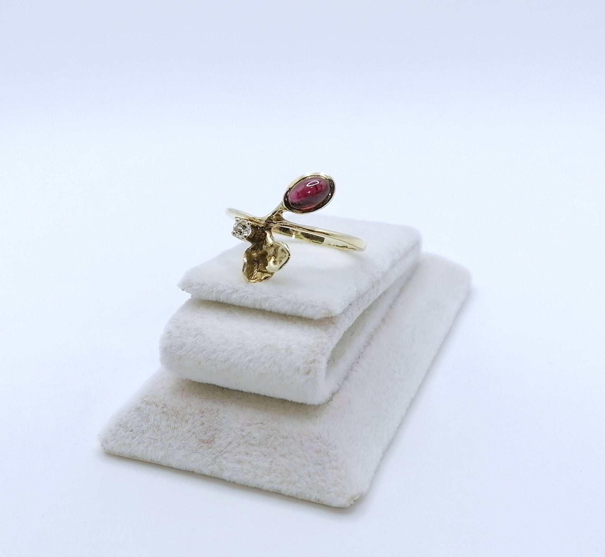 Traumhafter Gold Damenring mit einem Tourmalin Cabochon und einem funkelnden Brillanten. Der Ring ist aus 585er 14 Karat Gold gefertigt.
