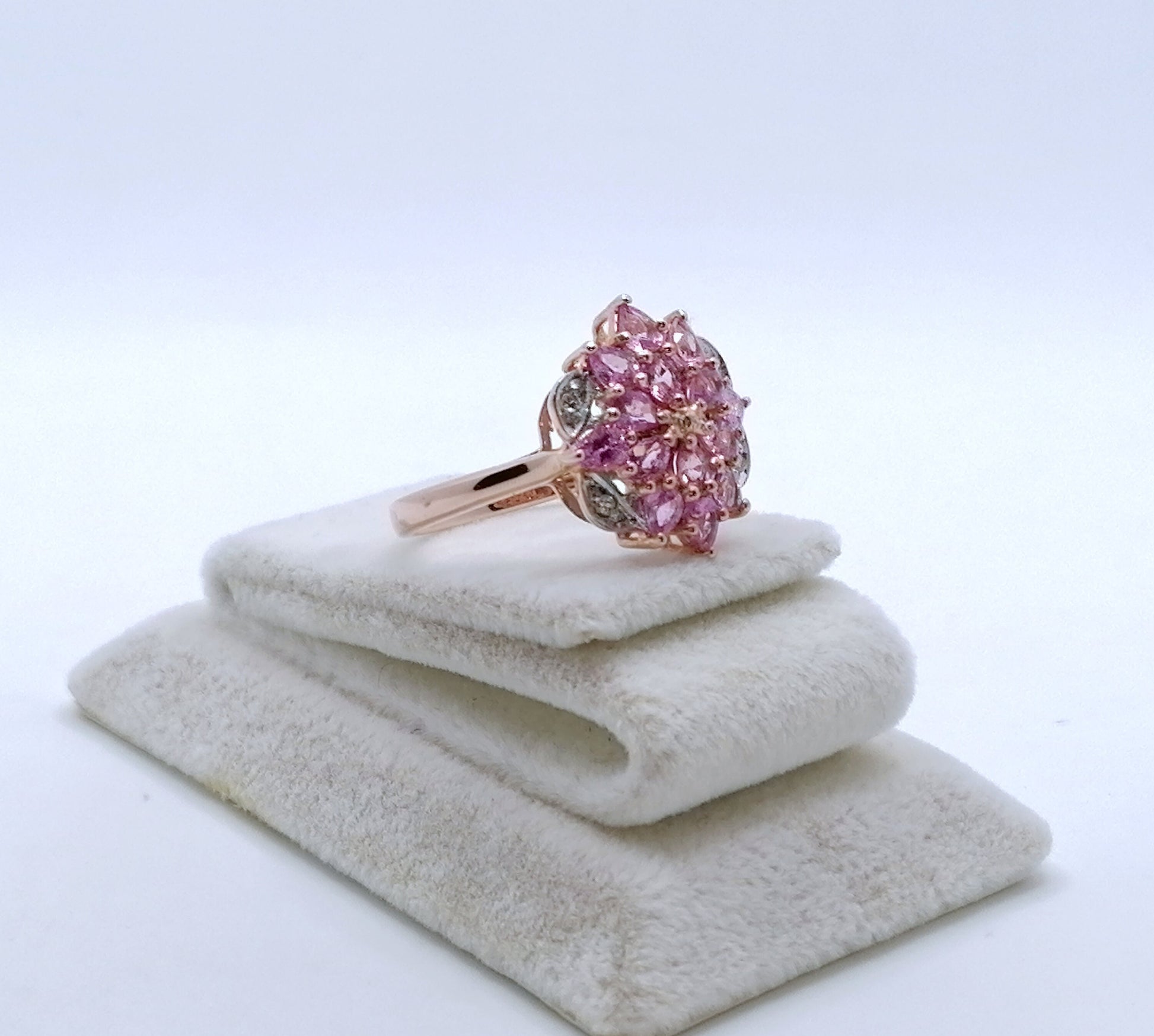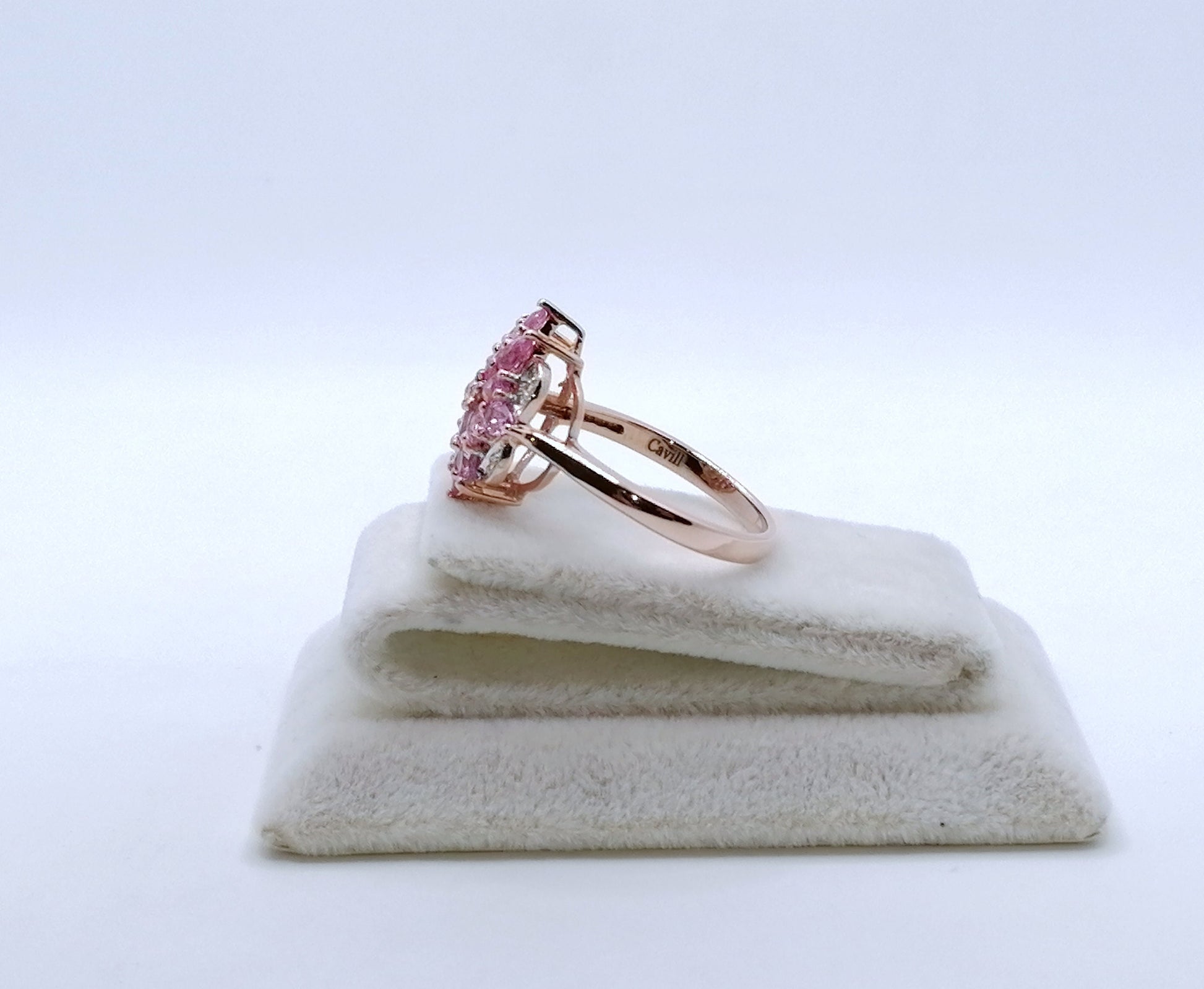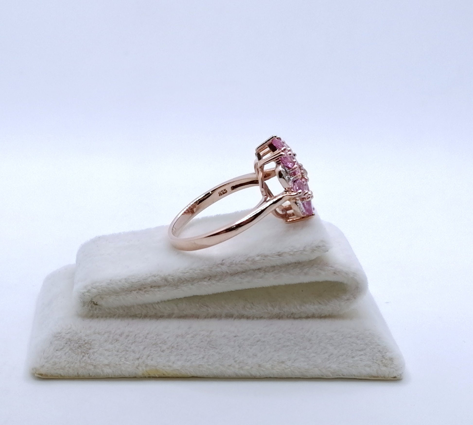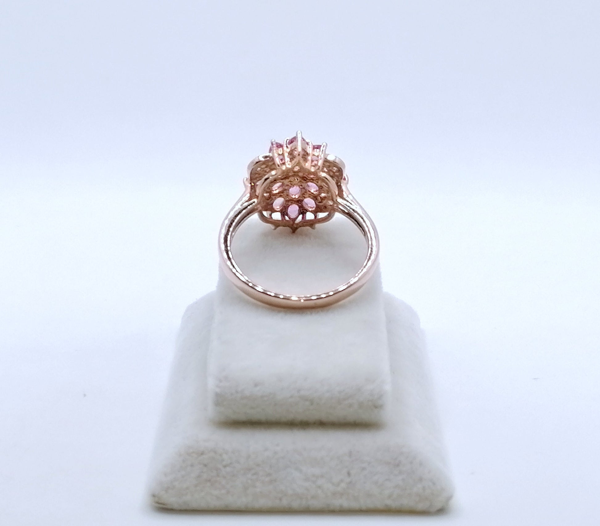 Damenring mit zahlreichen Pinken Saphir Edelsteinen und 4 funkelnden Zirkonen. Der Ring ist aus 925er vergoldetem Silber gefertigt.