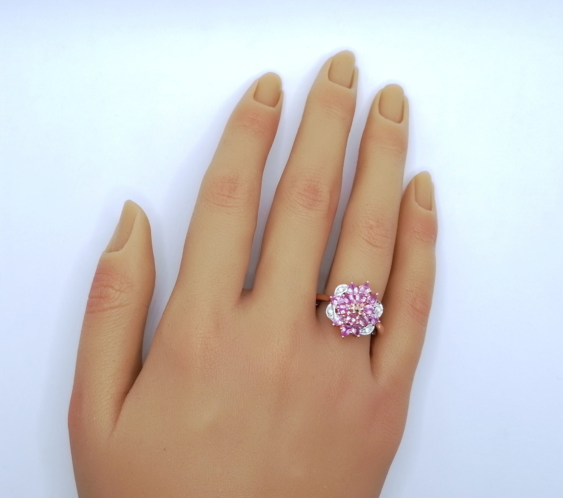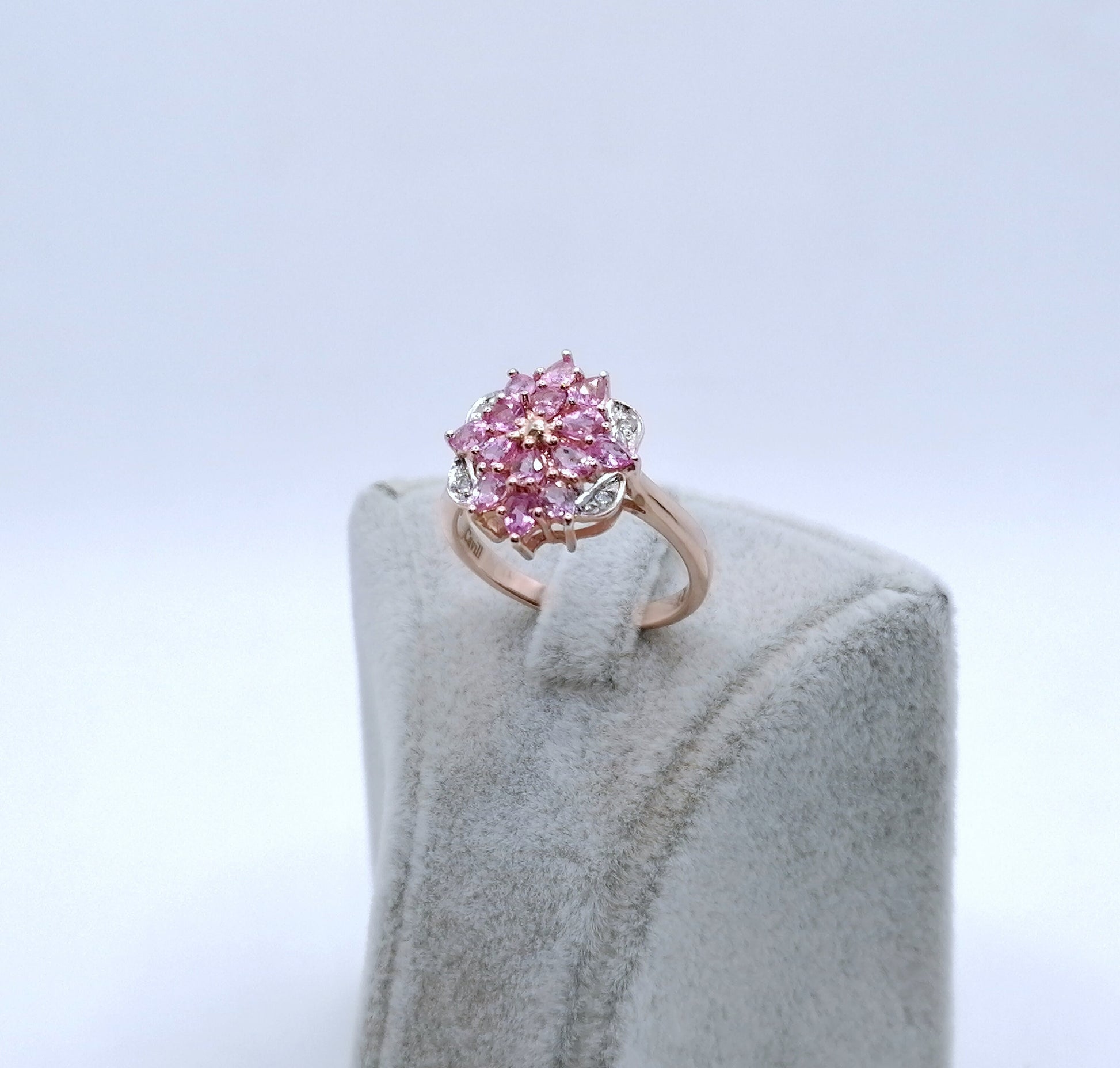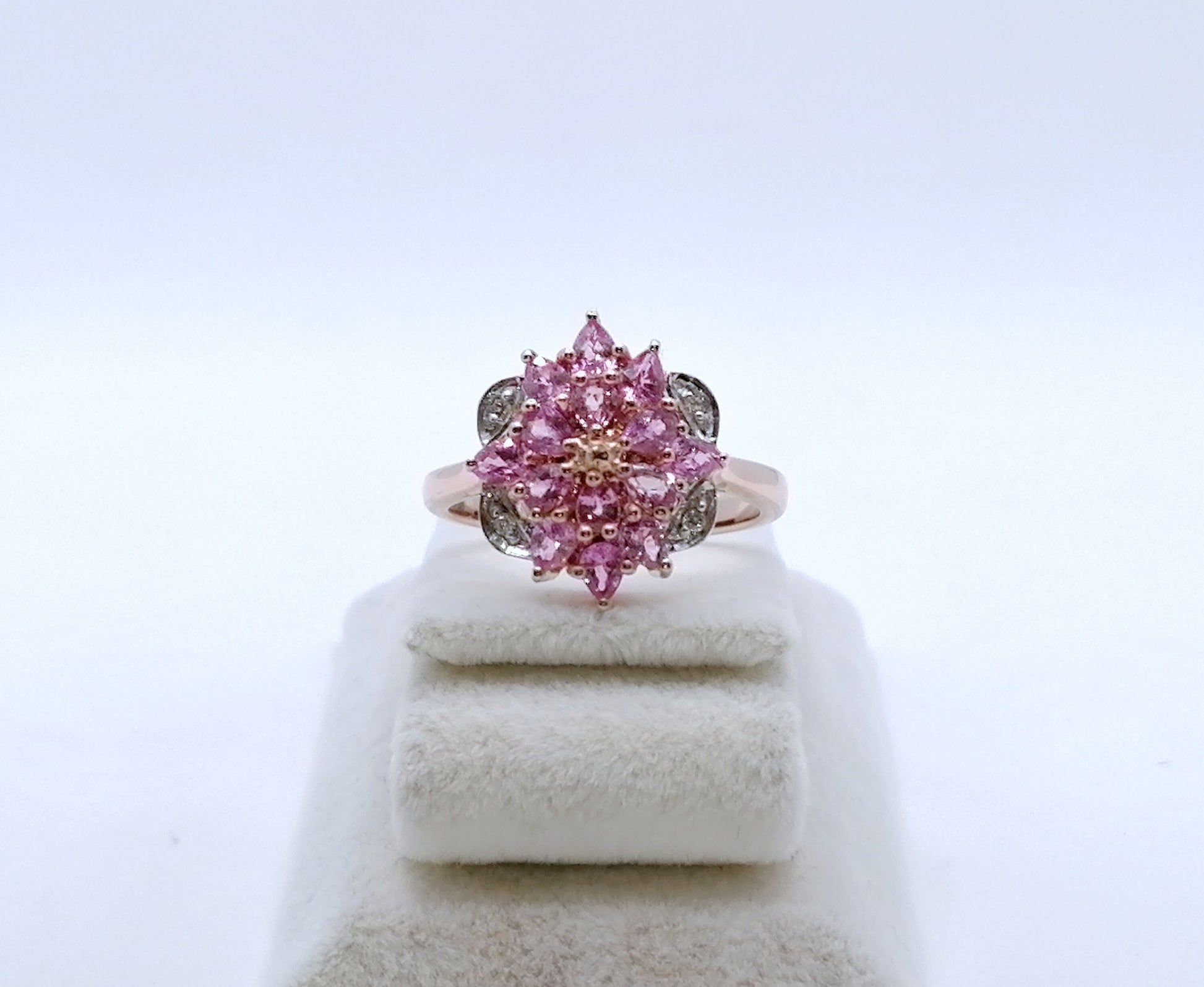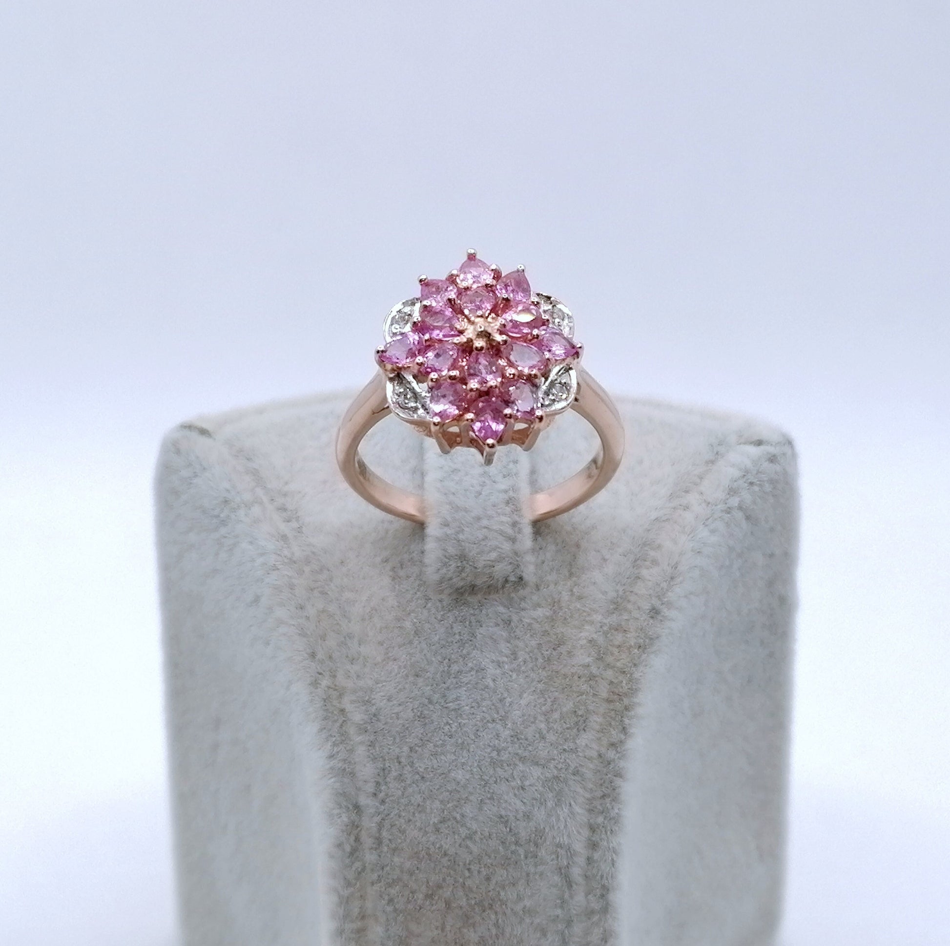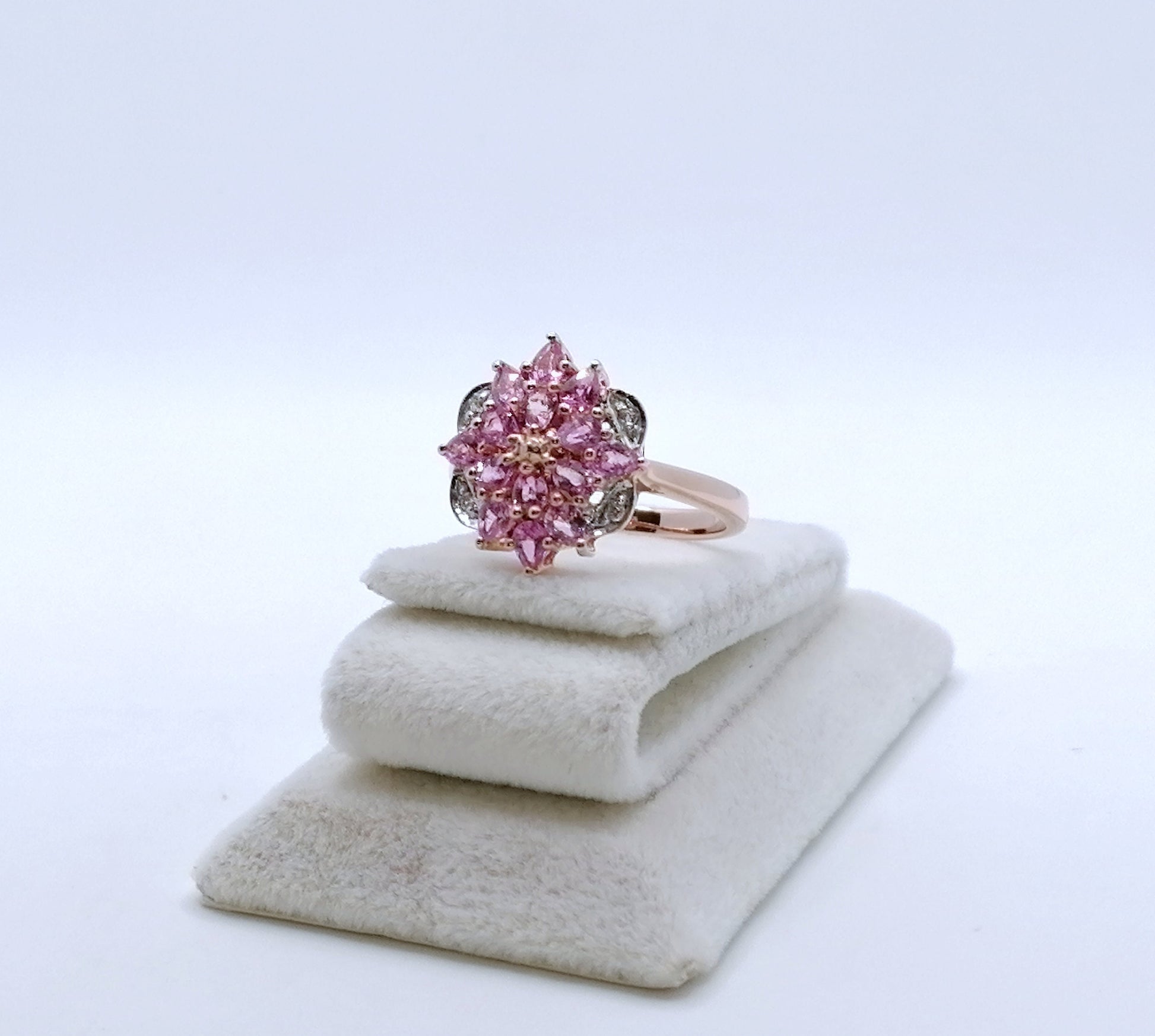 Damenring mit zahlreichen Pinken Saphir Edelsteinen und 4 funkelnden Zirkonen. Der Ring ist aus 925er vergoldetem Silber gefertigt.