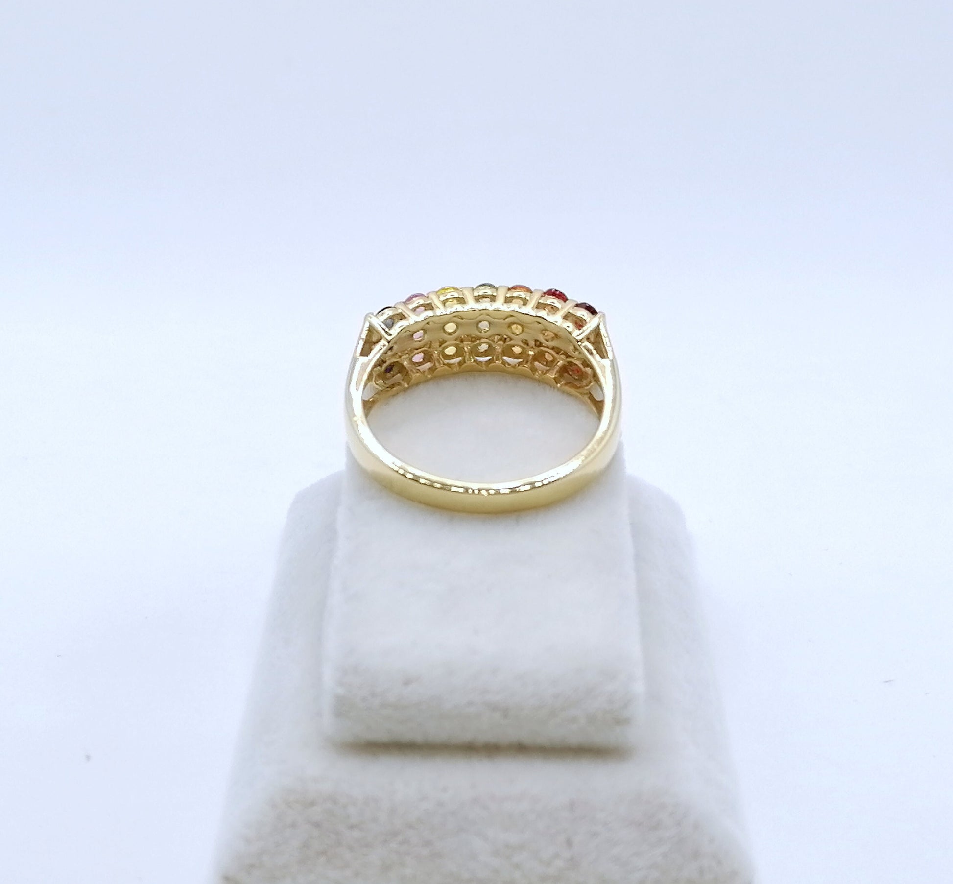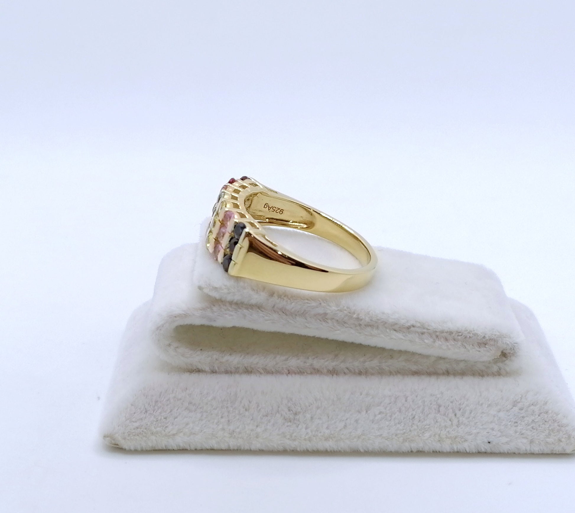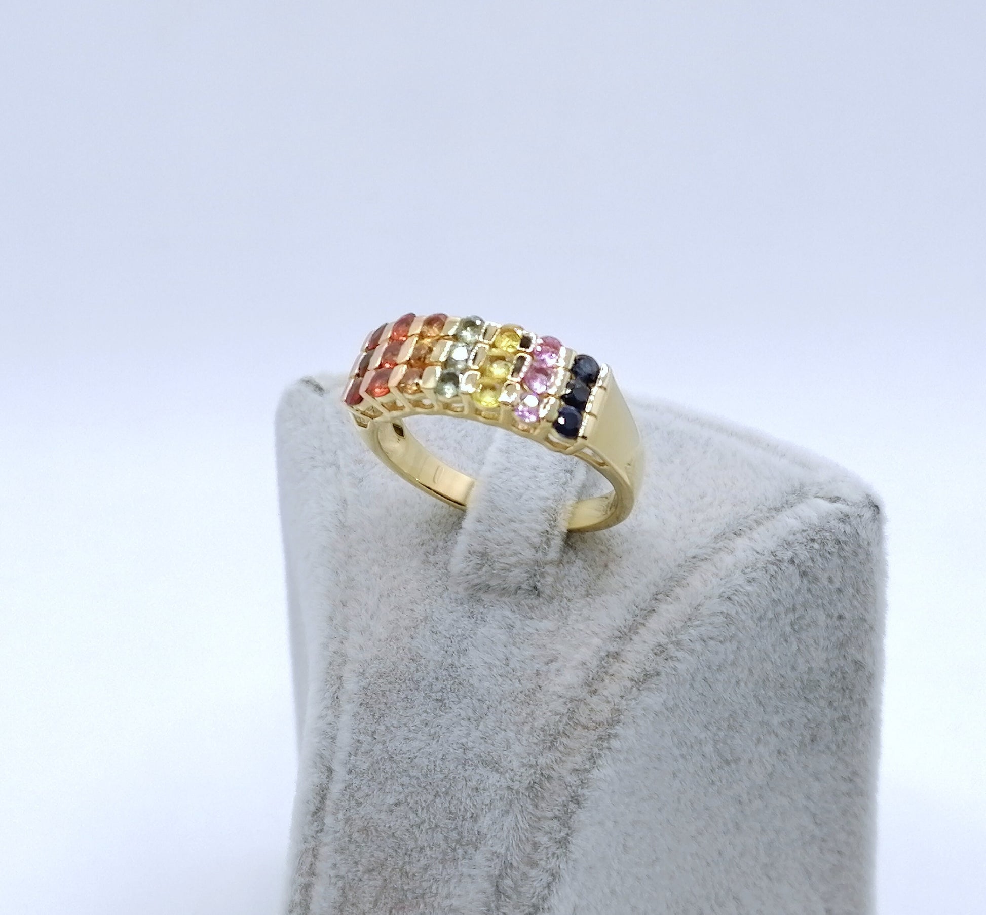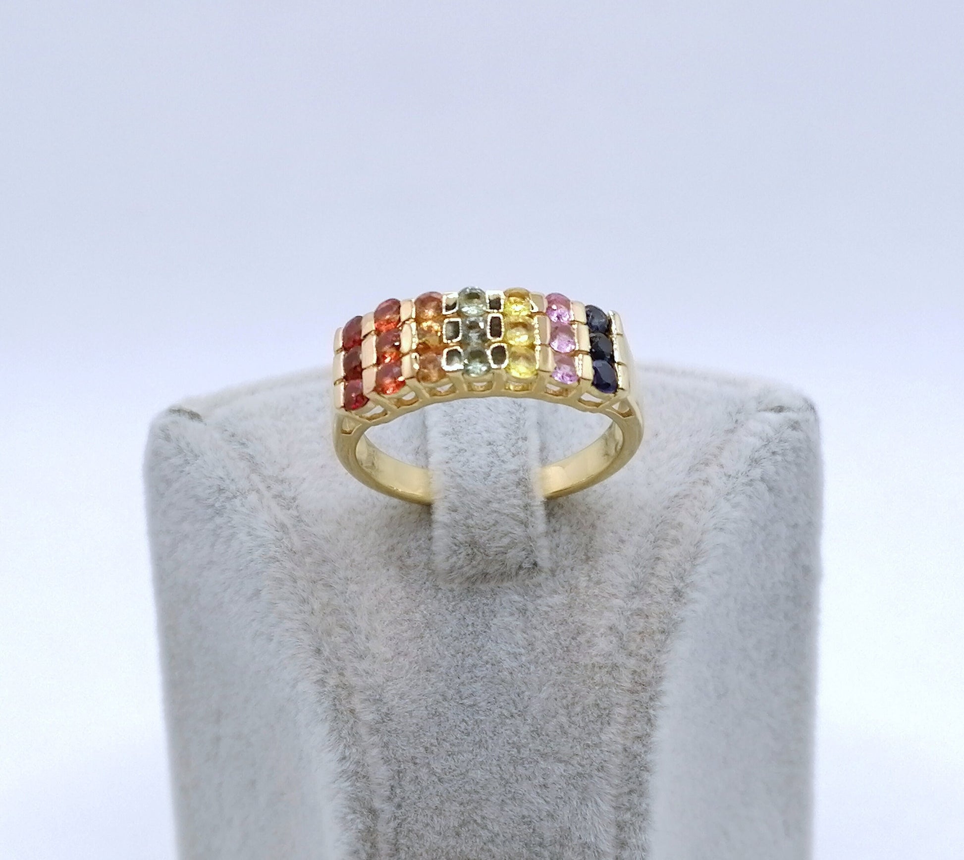 Neuwertiger Damenring mit farbigen Saphir Edelsteinen. Der Ring ist aus 925er vergoldetem Silber gefertigt.