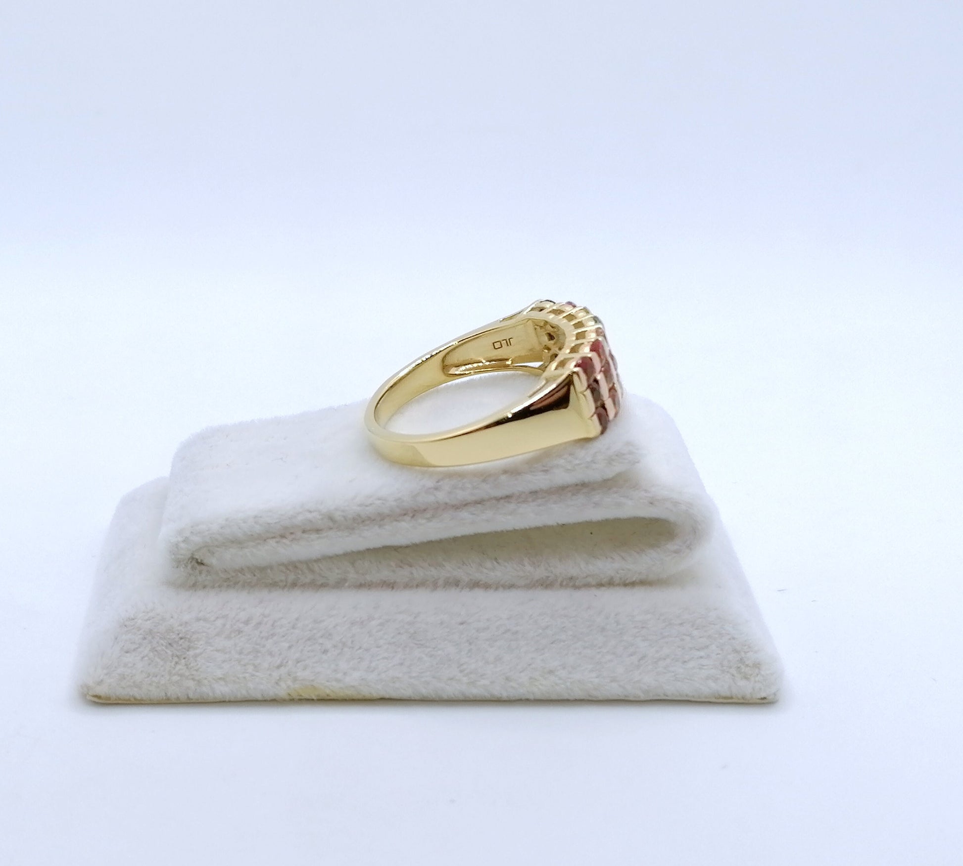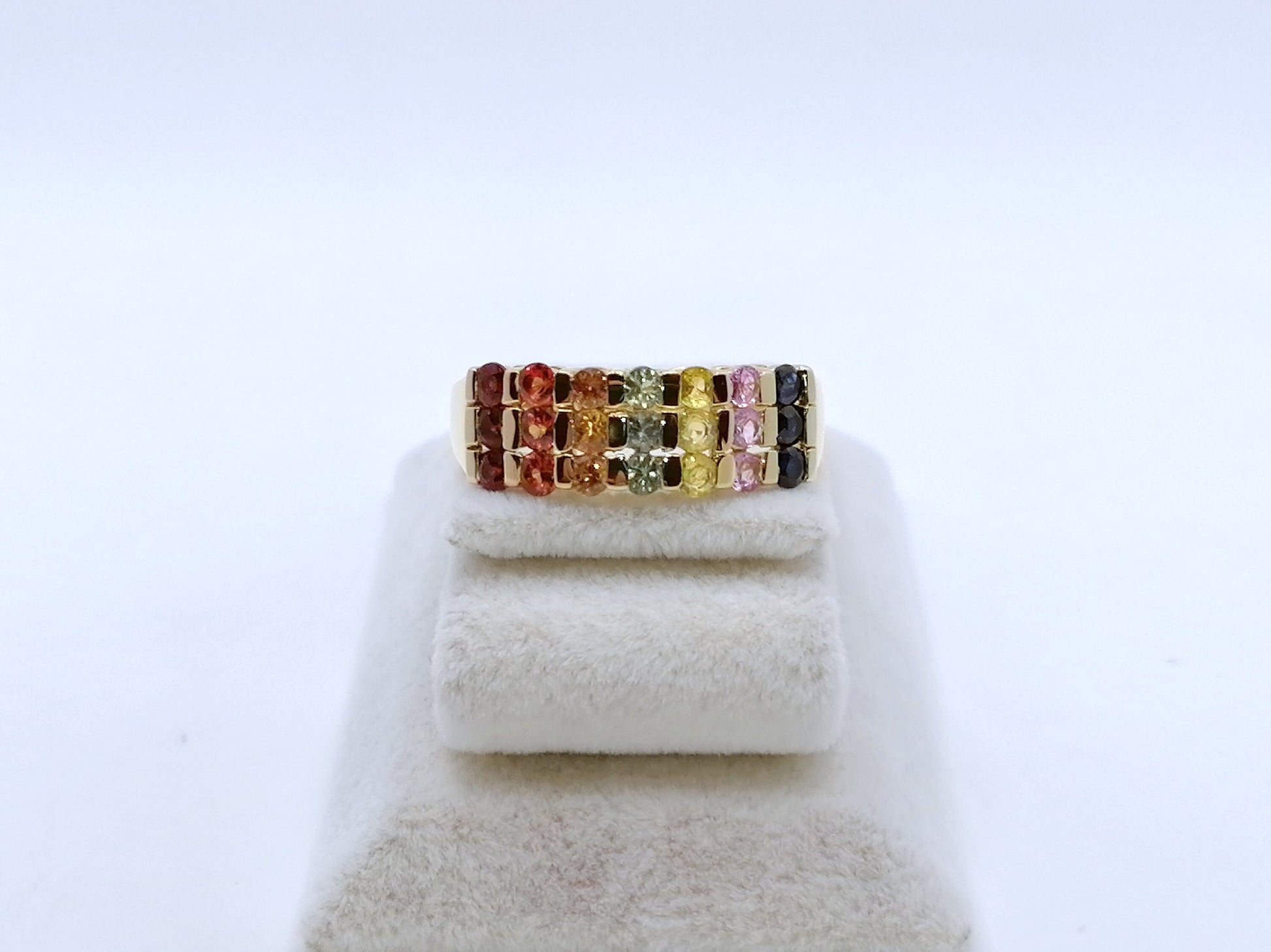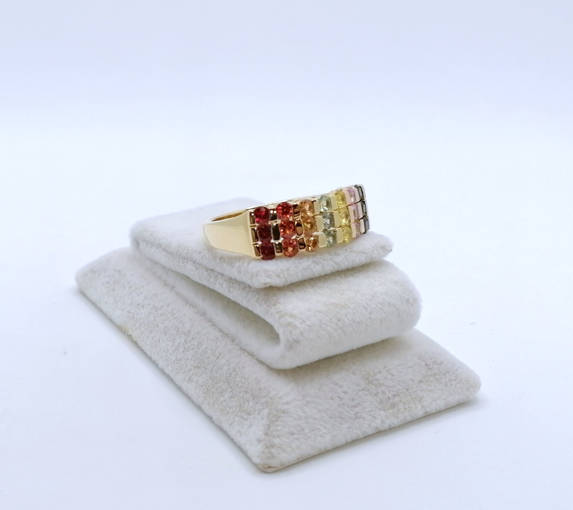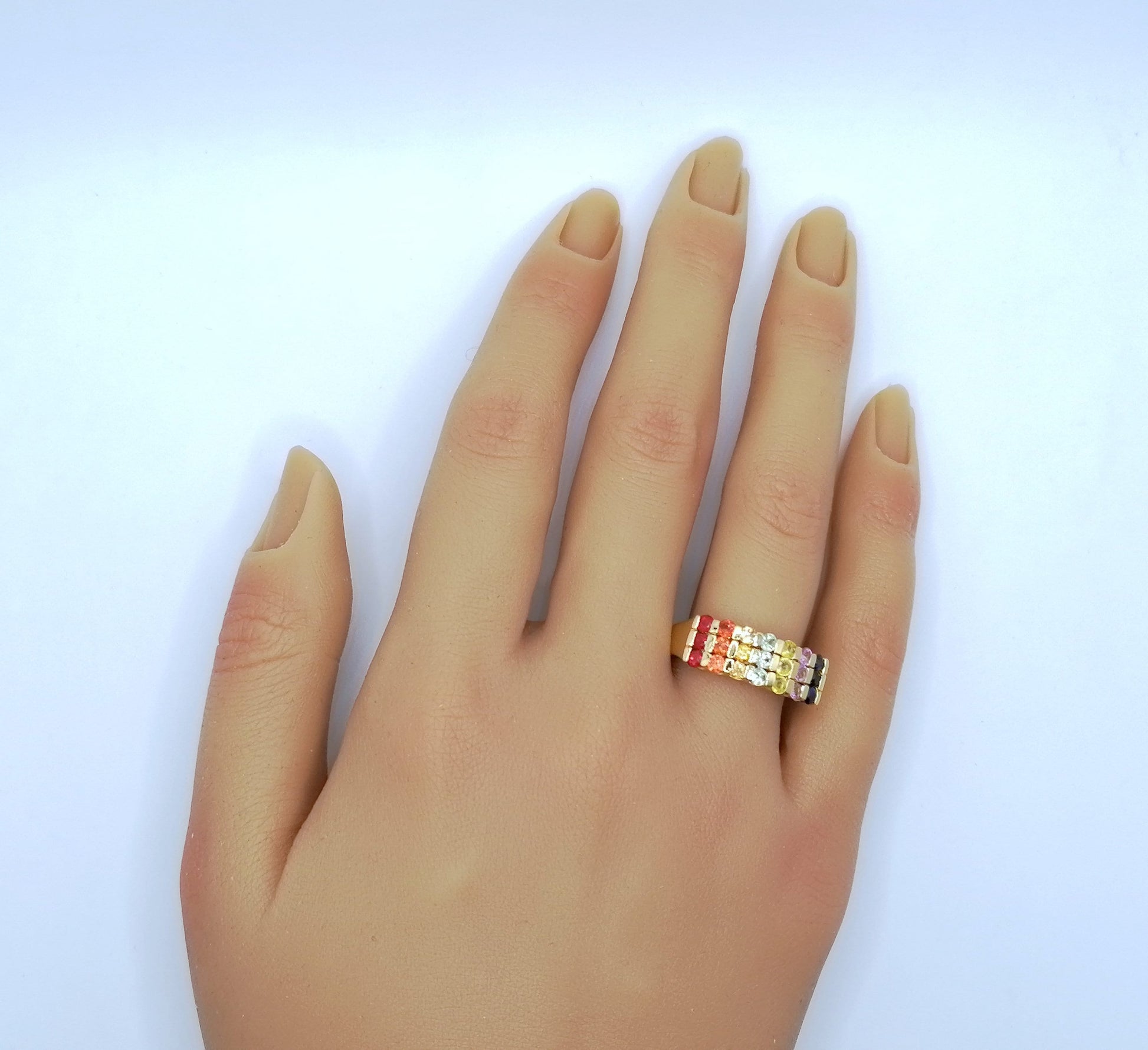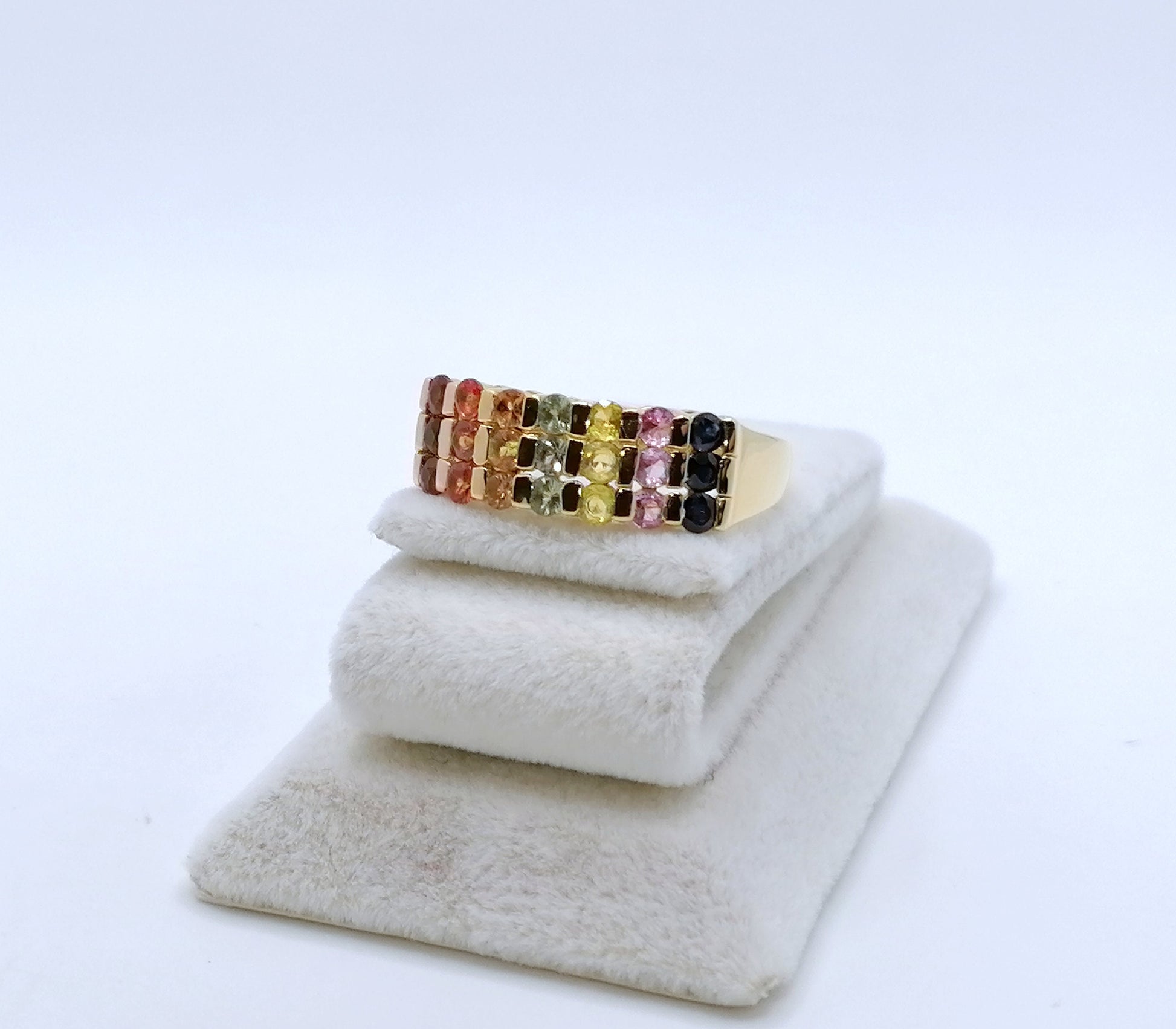 Neuwertiger Damenring mit farbigen Saphir Edelsteinen. Der Ring ist aus 925er vergoldetem Silber gefertigt.