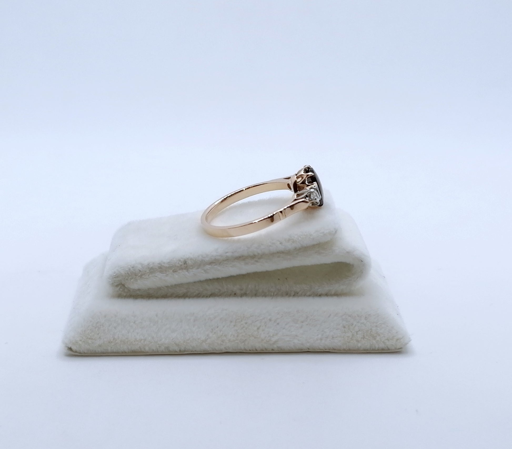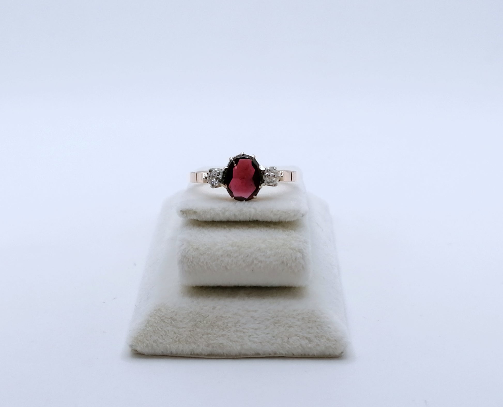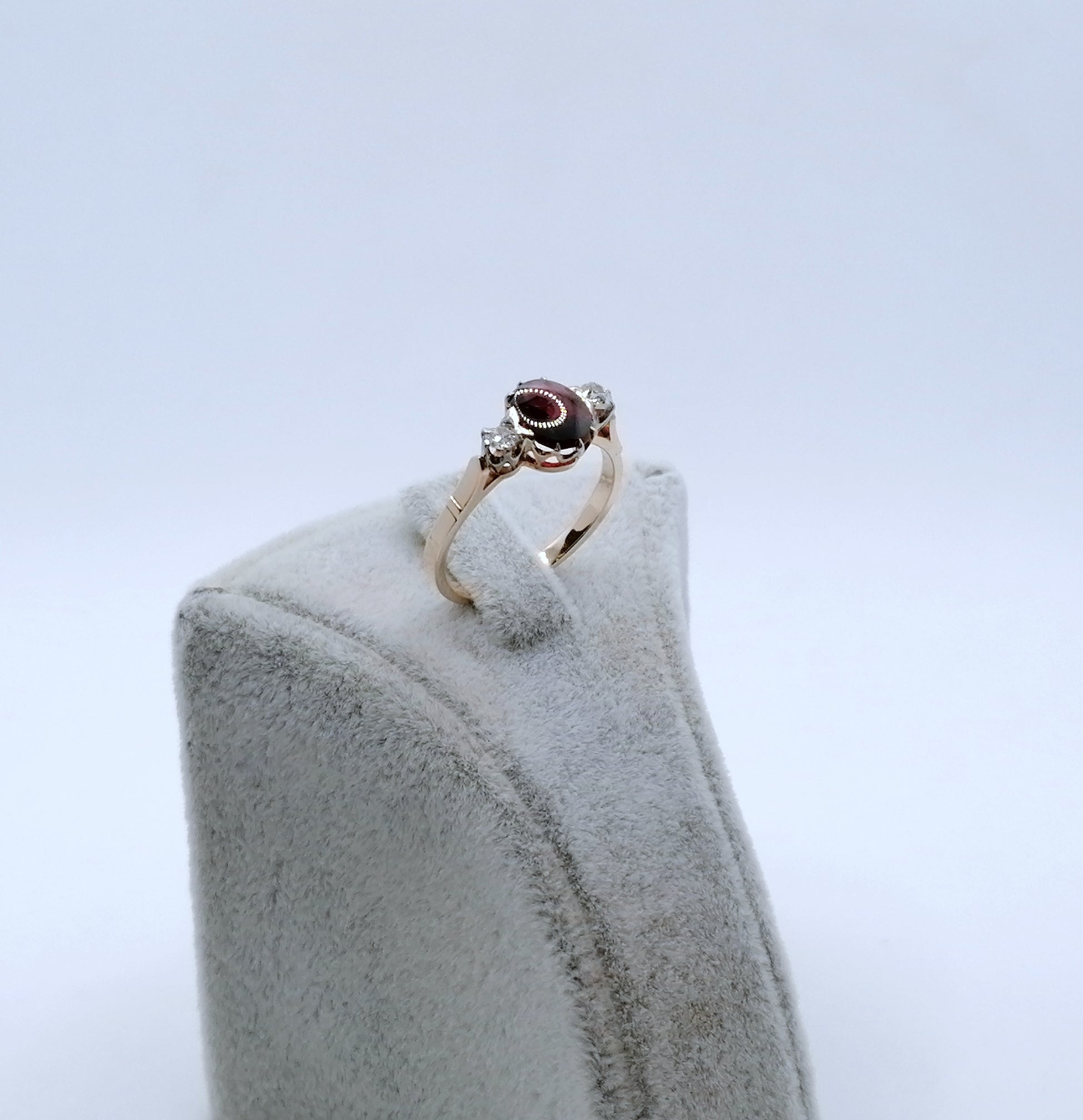UdSSR Rotgold Damenring aus 583er 14 karat Gold. Das Schmuckstück ist mit einem Granatstein Cabochon und 2 funkelnden Brillanten im Altschliff besetzt.