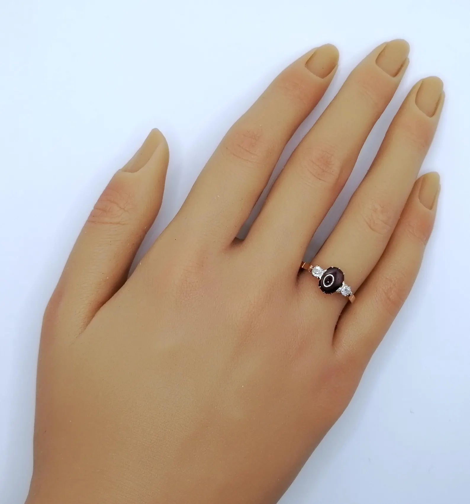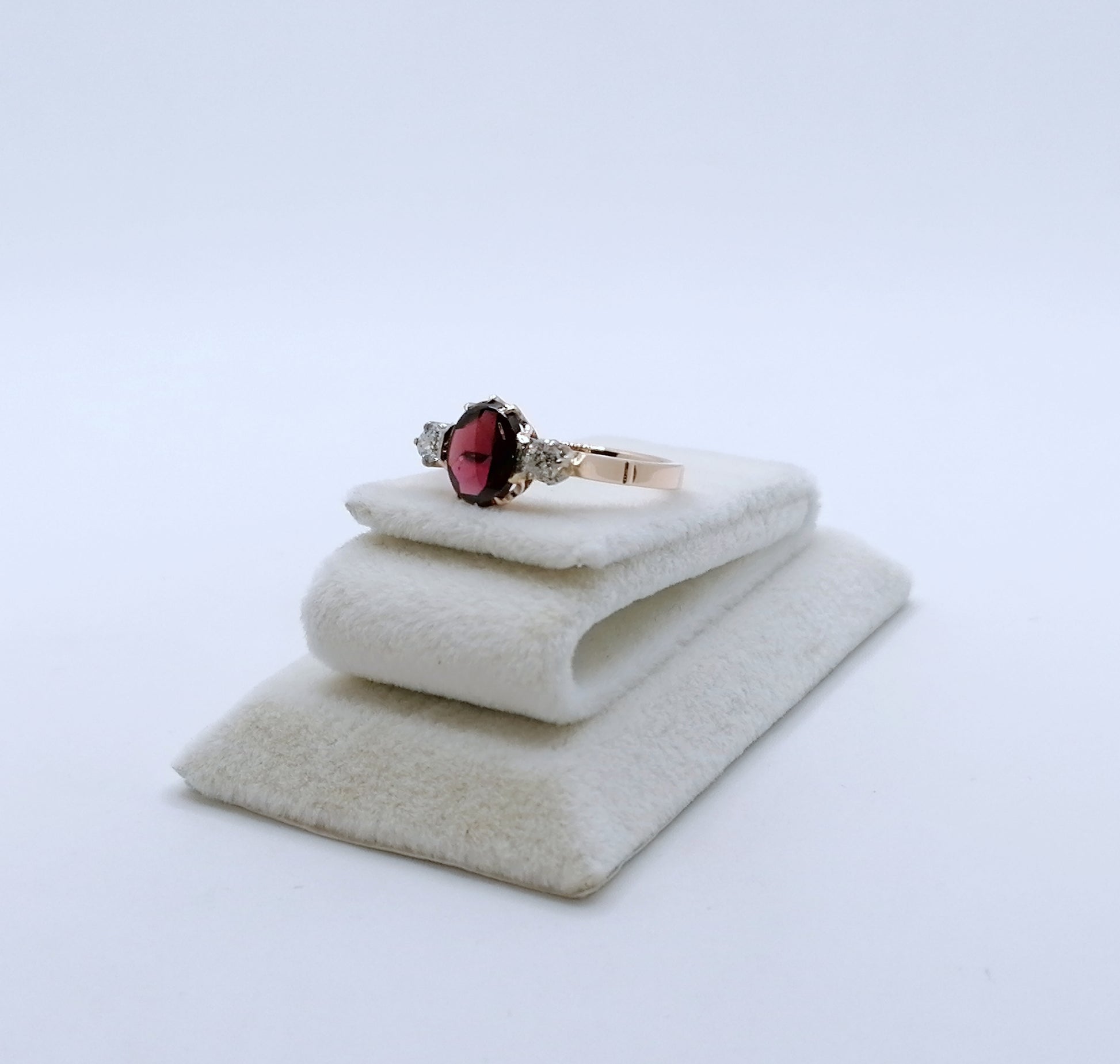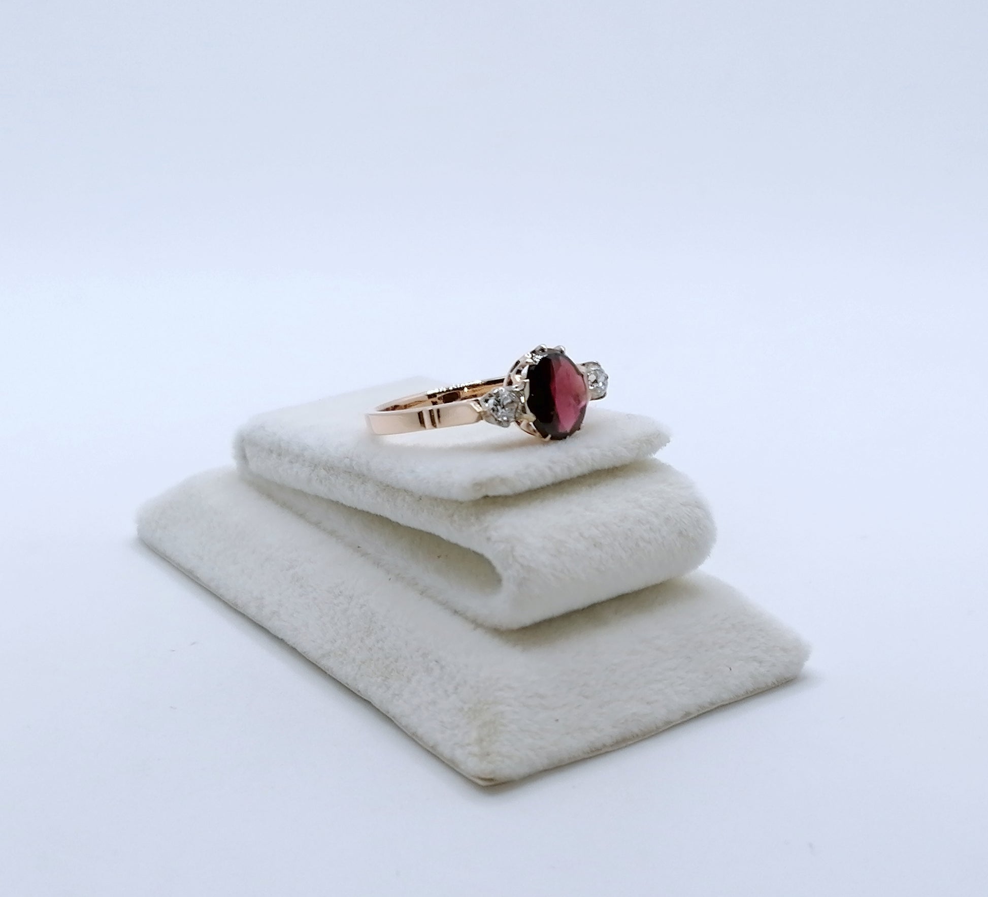 UdSSR Rotgold Damenring aus 583er 14 karat Gold. Das Schmuckstück ist mit einem Granatstein Cabochon und 2 funkelnden Brillanten im Altschliff besetzt.