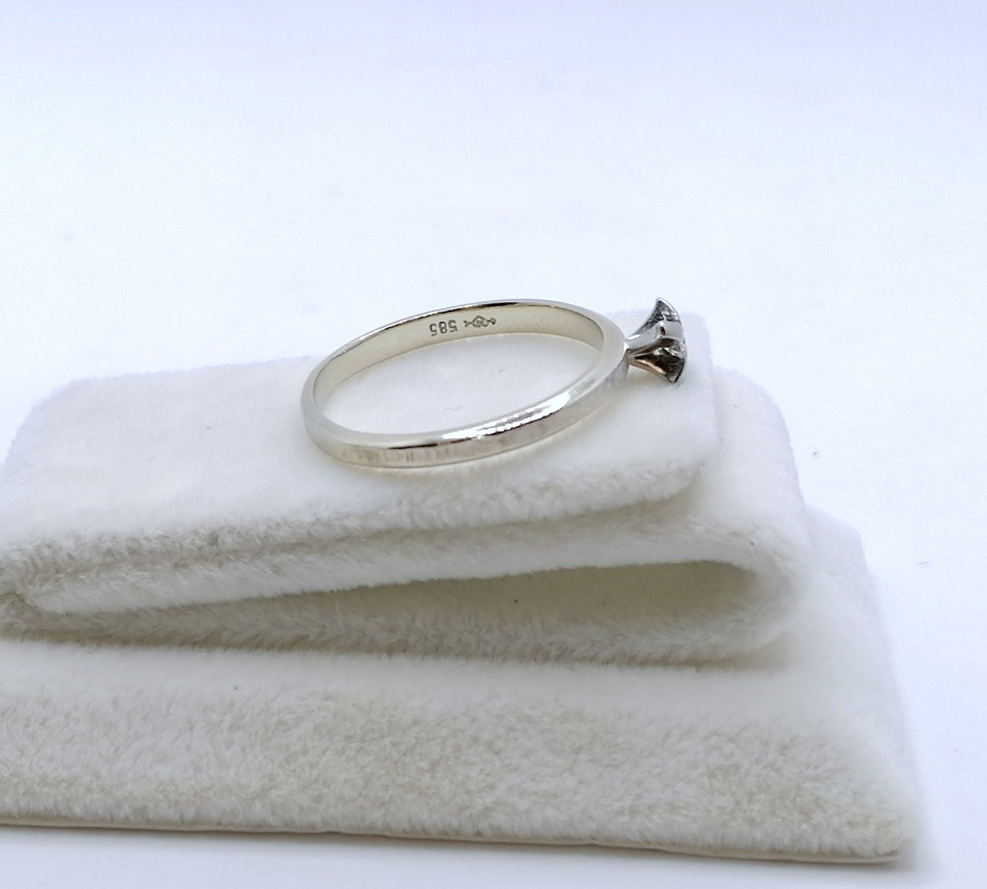 Absolut neuwertiger Solitär Goldring mit einem funkelnden Brillanten. Der Ring ist aus 585er 14 karat Weißgold gefertigt.