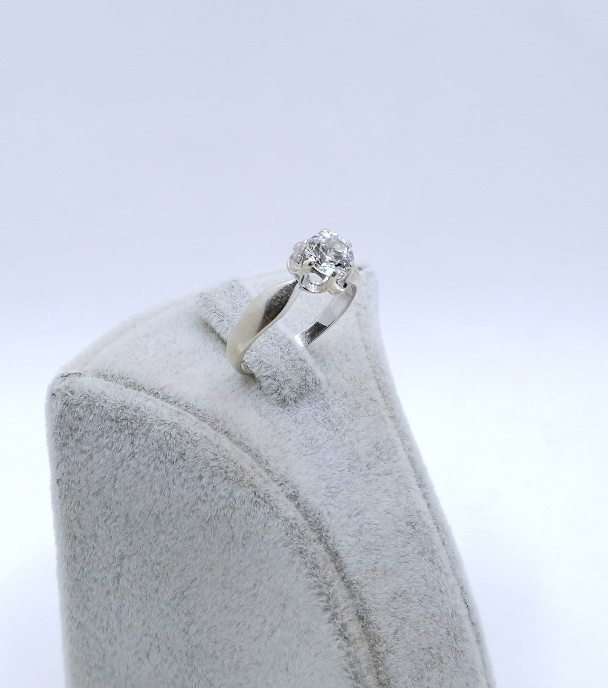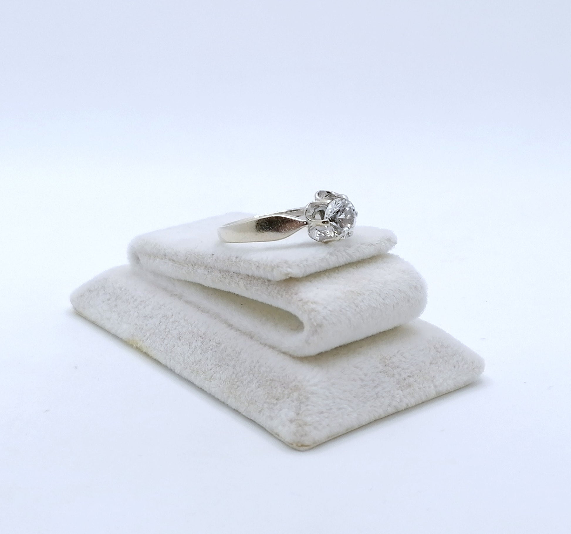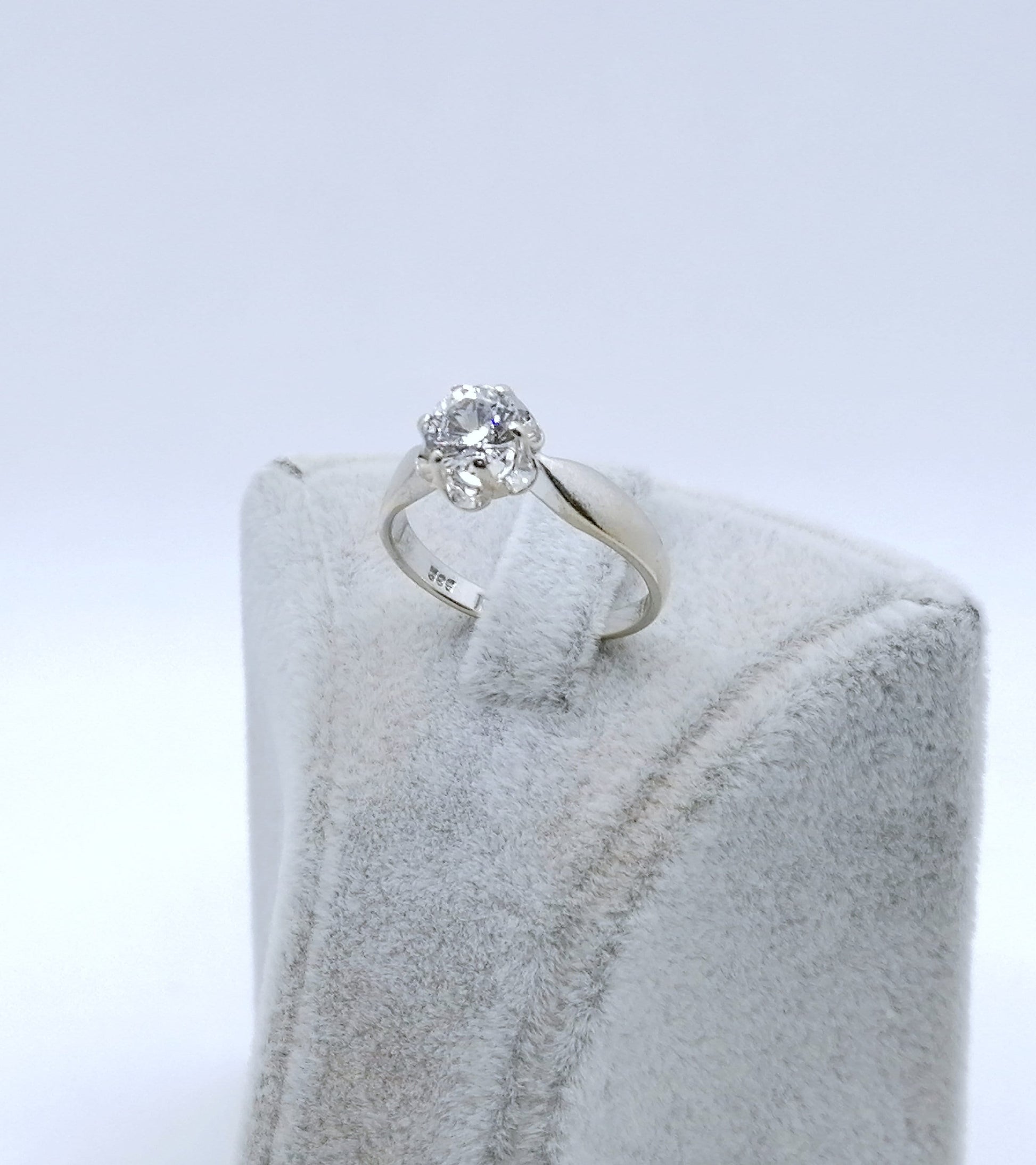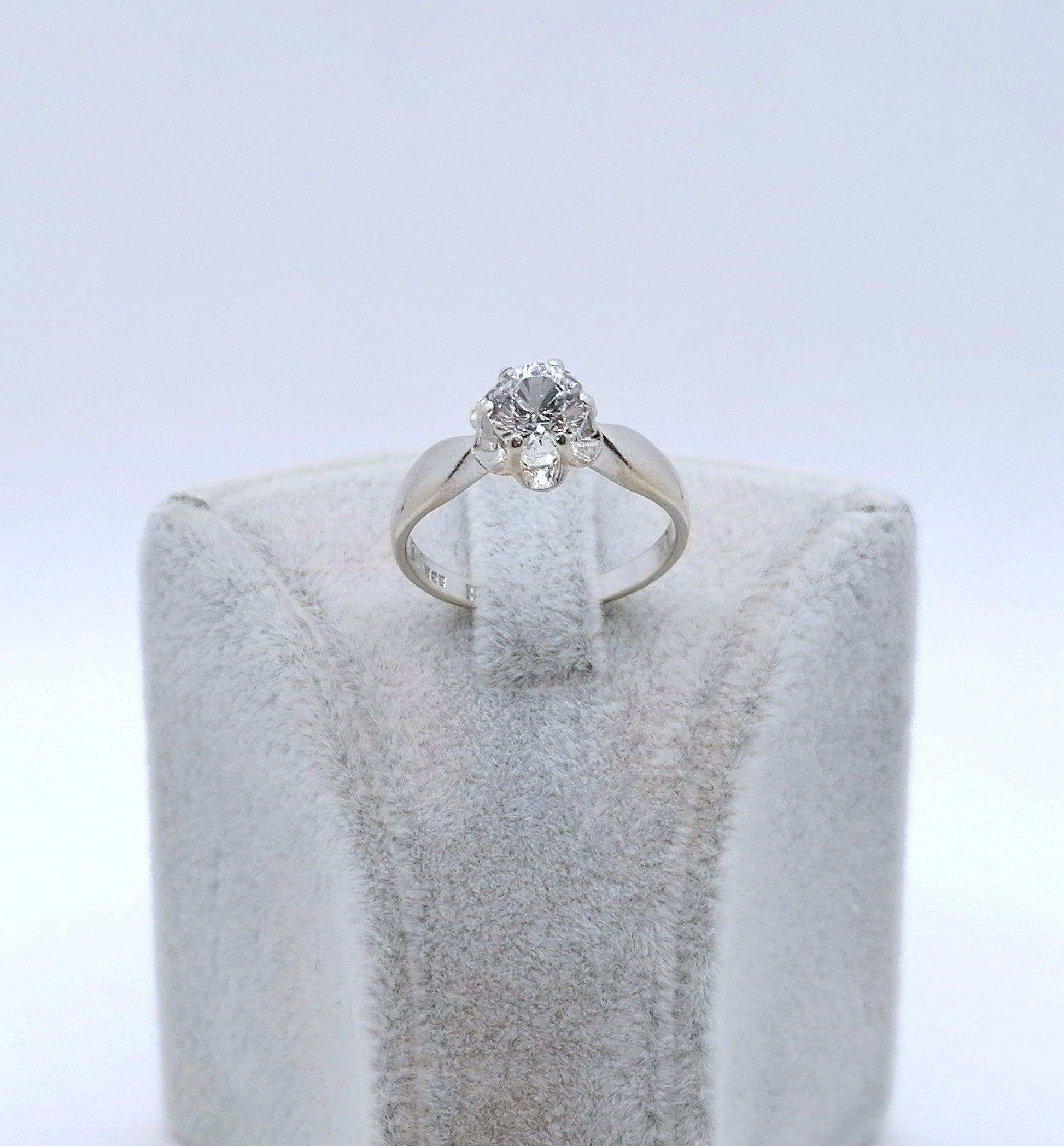 Vintage Solitär Goldring mit einem funkelnden Zirkonia. Der Ring ist aus 585er 14 karat Weißgold gefertigt.