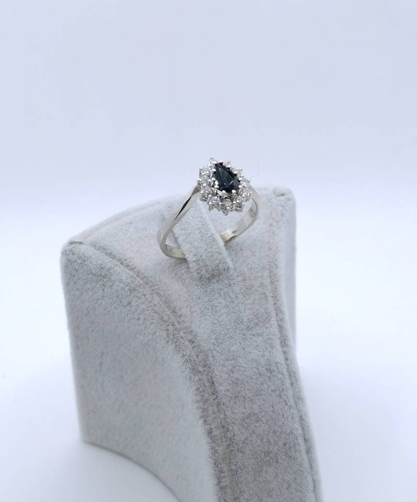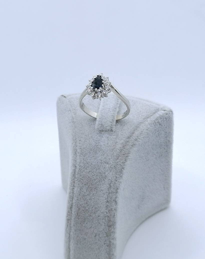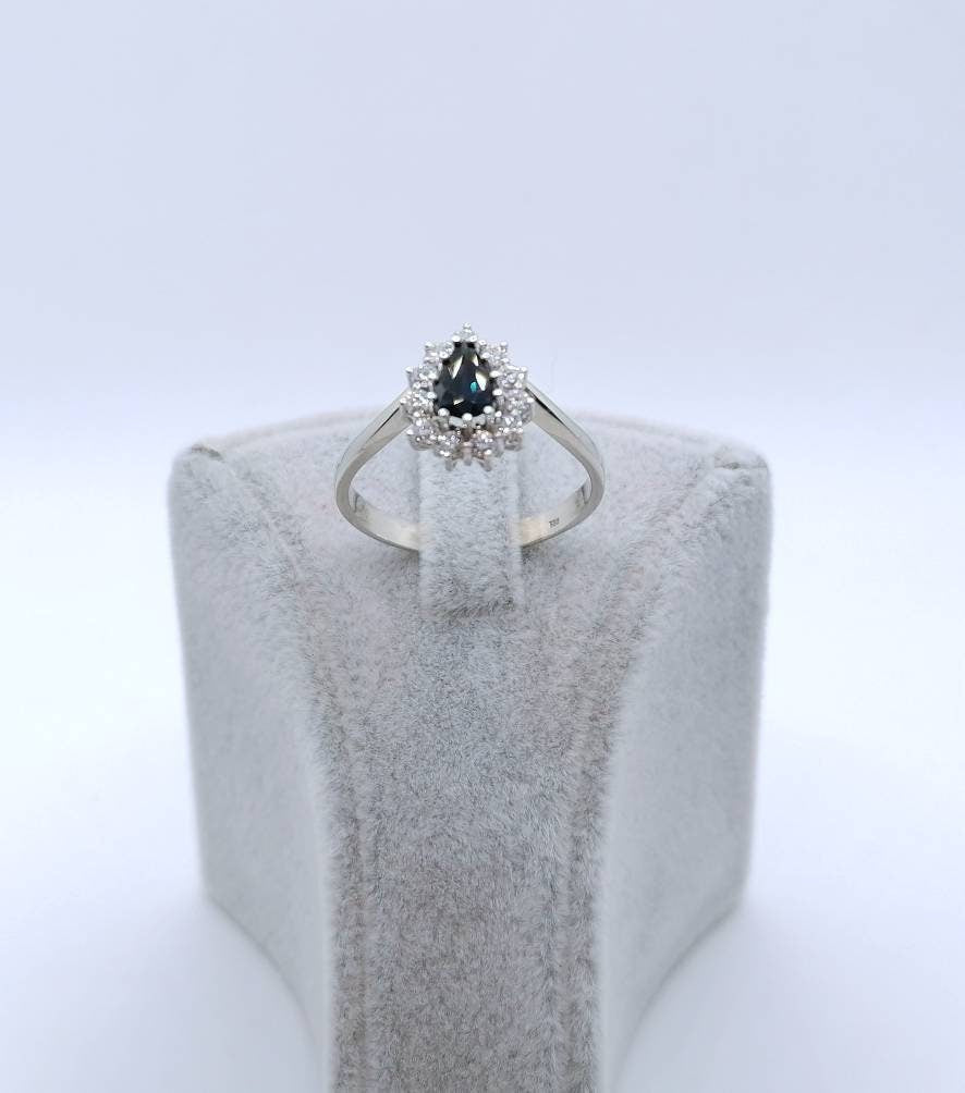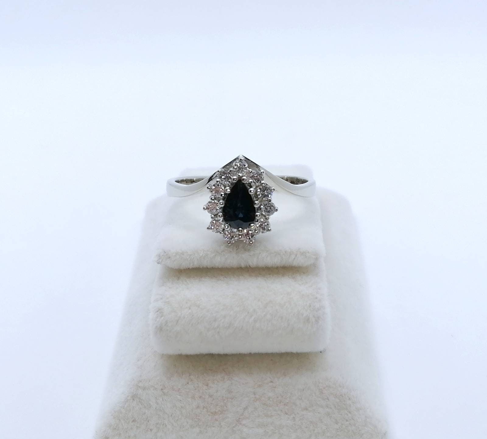 Ein traumhafter Gold Damenring mit einem tropfenförmigen Saphir Edelstein inmitten von zahlreichen funkelnden Brillanten. Der Ring ist aus 585er 14 Karat Weißgold gefertigt.