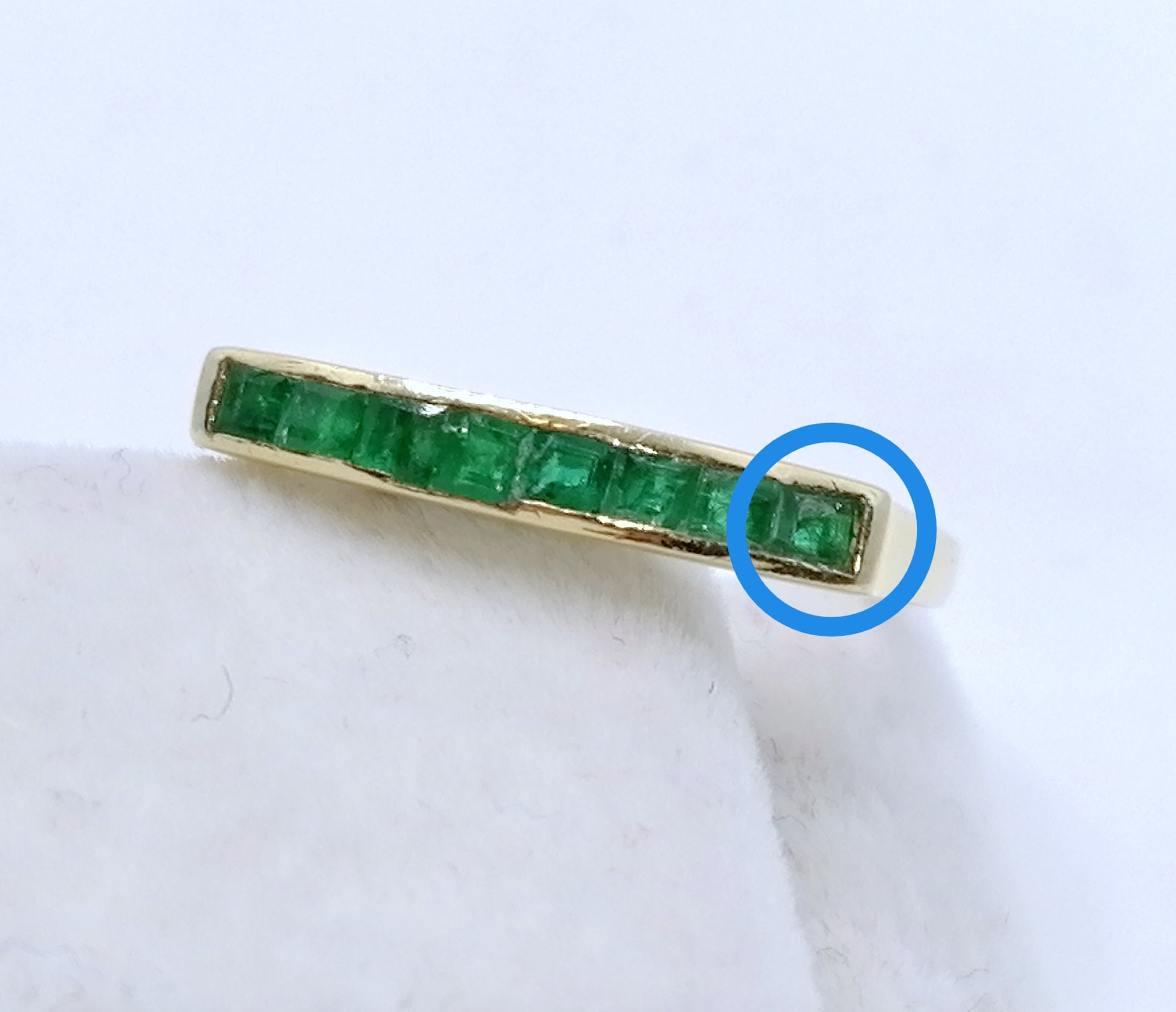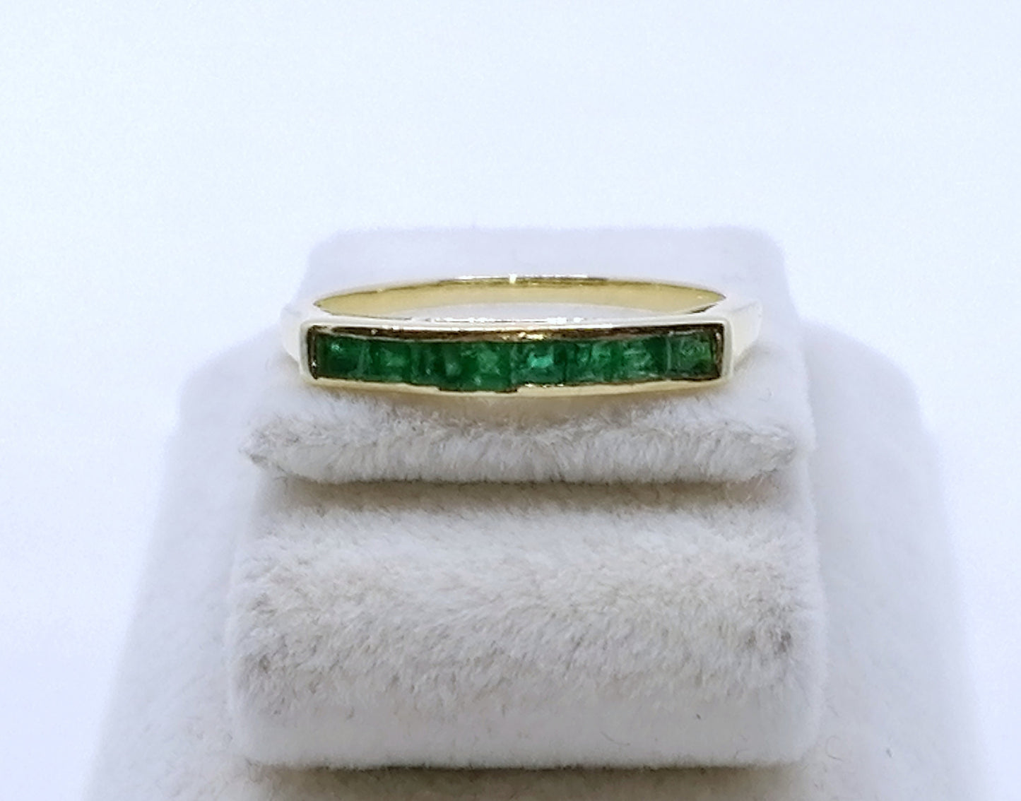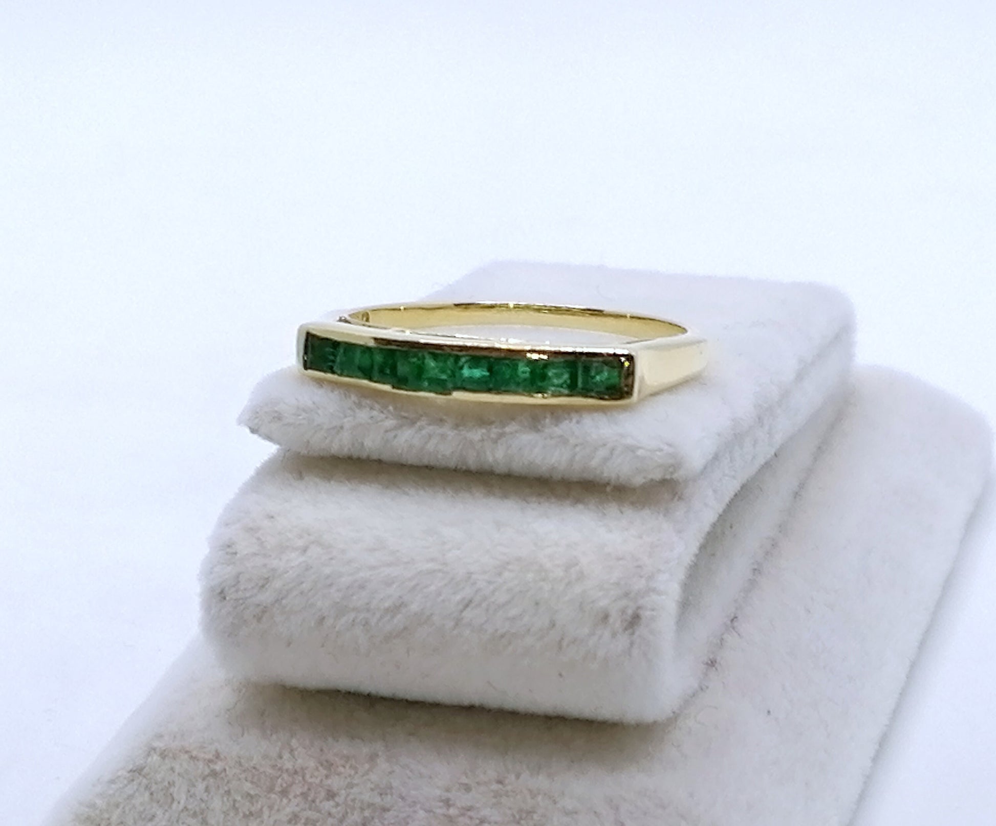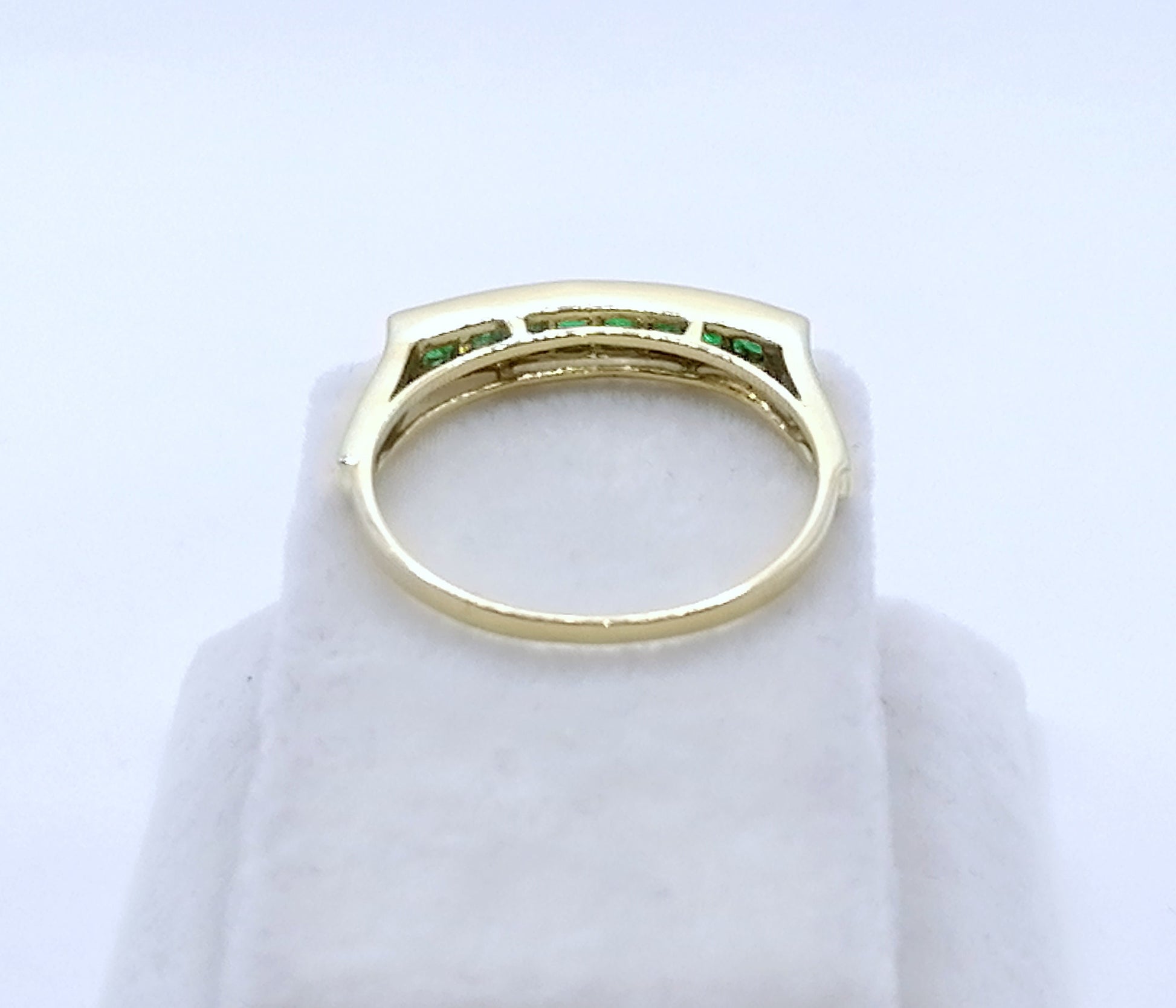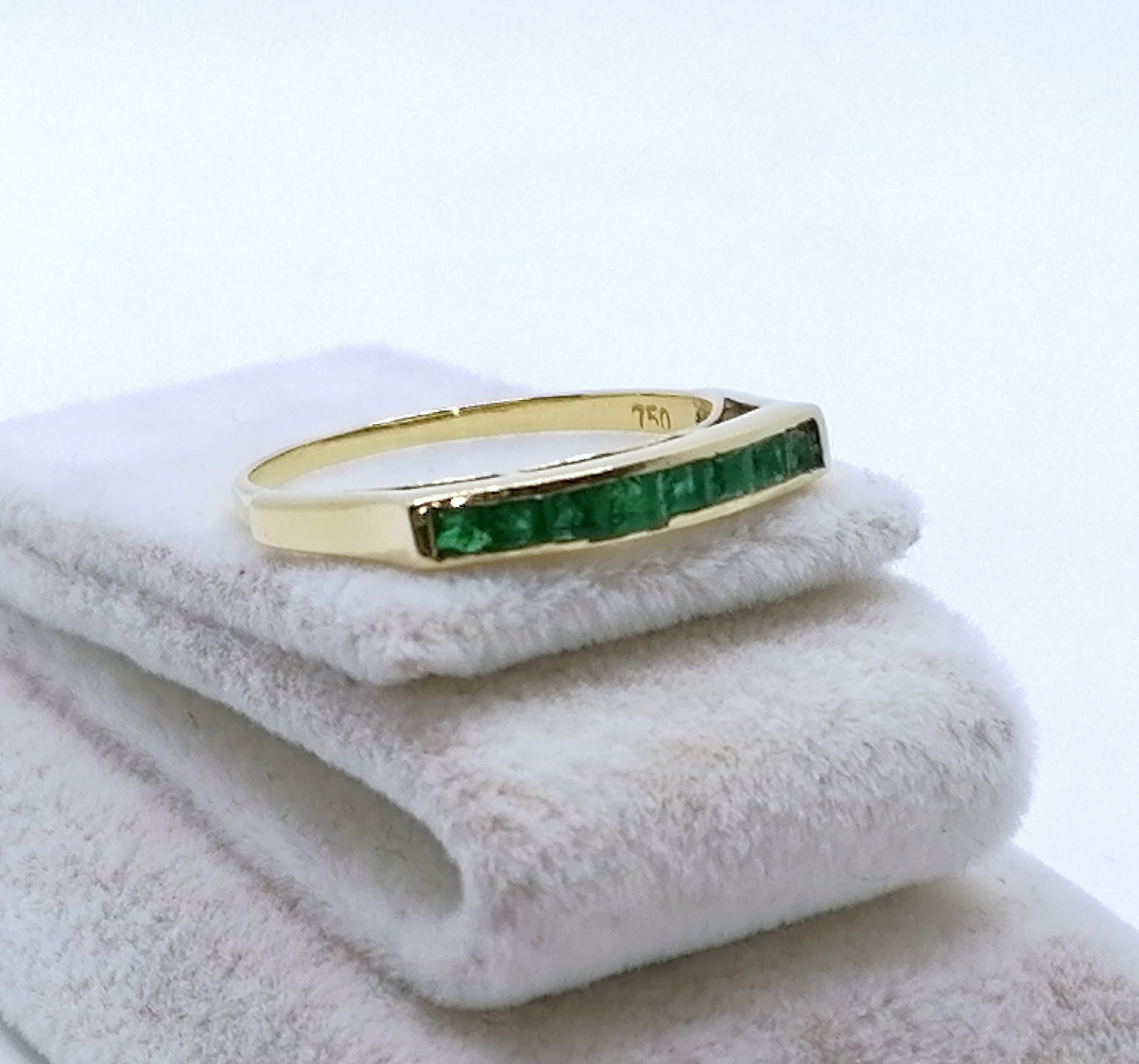Schlichter Gold Damenring mit Smaragd Baguette. Der Ring ist aus 750er 18 Karat Gold gefertigt. Bitte auf Bild zwei beachten, dass einer der Baguettes beschädigt ist. Ansonsten ist der Ring in einem neuwertigen Zustand.