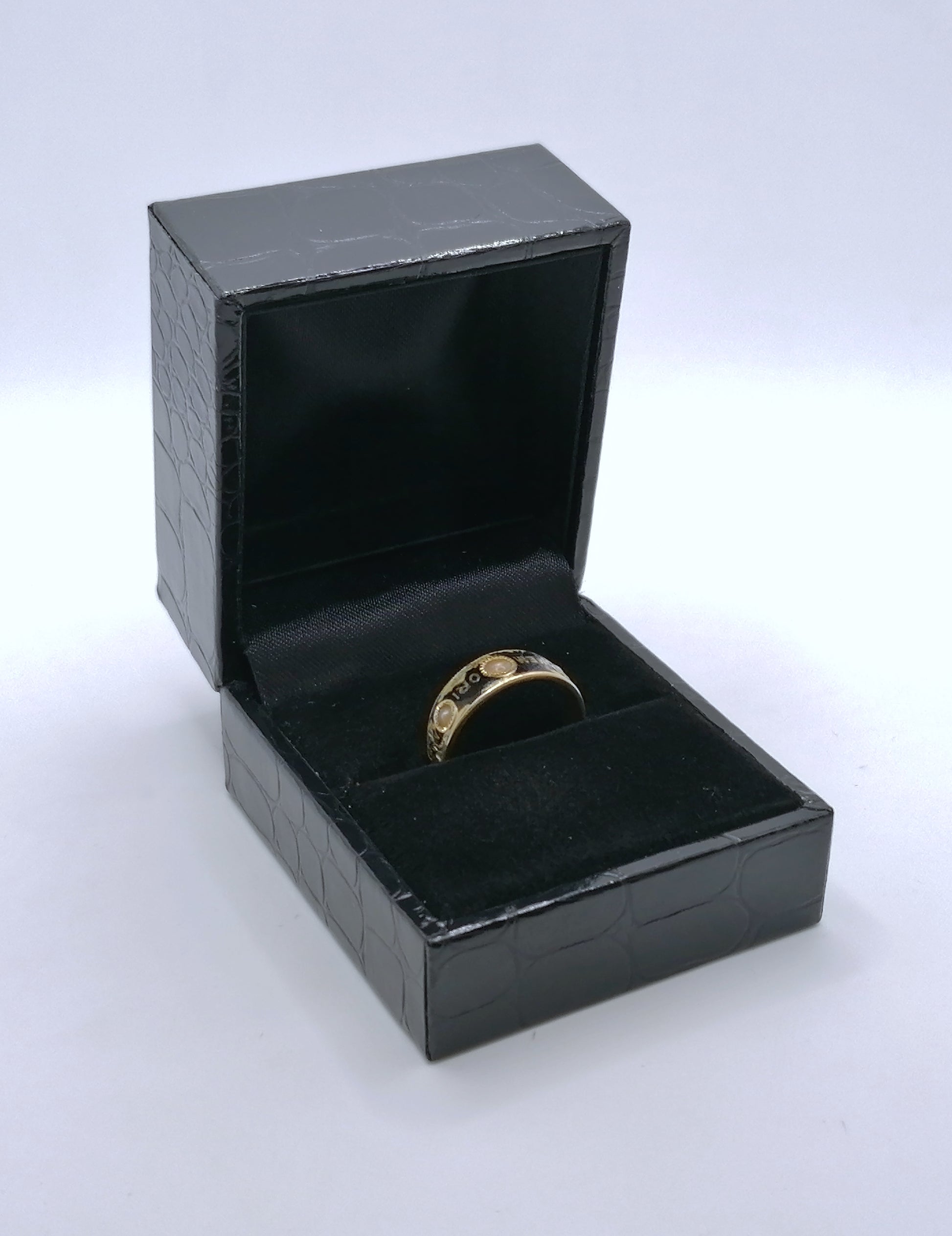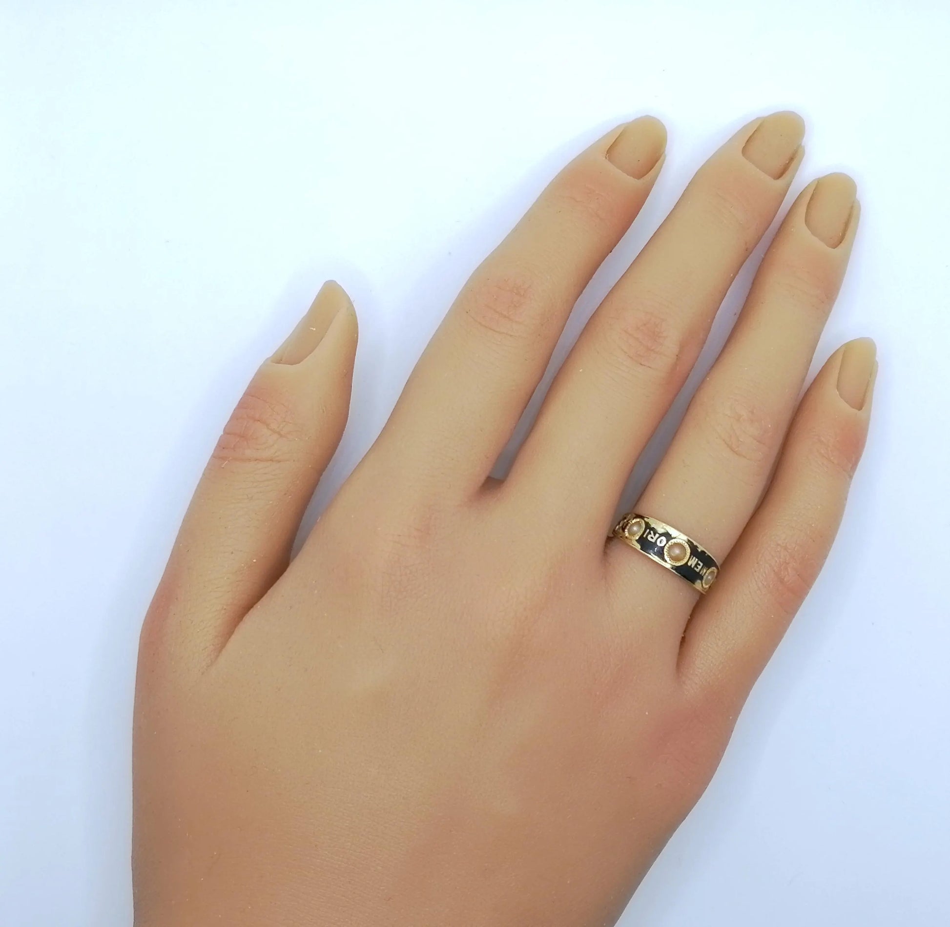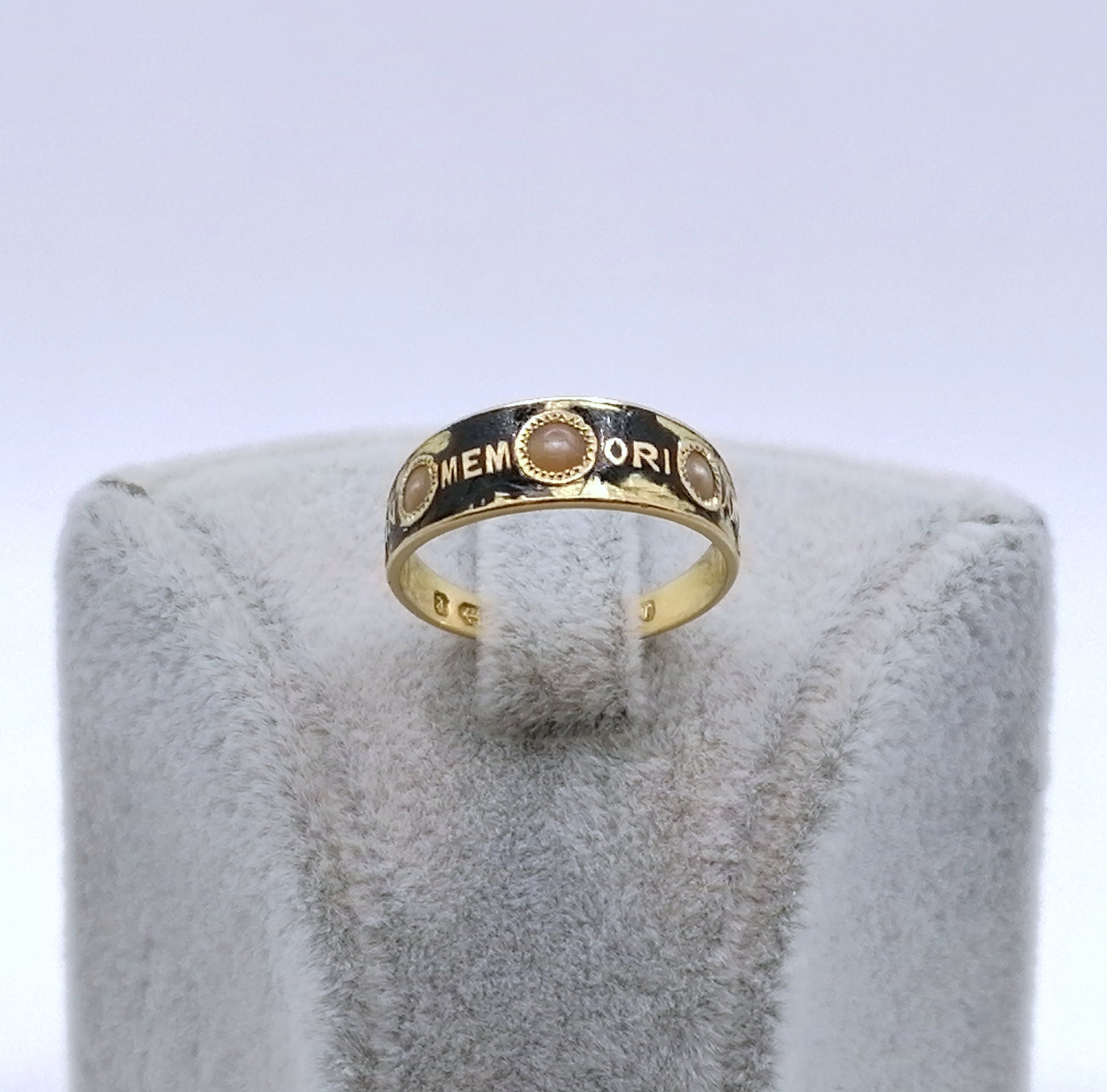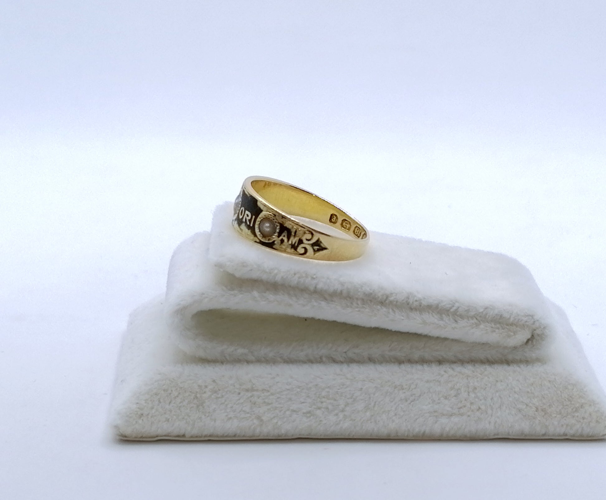 Viktorianischer Gold Damenring mit feinen Barockperlen und schwarzer Emaille. Geschmiedet wurde das Schmuckstück um 1875 in England (Birmingham) und besteht aus 750er 18 Karat Gold.
