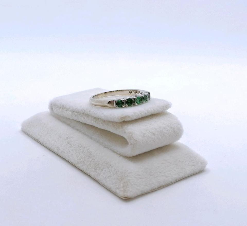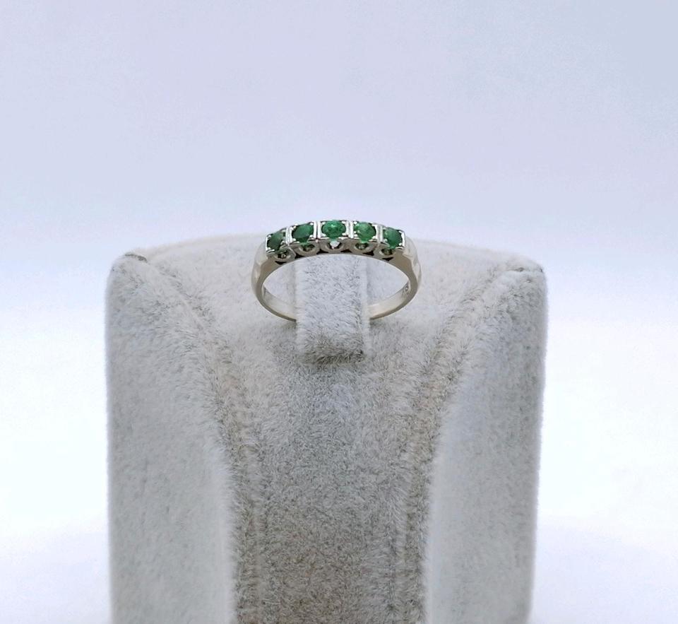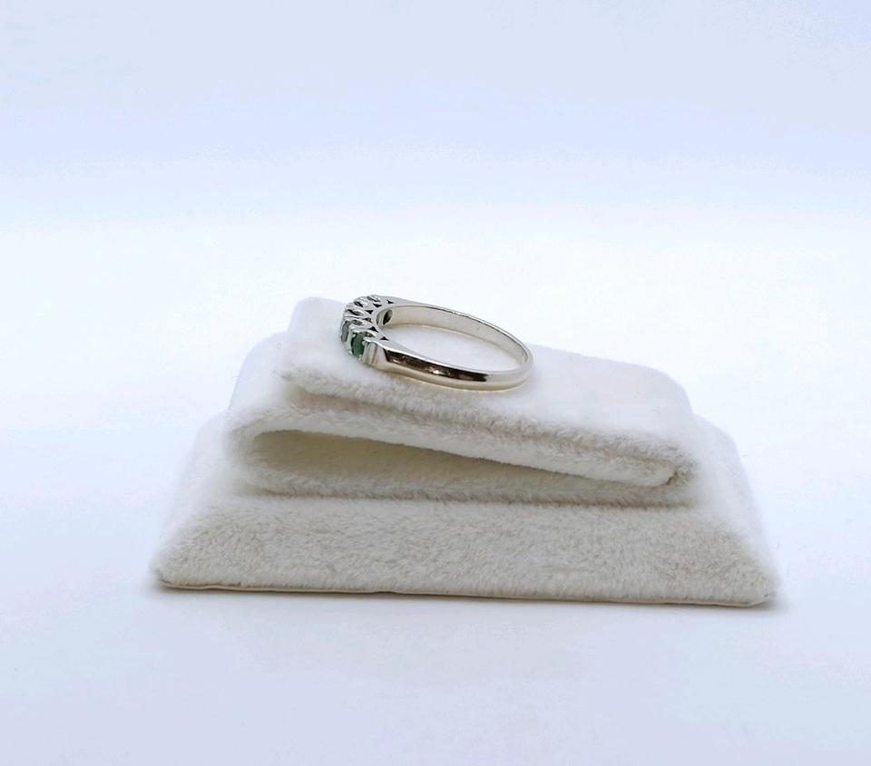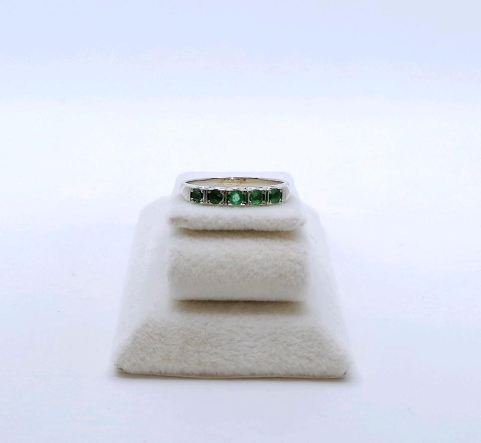 Vintage Gold Damenring mit Smaragd Edelsteinen. Das Schmuckstück ist aus 585er 14 karat Weißgold gefertigt.